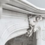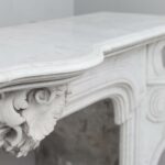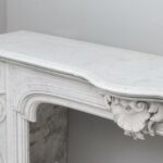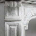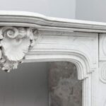 A beautiful antique fireplace with rich details and a wide profiled top. This full circulation fireplace is made of “Carrara”, a very luxurious type of marble.