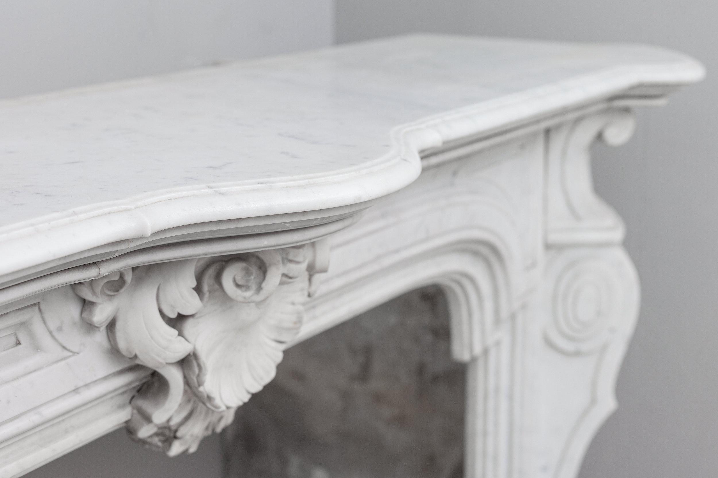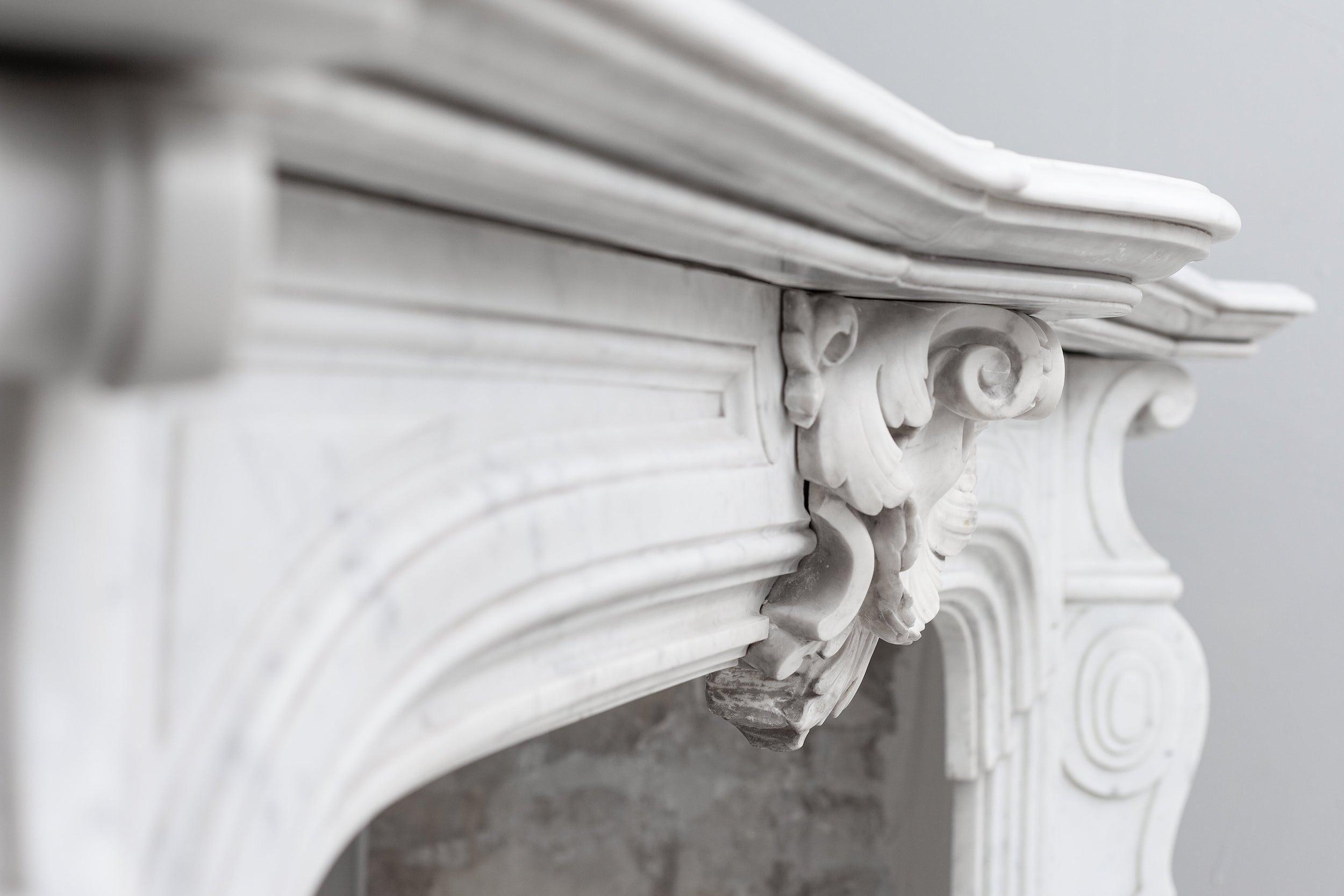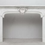 A sumptuous scallop (shell) stands out in the center of the fireplace. Placed at 30 degrees from the corners are fully solid consoles with filled fluting.