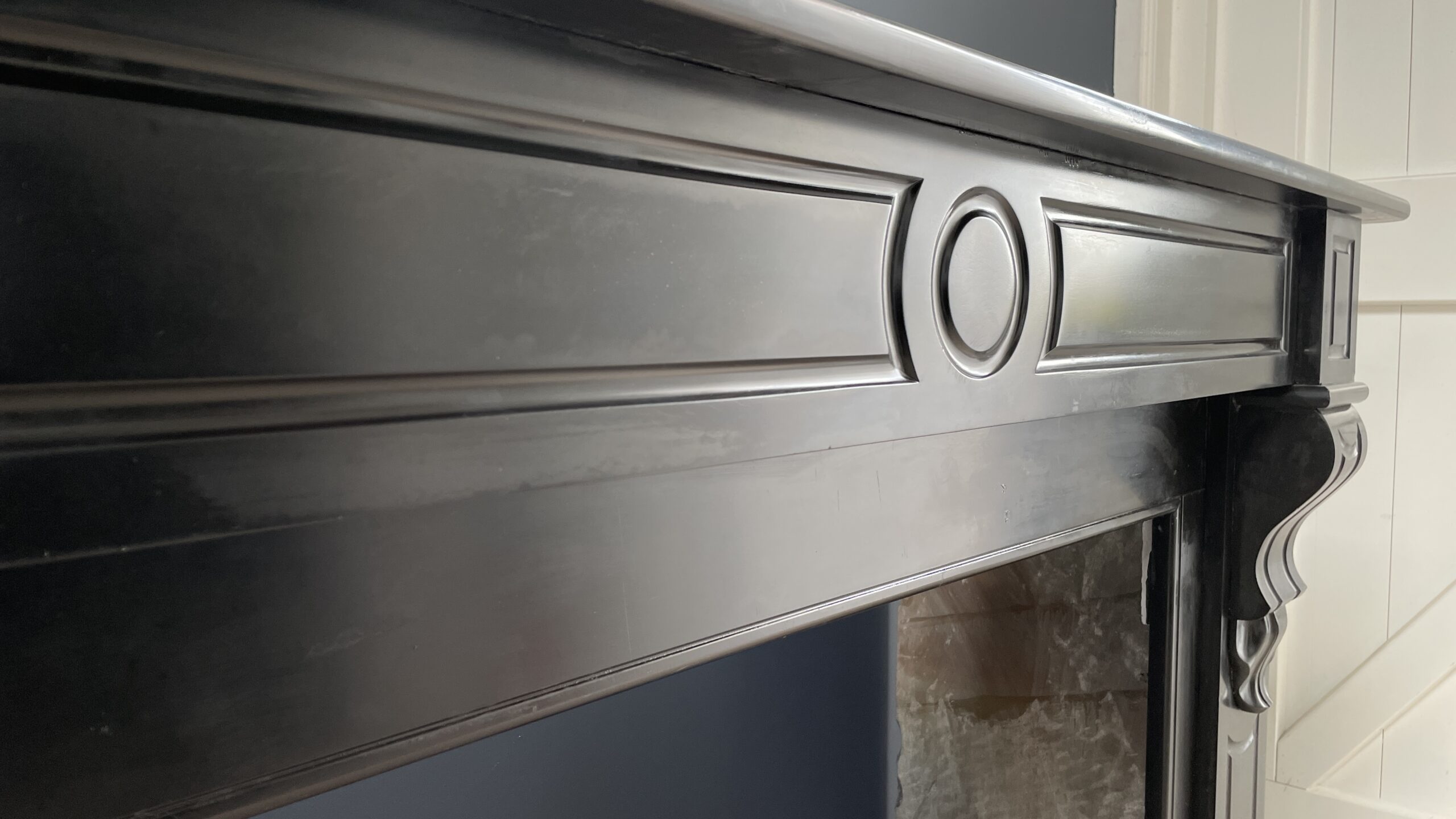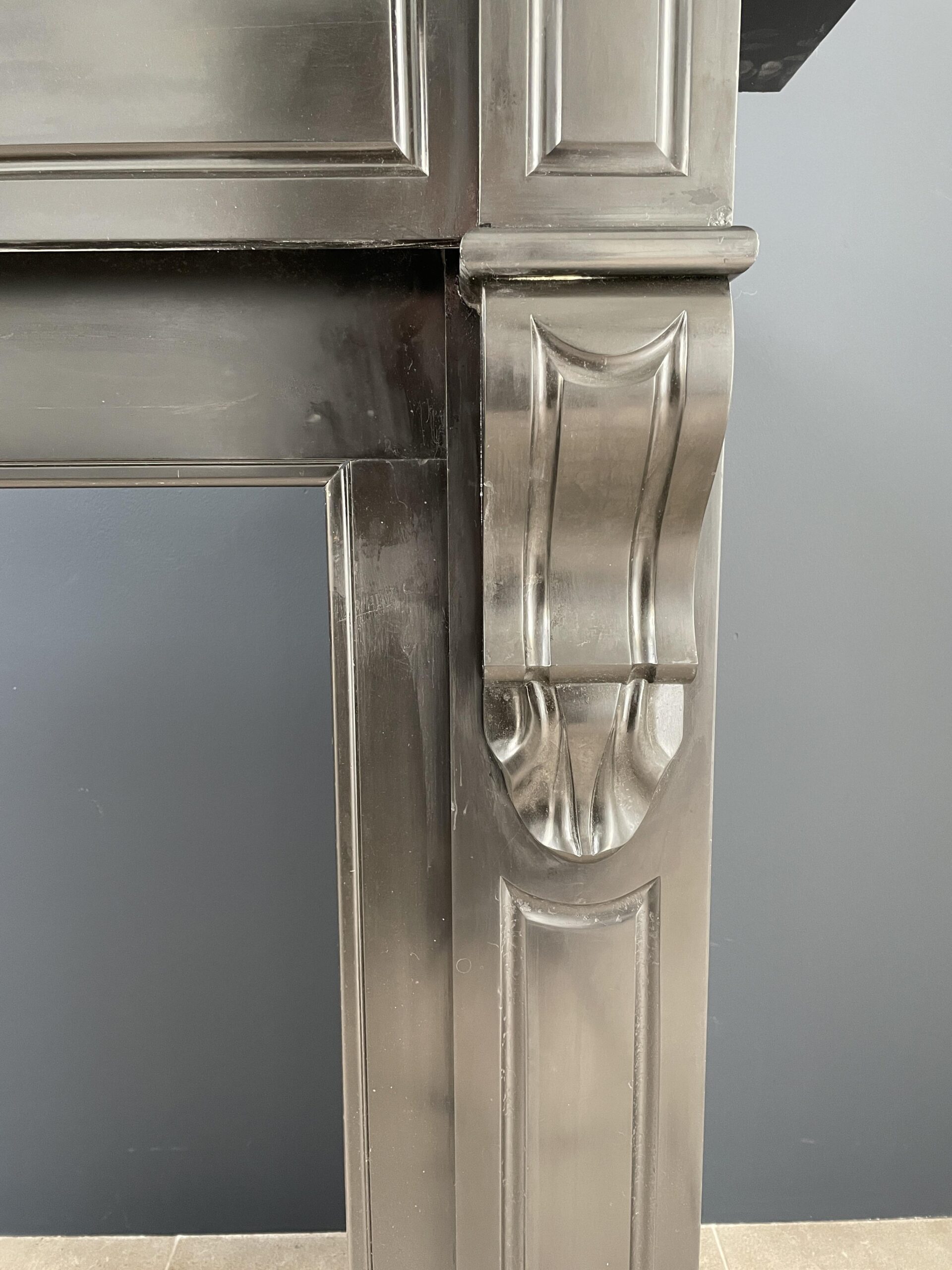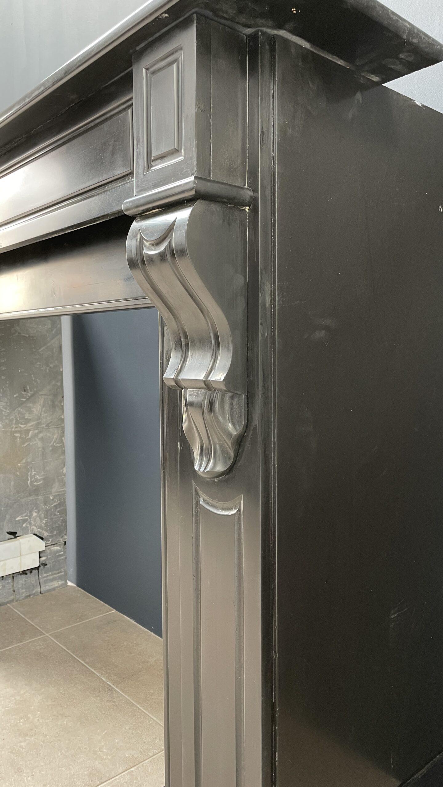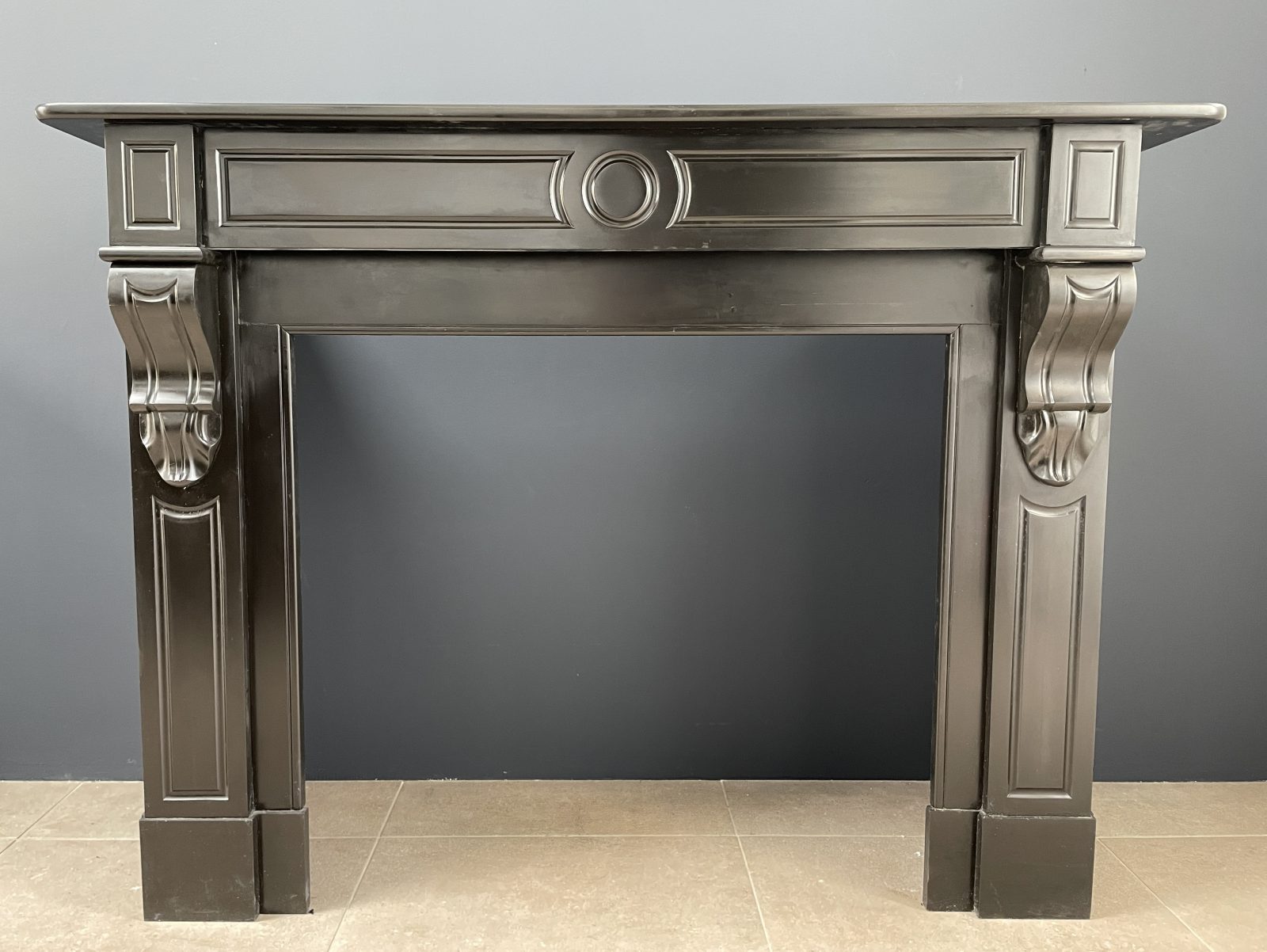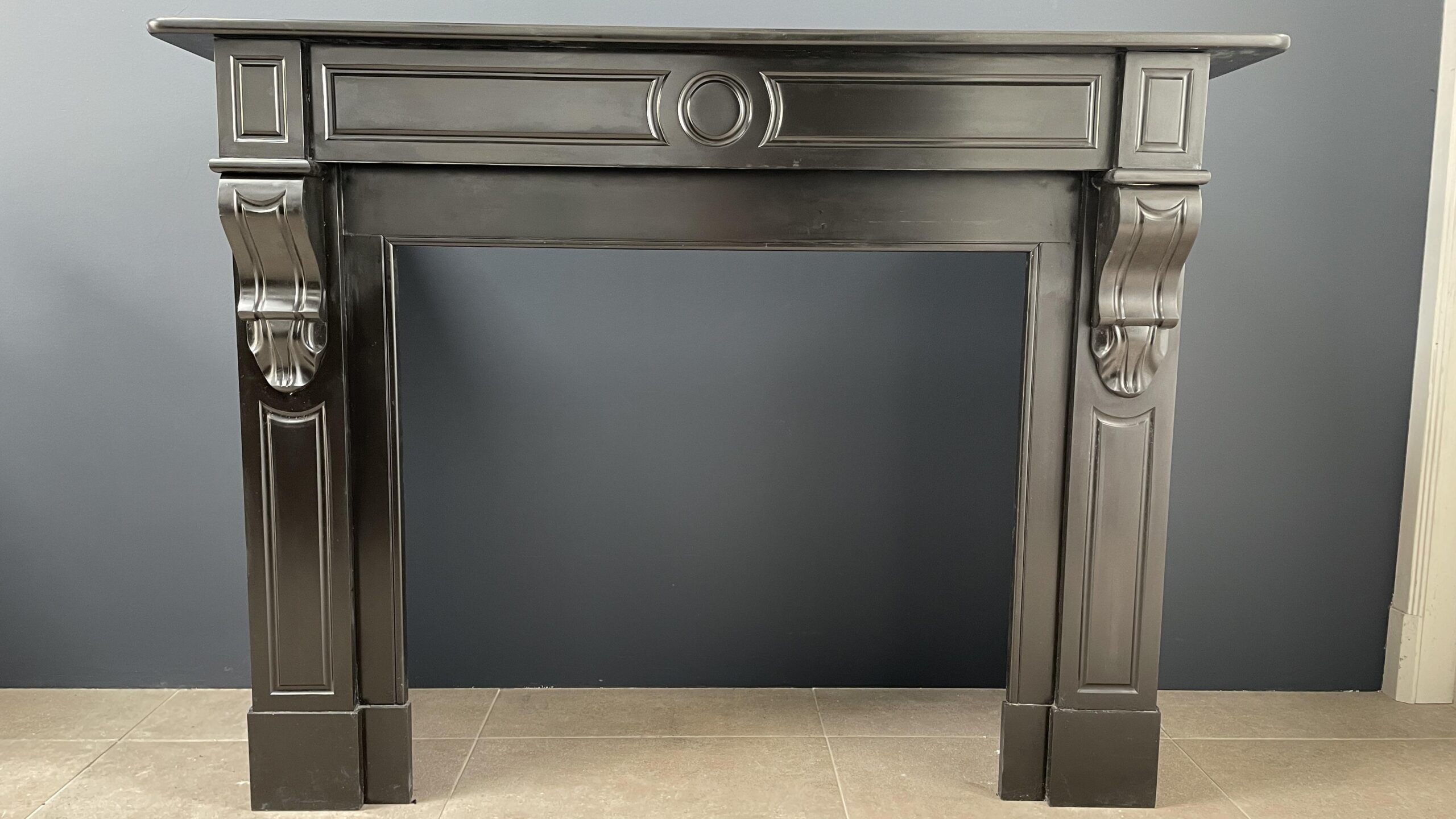 The origin of this fireplace in Noir de Mazy marble with the characteristic circle on the front is in the Netherlands. This also makes this type of fireplace very popular. The consoles of this model are finished with an elegant leaf motif.