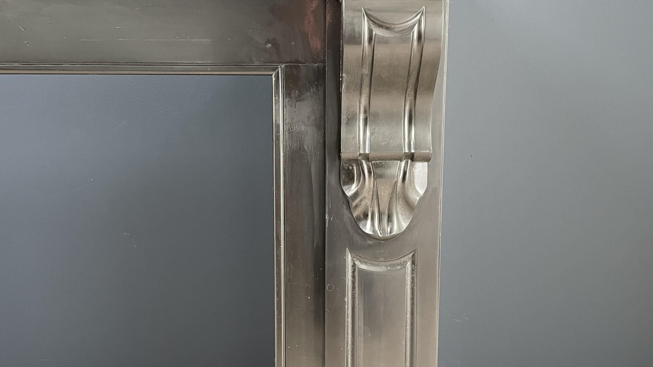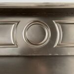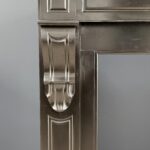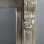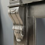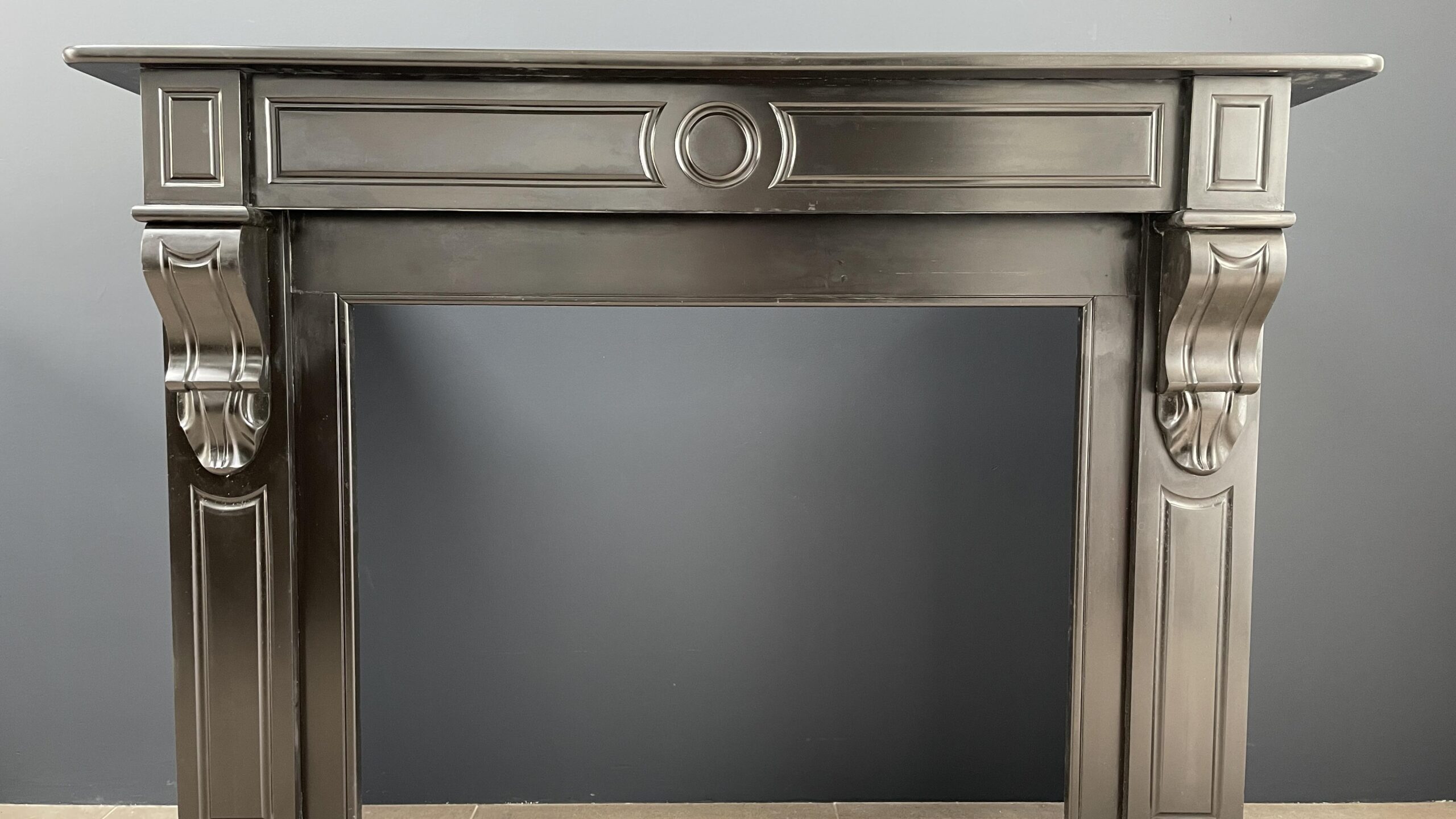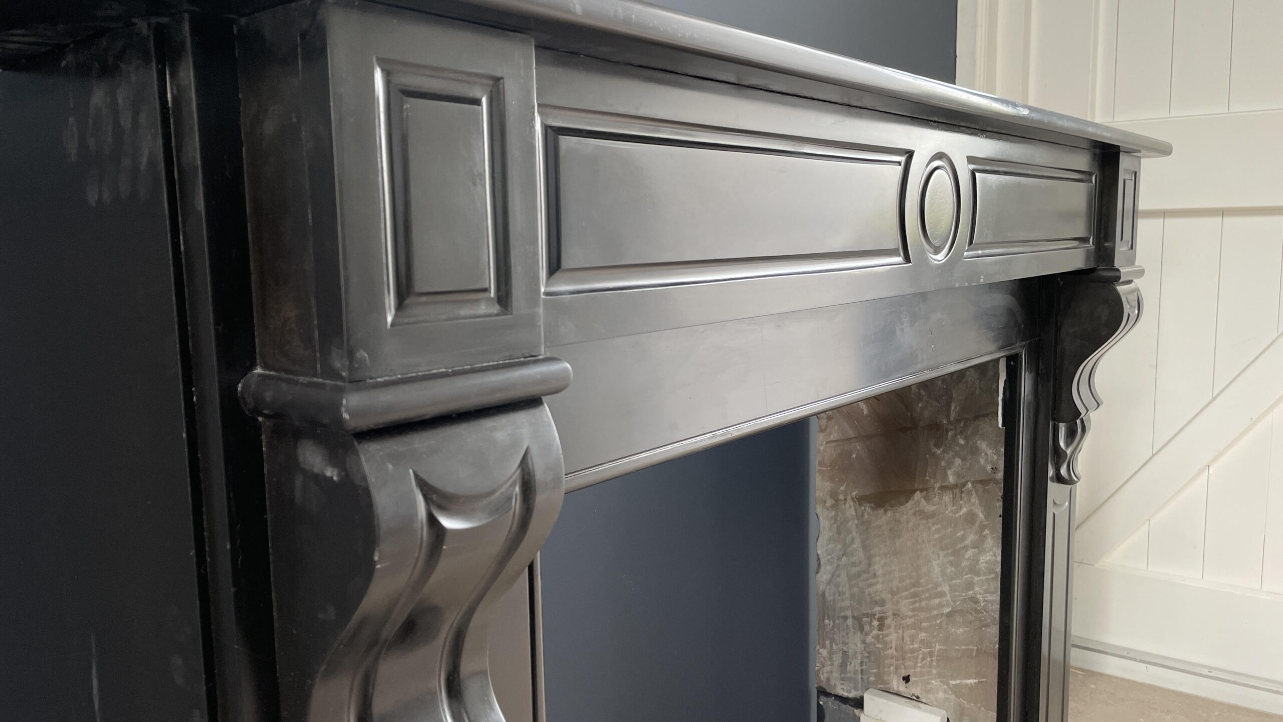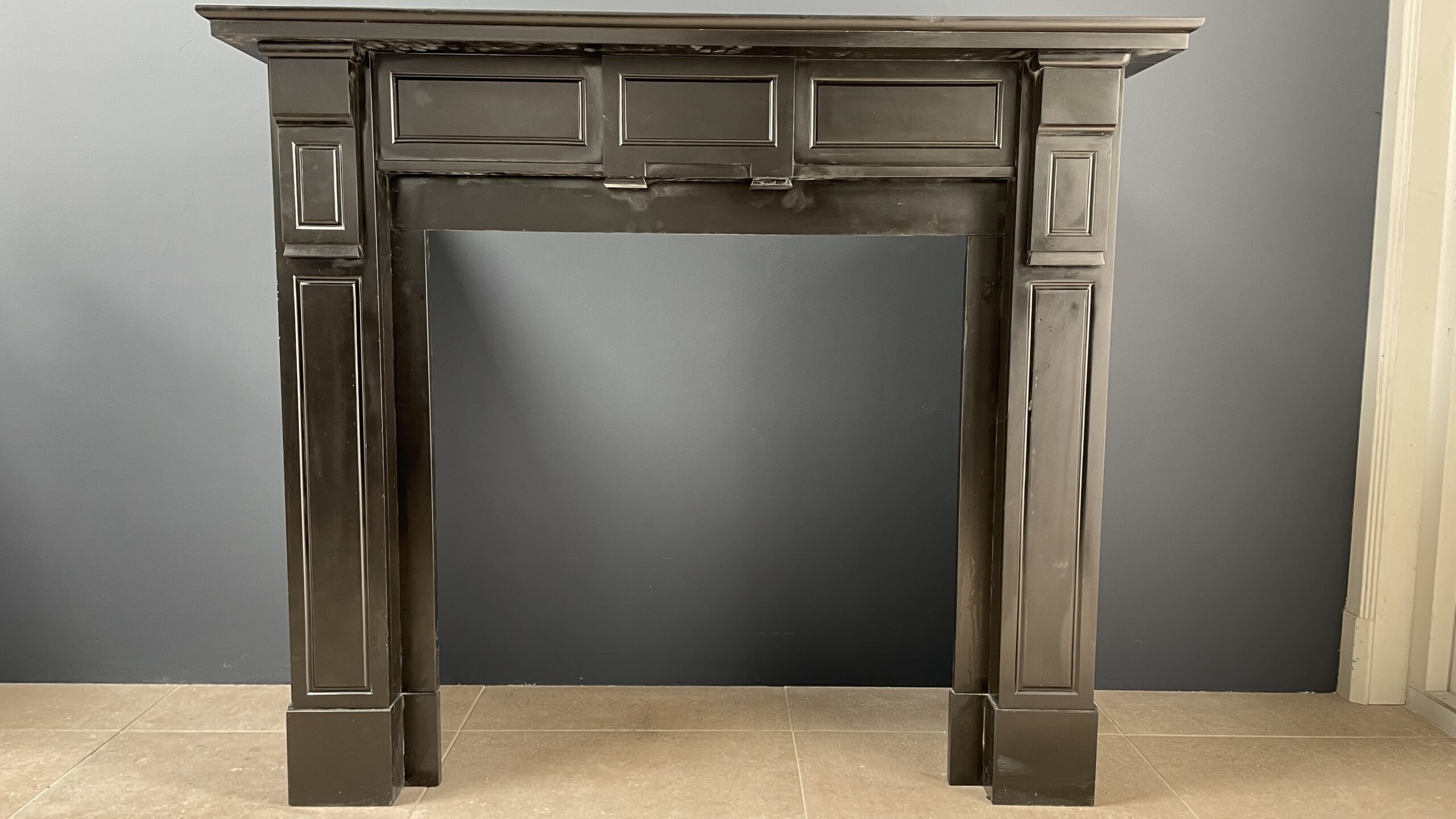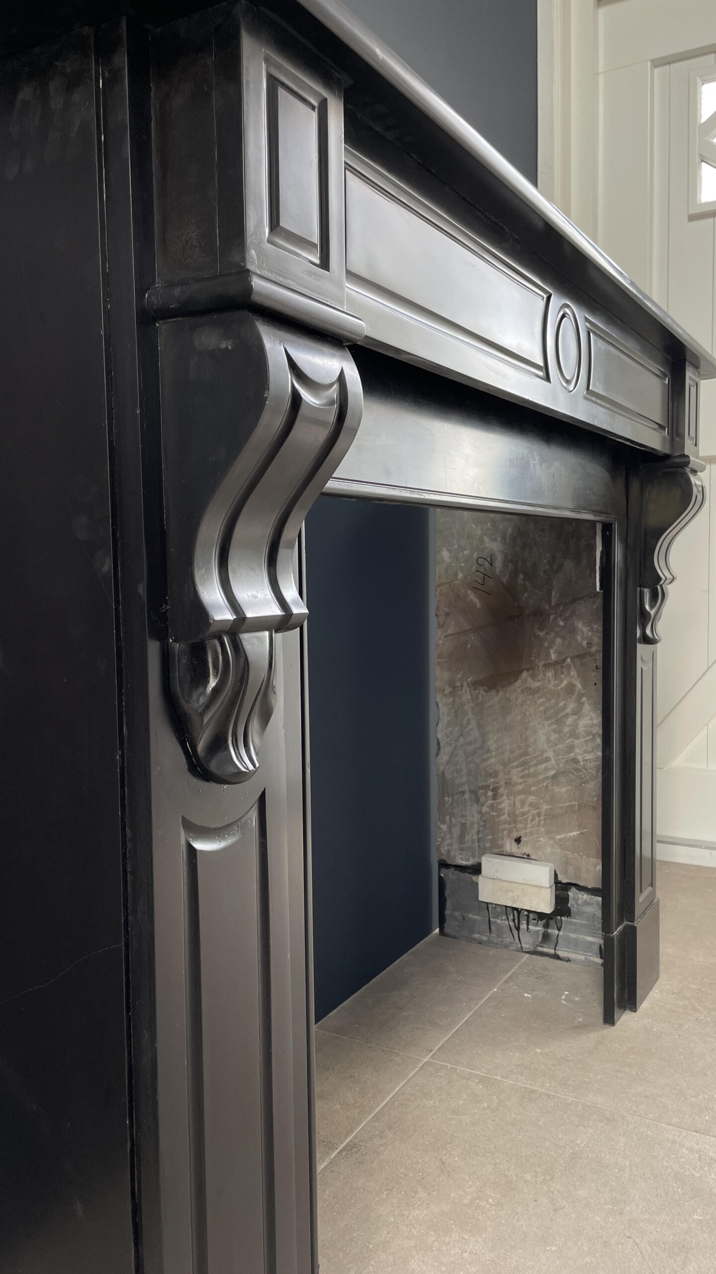 The origin of this fireplace in Noir de Mazy marble with the characteristic circle on the front is in the Netherlands. This also makes this type of fireplace very popular. The consoles of this model are finished with an elegant leaf motif.