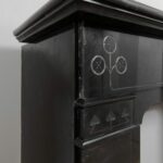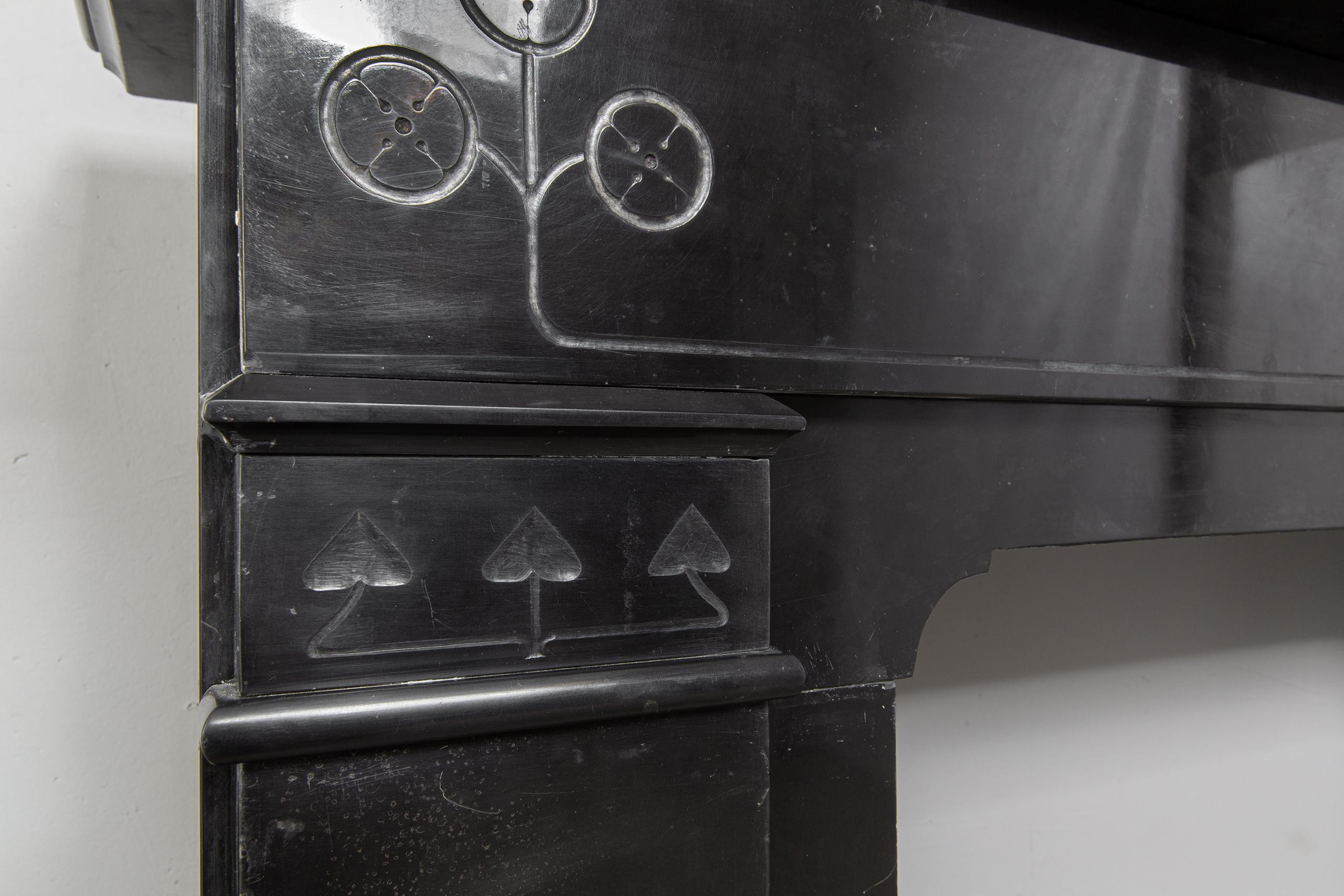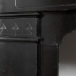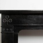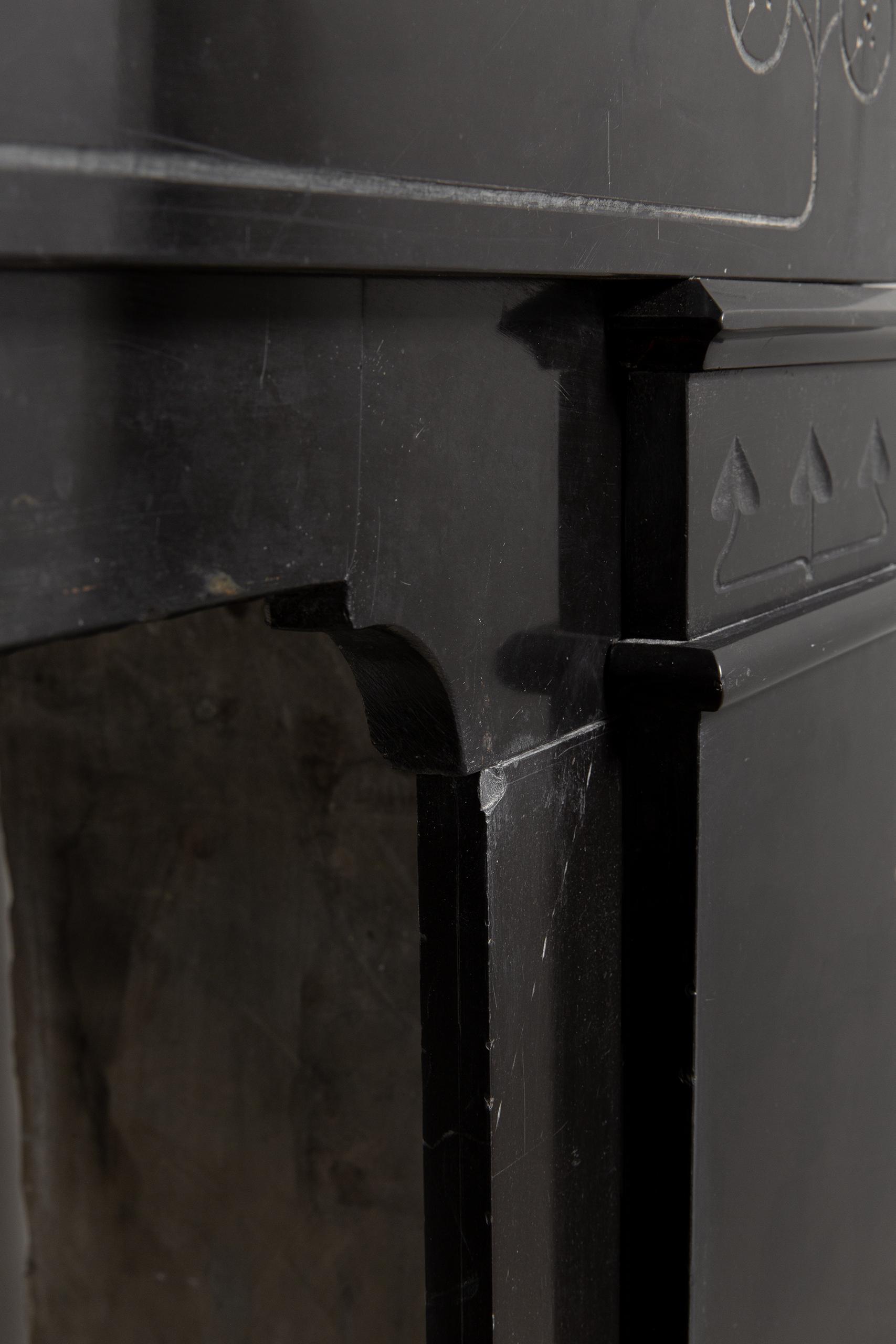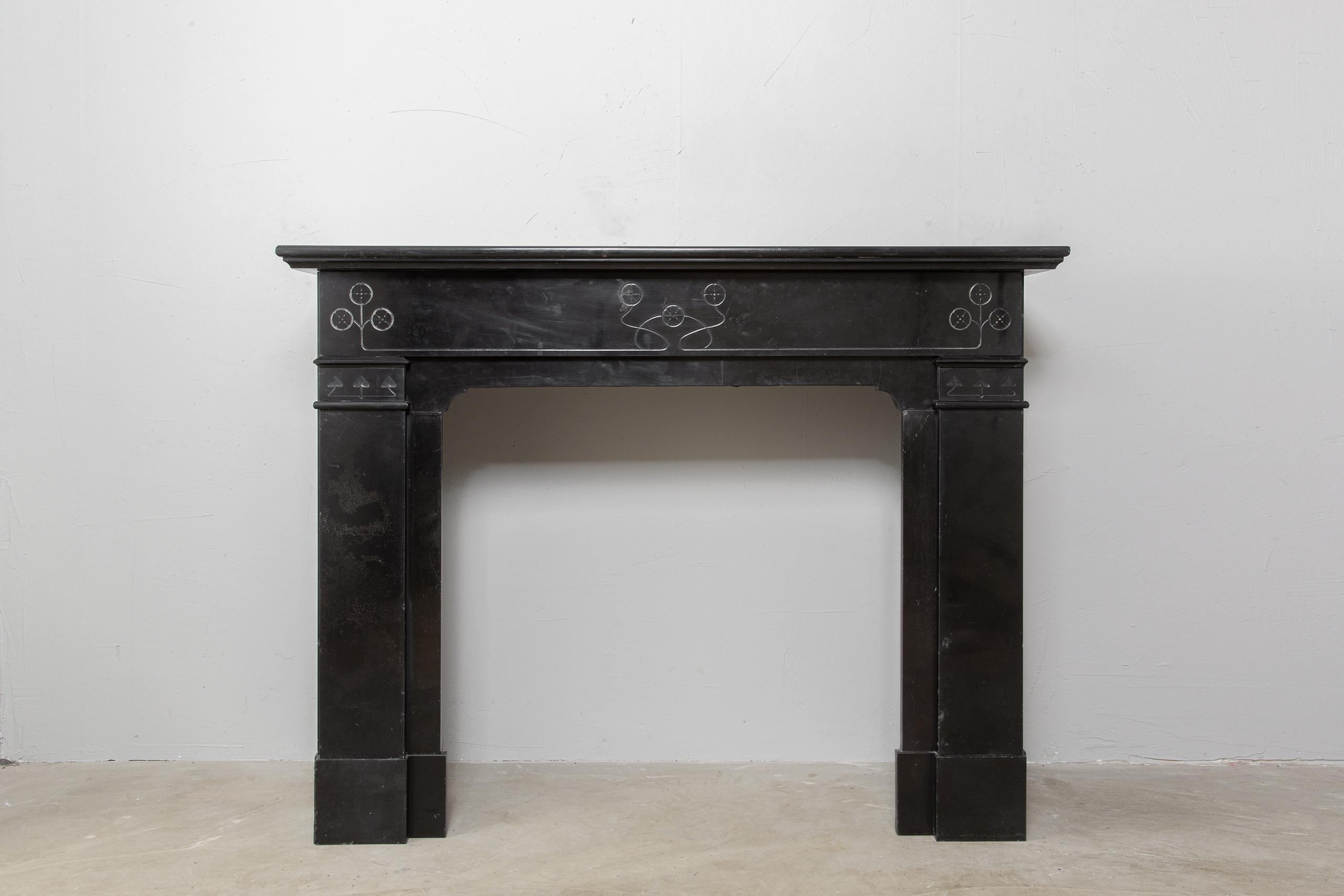 A sleek Art Nouveau fireplace in black gold, Noir de Mazy Marble. This beautiful sleek Antique fireplace is an enrichment of both a classic and modern interior. The decor is decorated with etching and milling. The frame has round corners, which gives the fireplace an elegant look.