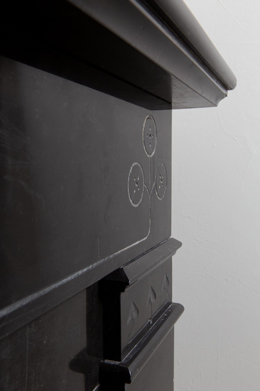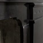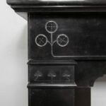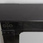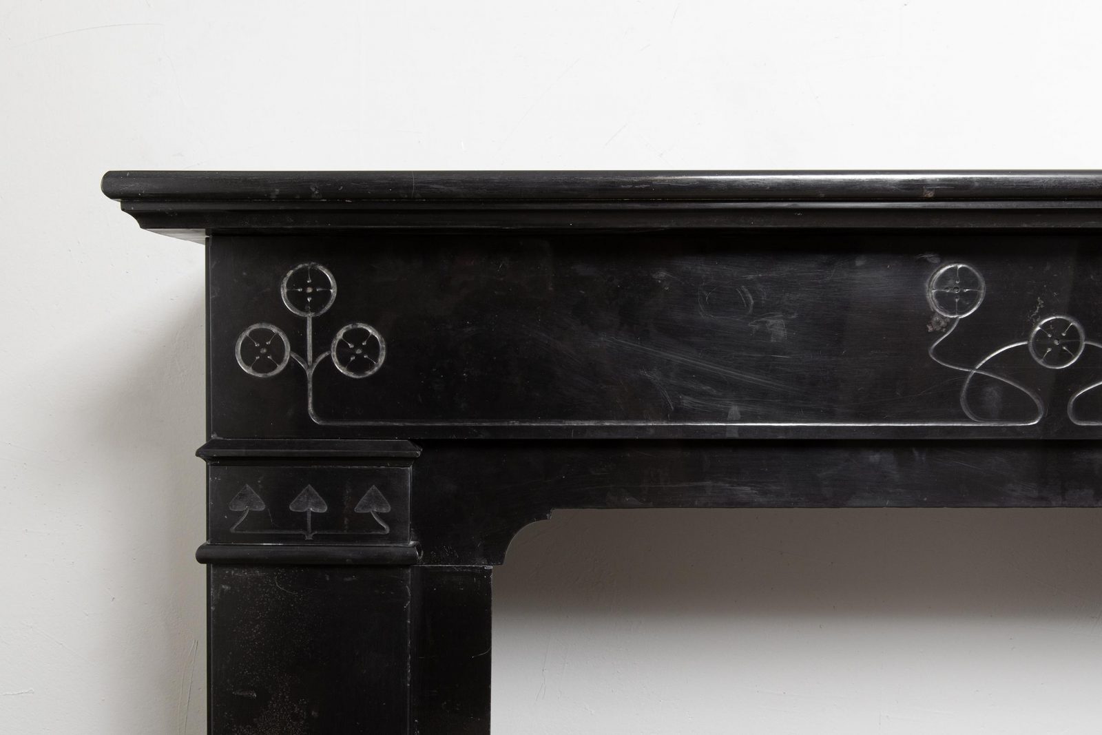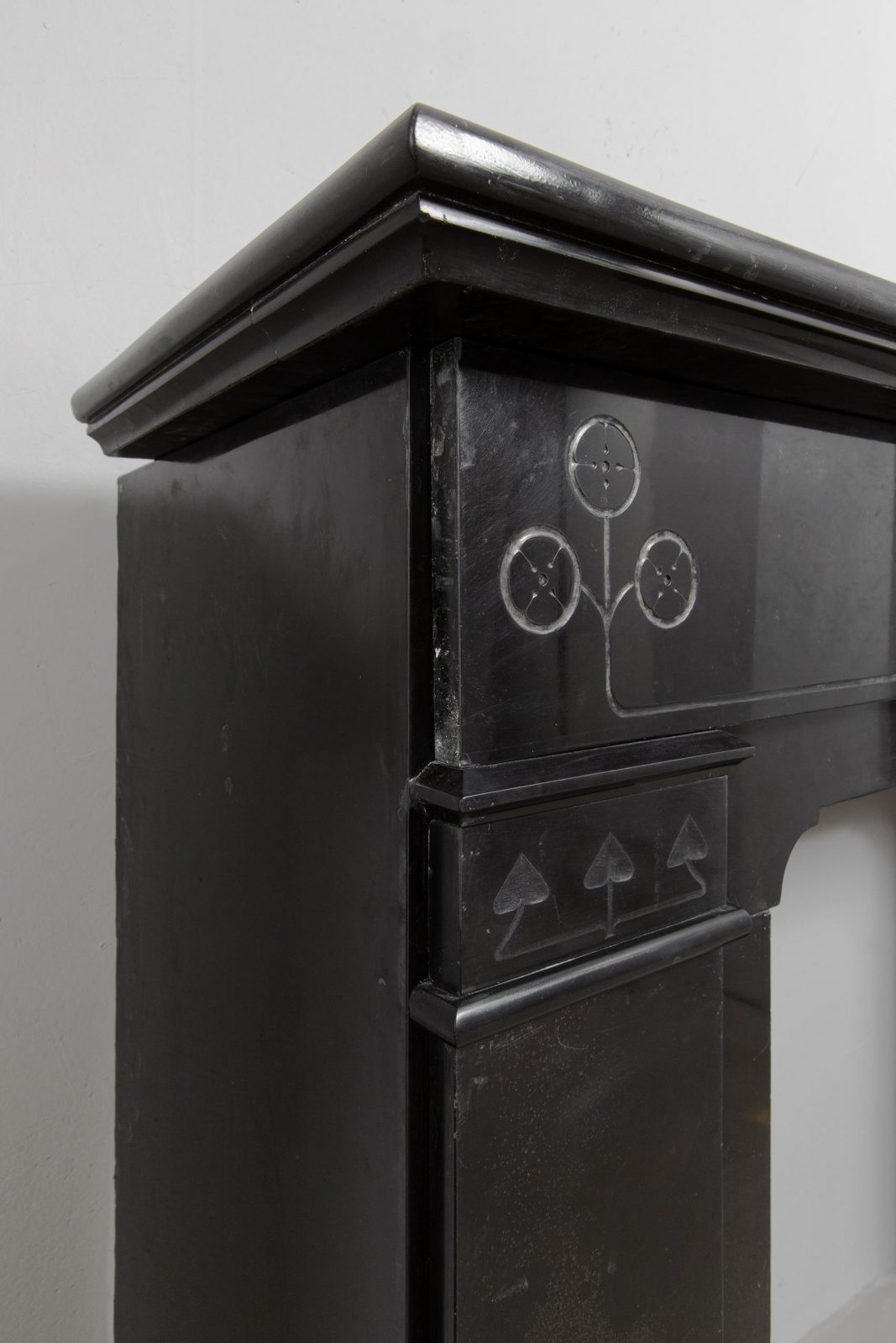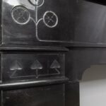 A sleek Art Nouveau fireplace in black gold, Noir de Mazy Marble. This beautiful sleek Antique fireplace is an enrichment of both a classic and modern interior. The decor is decorated with etching and milling. The frame has round corners, which gives the fireplace an elegant look.