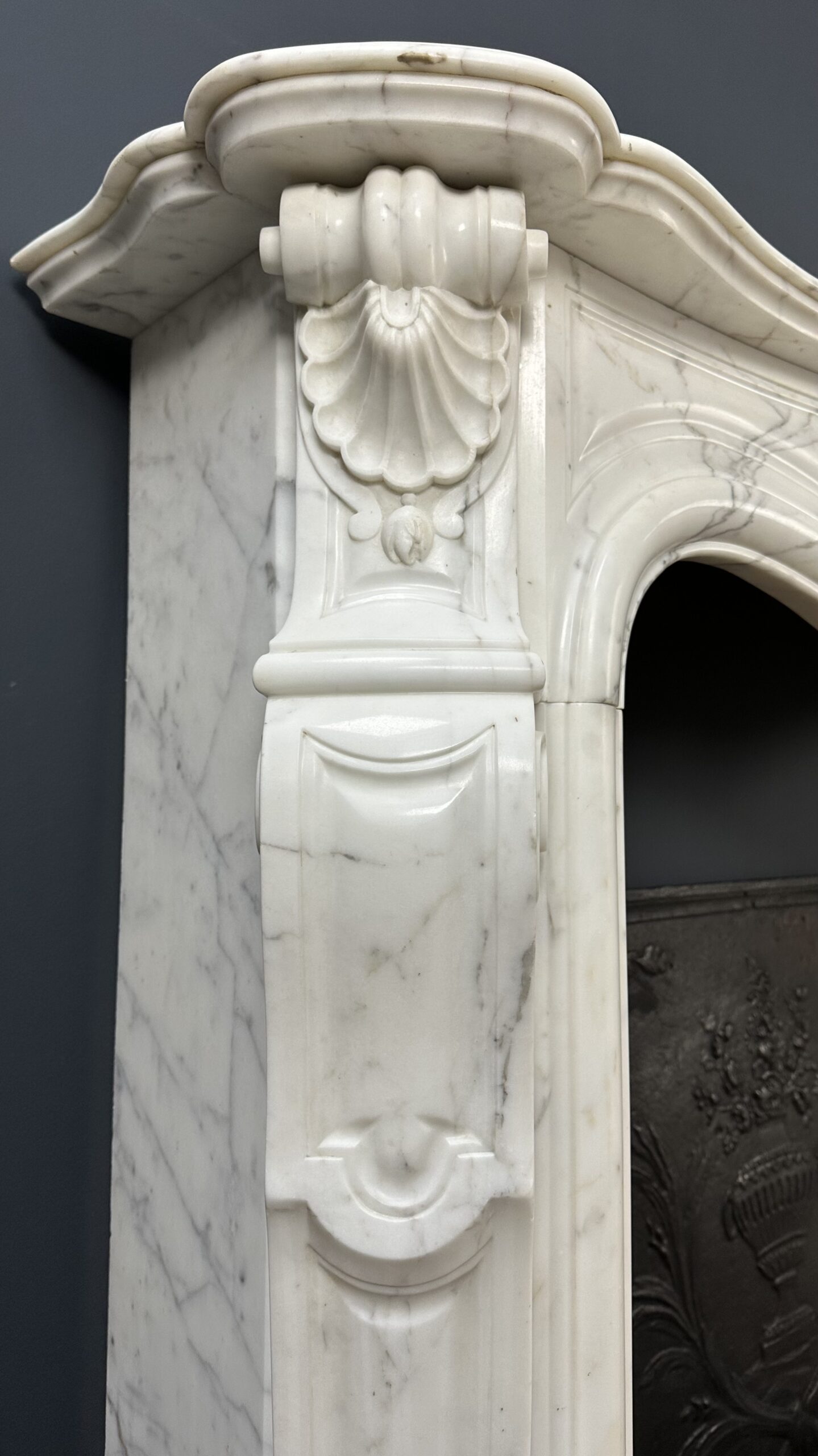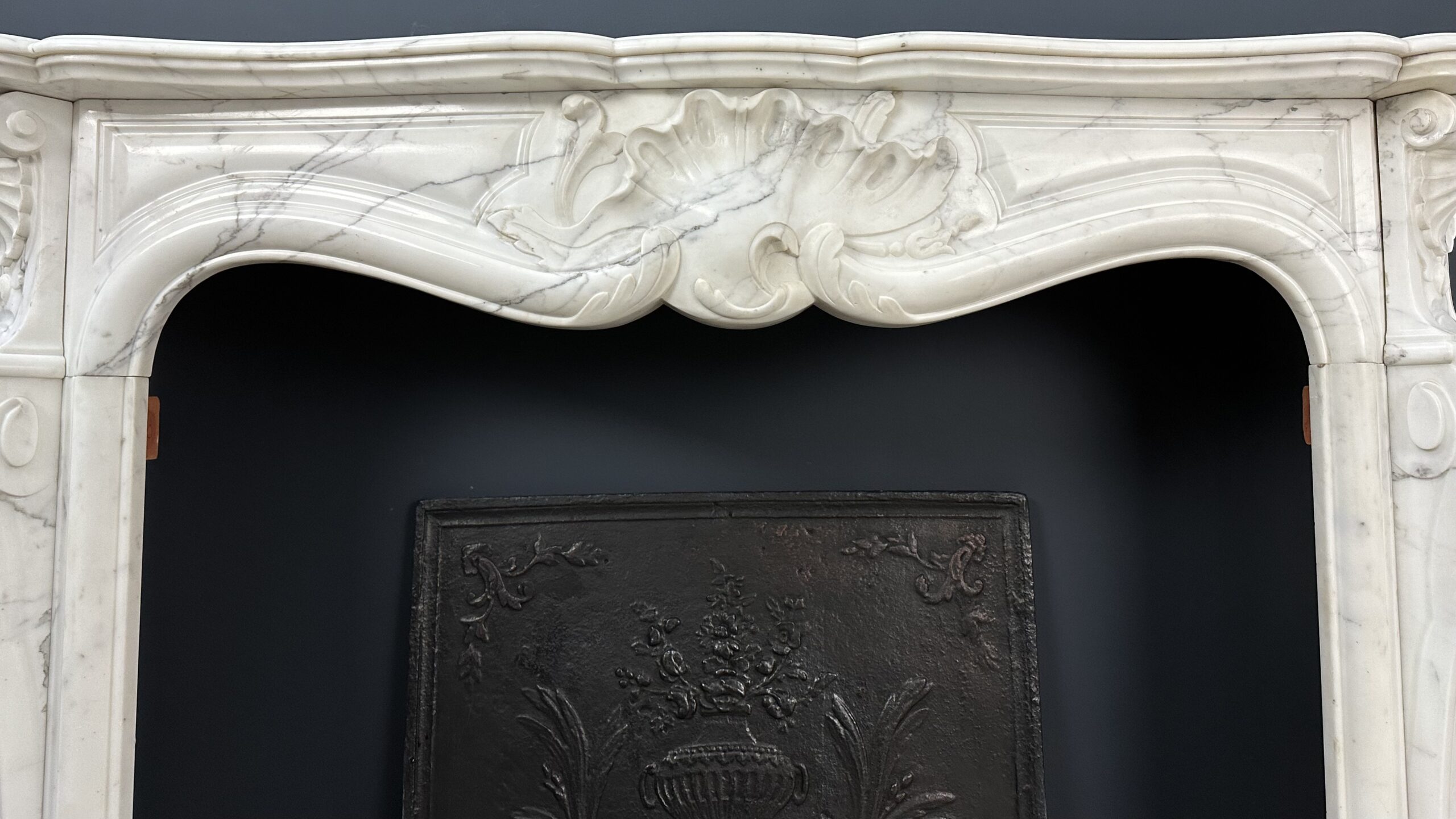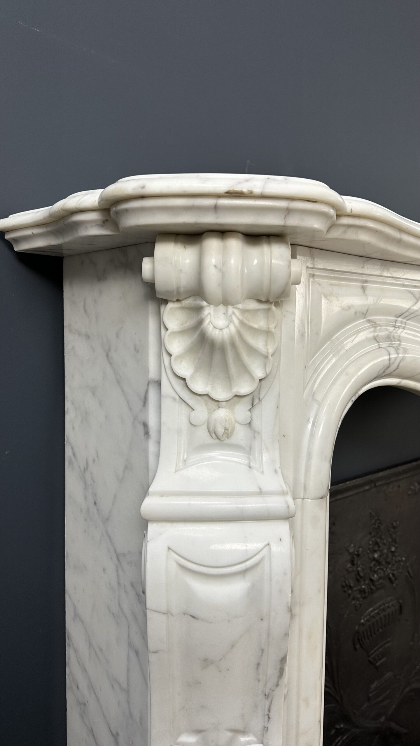 A beautiful antique front fireplace. This fireplace, Rococo style, is hewn from a beautifully veined white marble. Its origins are in France where this fireplace stood in a castle. The shell in the front of this fireplace is asymmetrical which makes the fireplace unique. The consoles are at 45 degrees and the top is three-tiered and gracefully shaped.