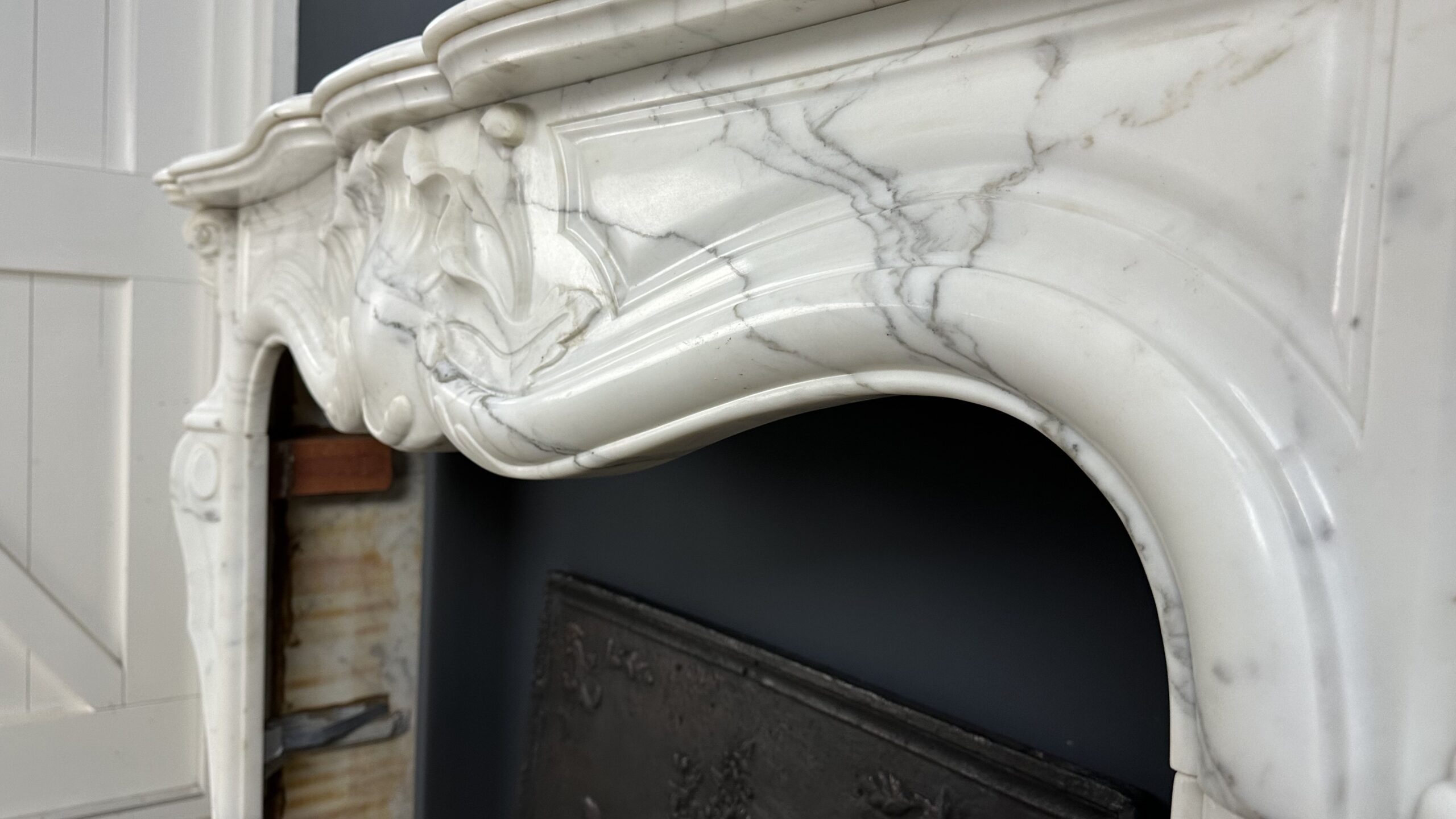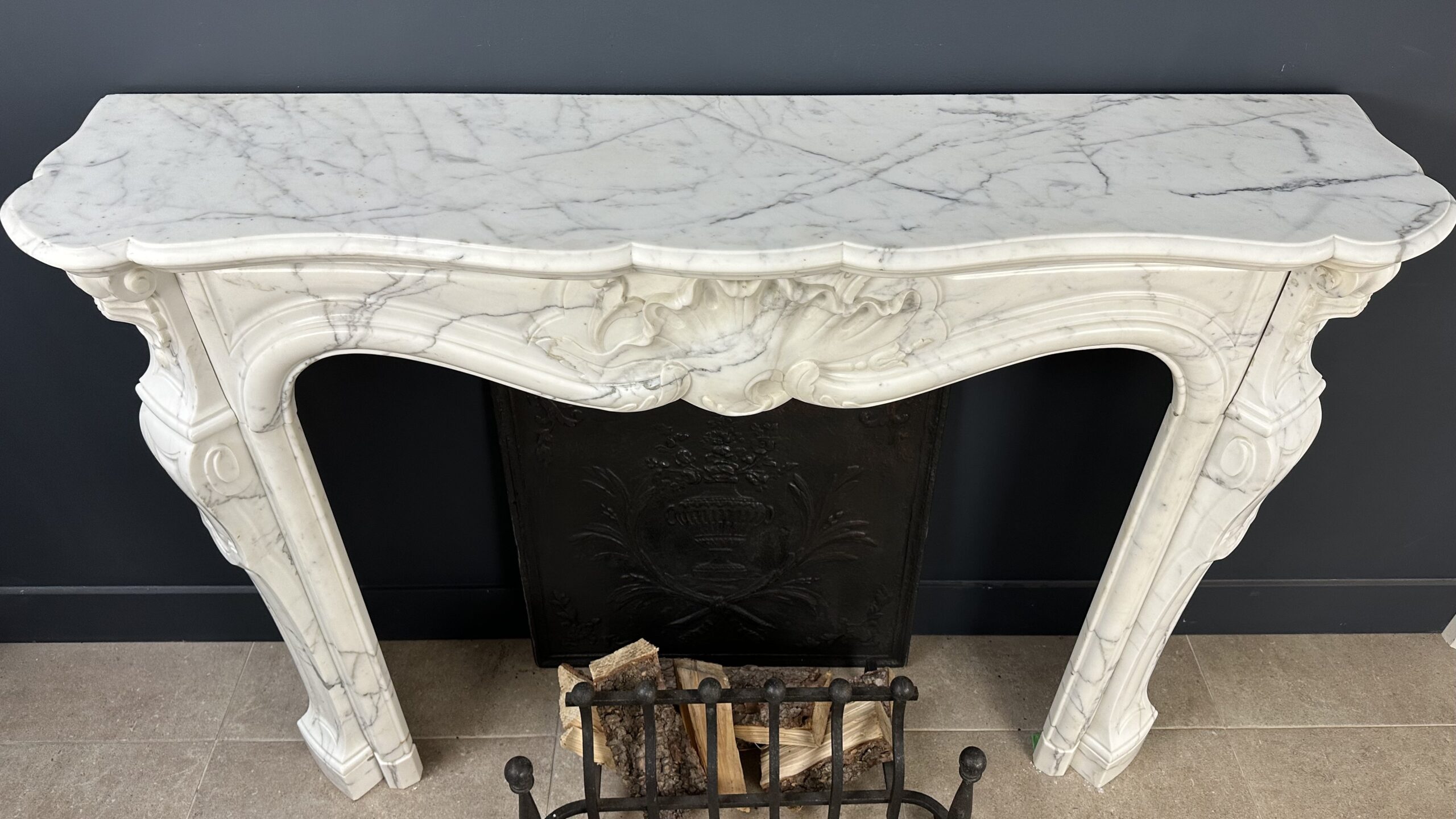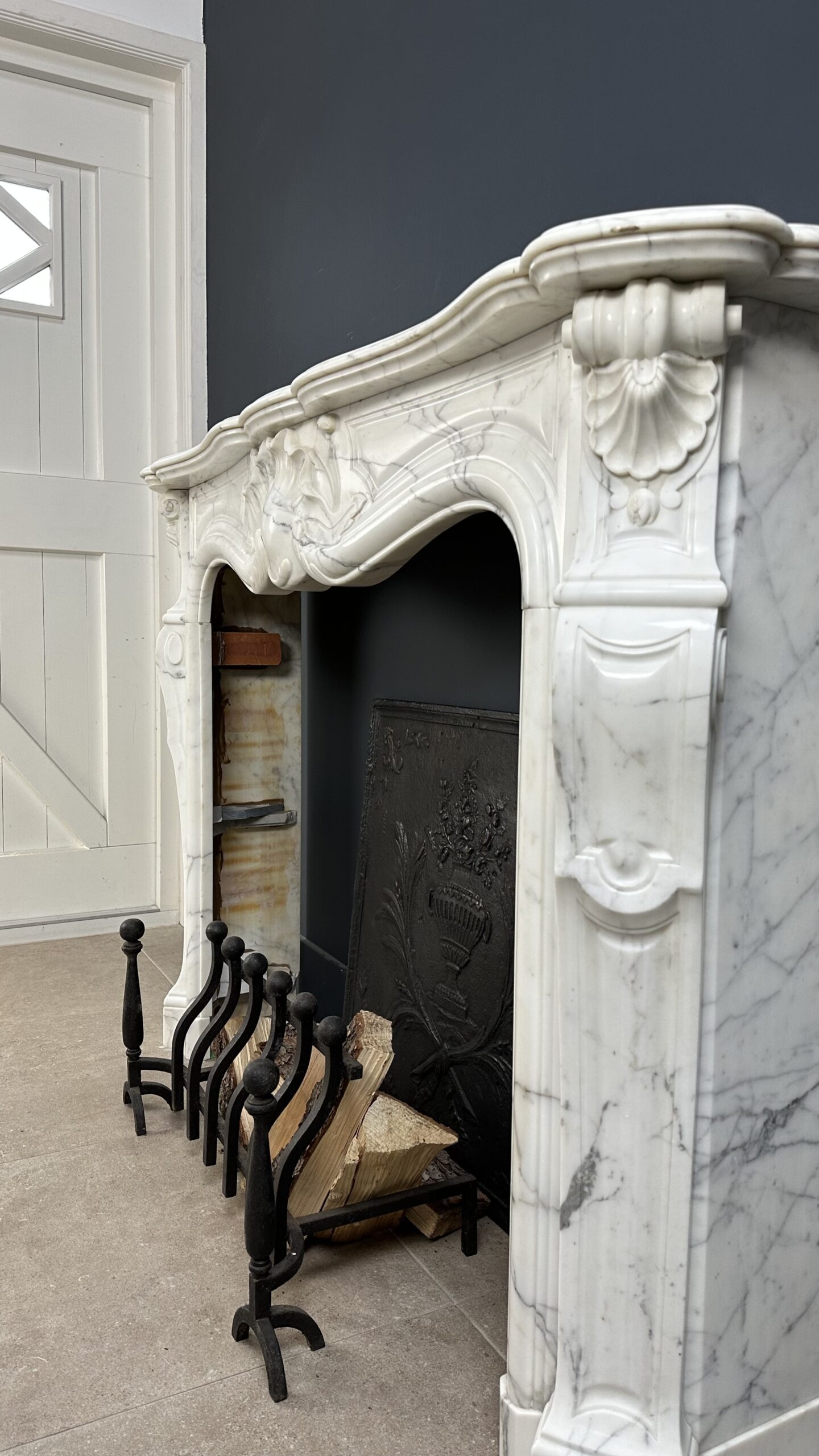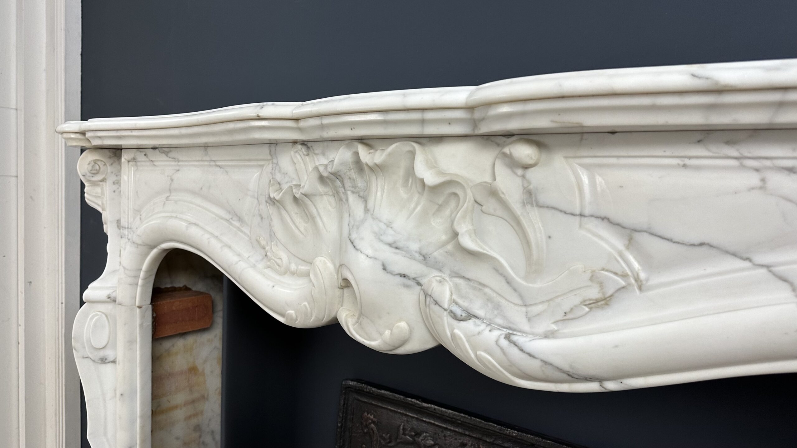 A beautiful antique front fireplace. This fireplace, Rococo style, is hewn from a beautifully veined white marble. Its origins are in France where this fireplace stood in a castle. The shell in the front of this fireplace is asymmetrical which makes the fireplace unique. The consoles are at 45 degrees and the top is three-tiered and gracefully shaped.