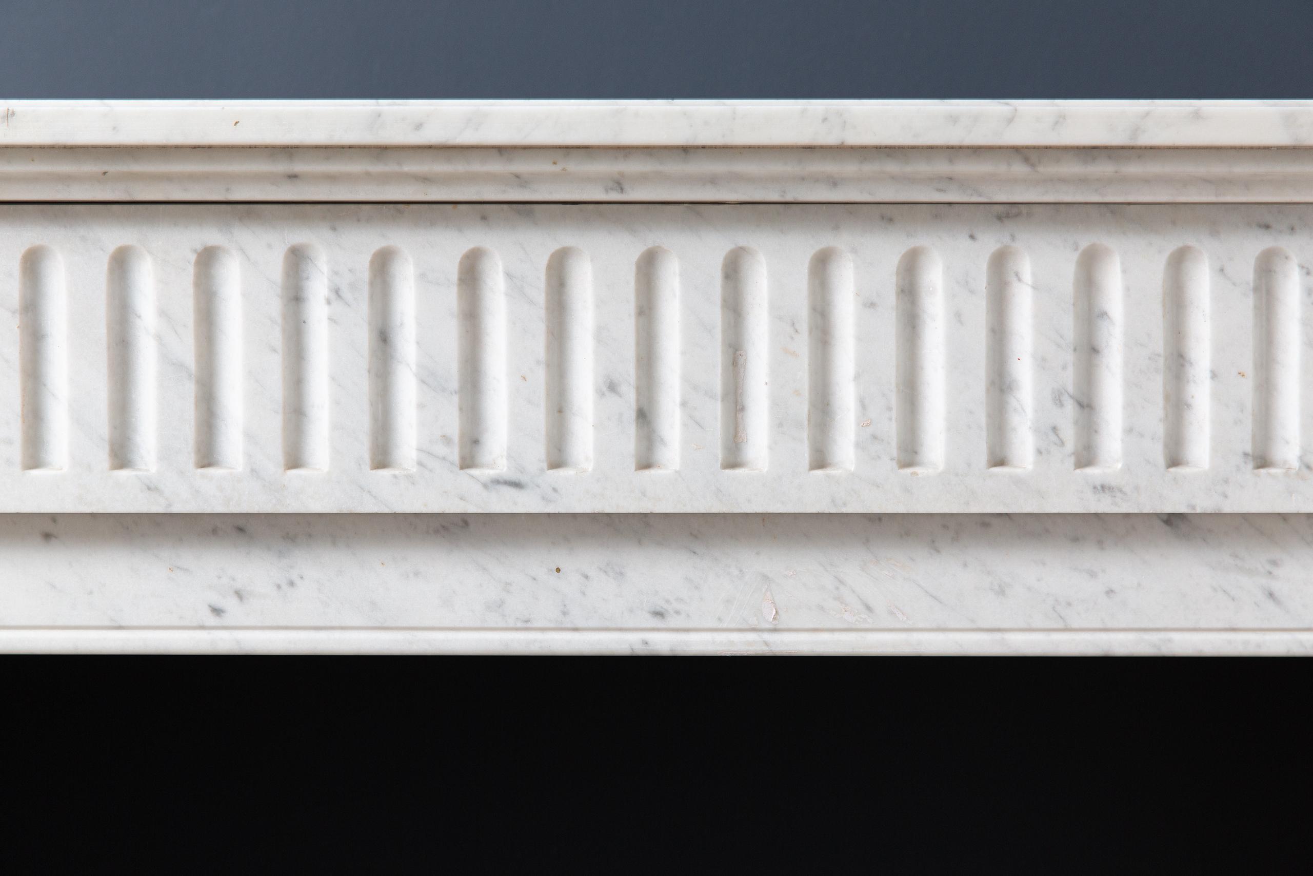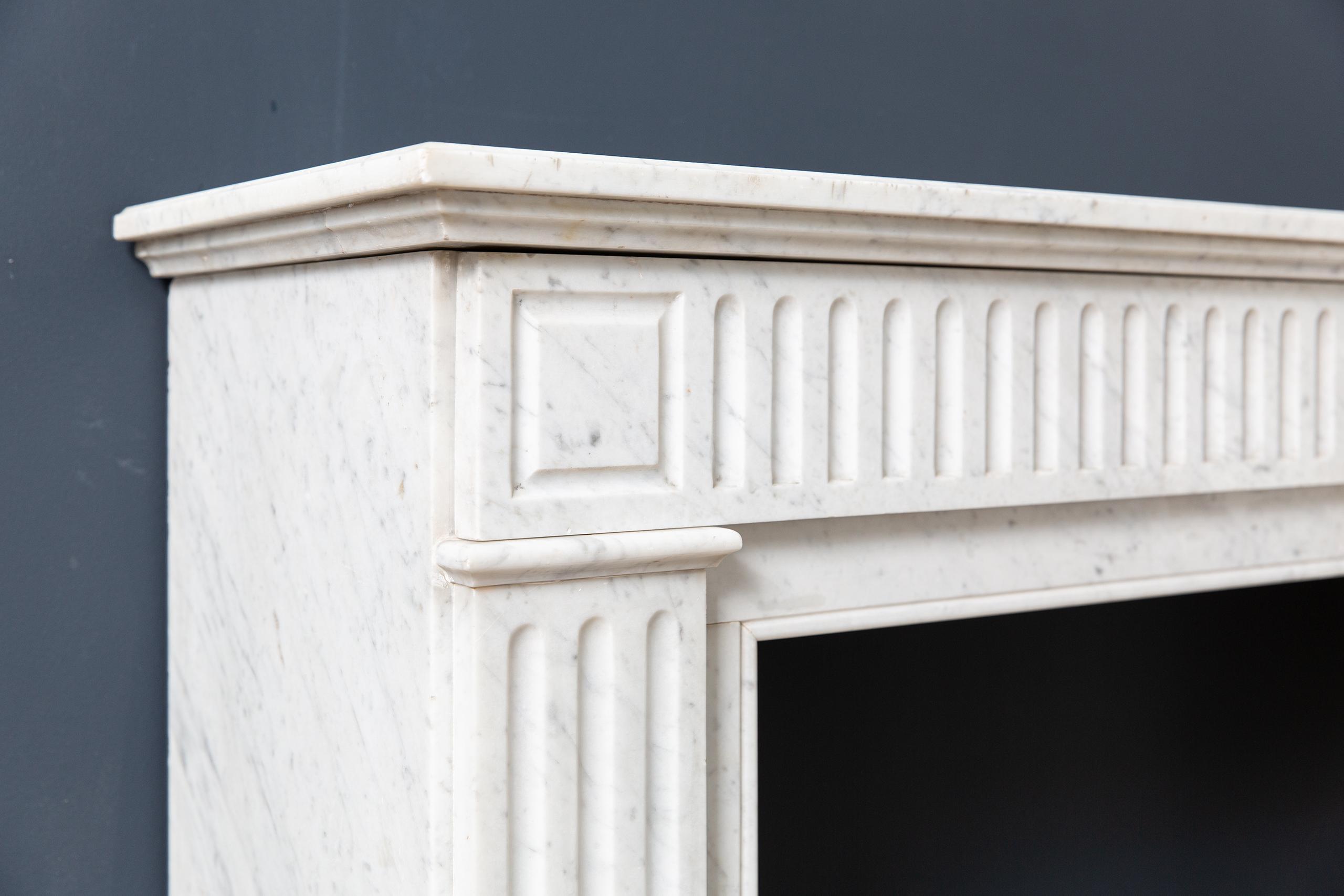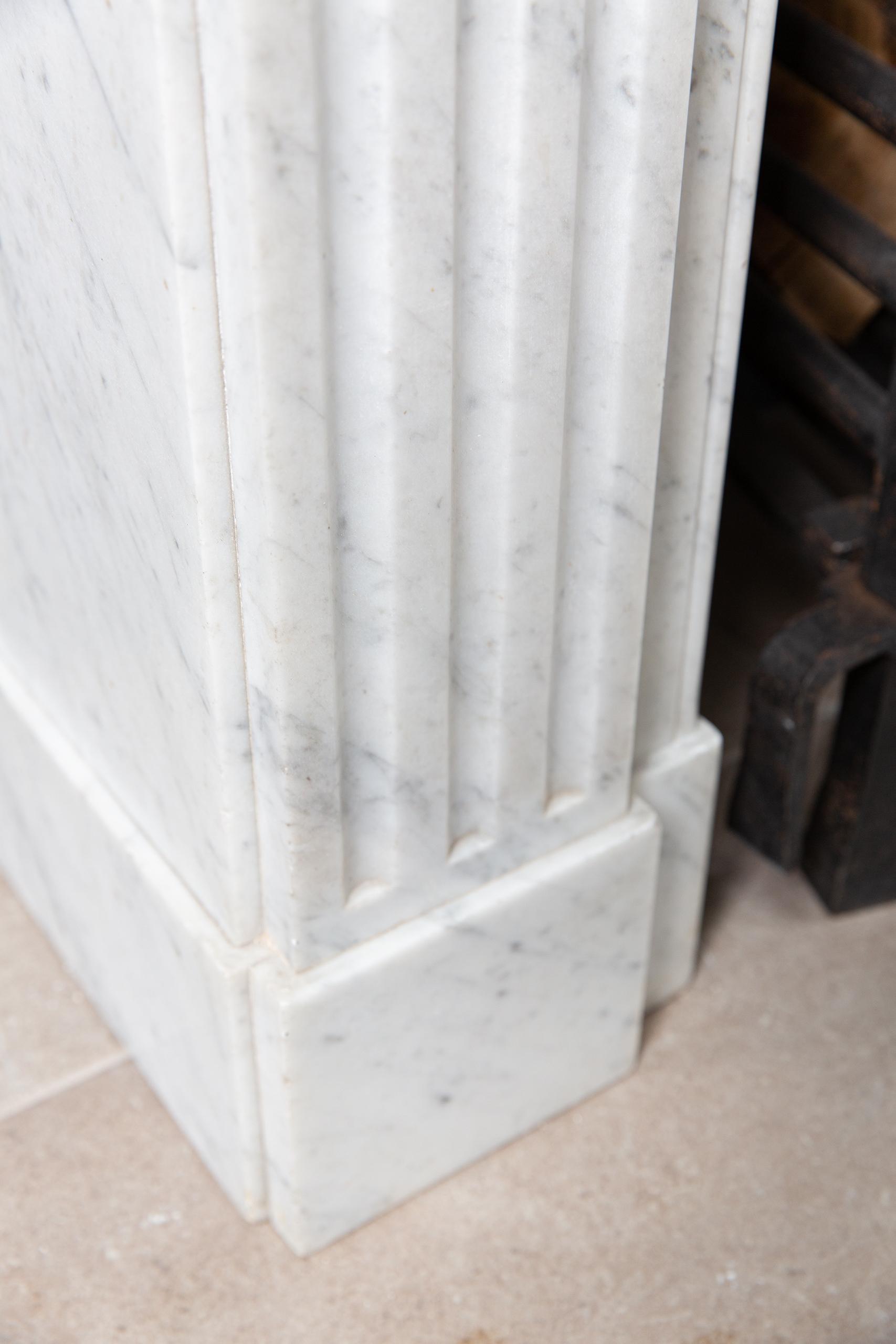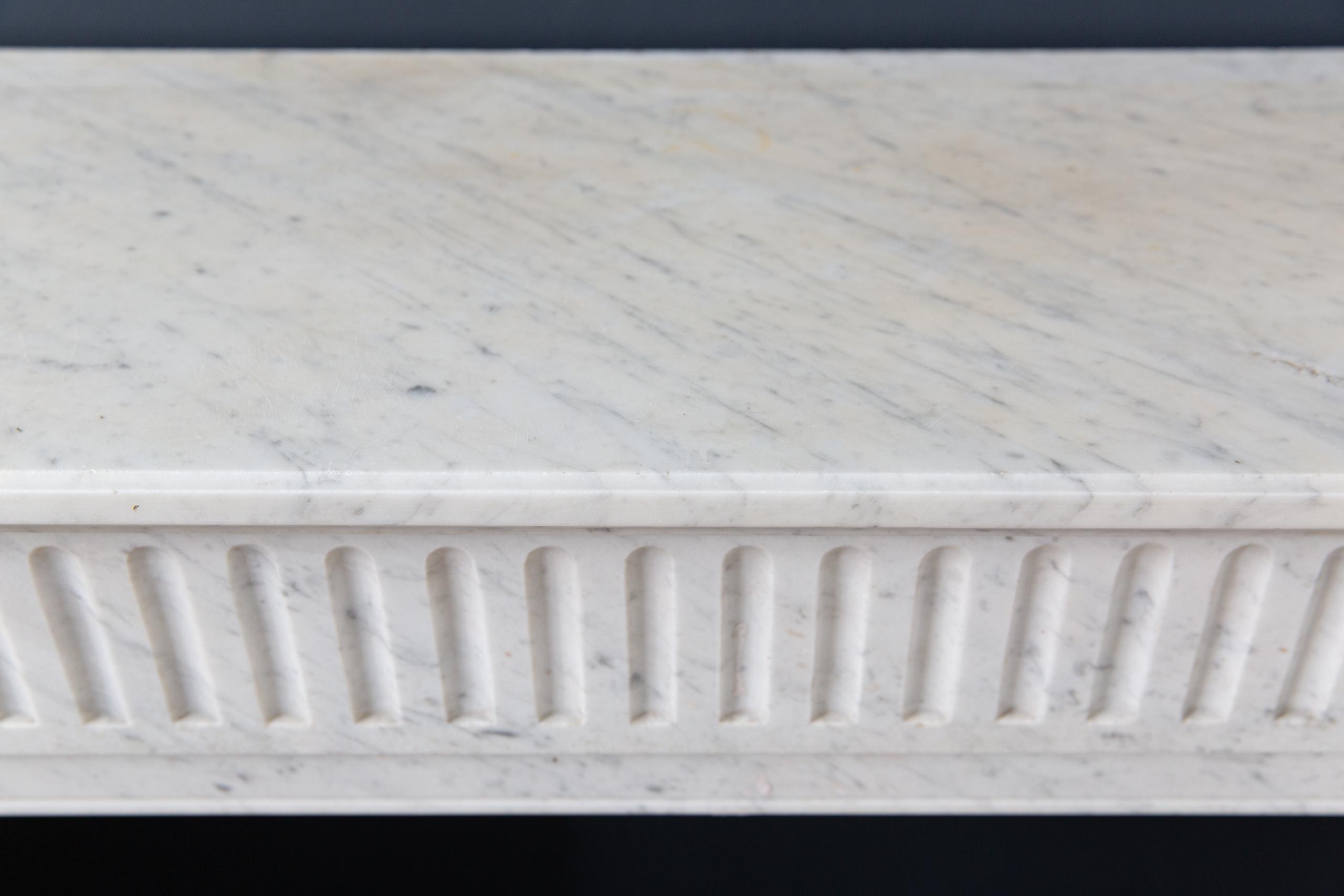 Sleek Carrara white marble front fireplace. The clean lines of this fireplace make it suitable for both a modern and classic interior. The consoles are nicely profiled, just like the front. The top is double, which gives it a richer look.