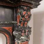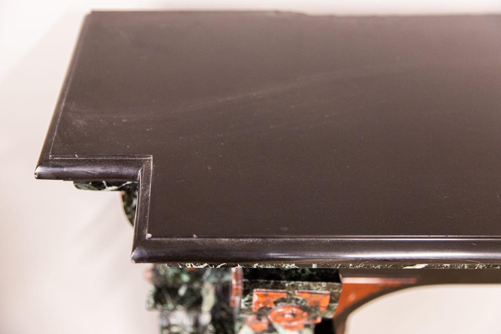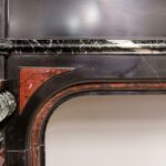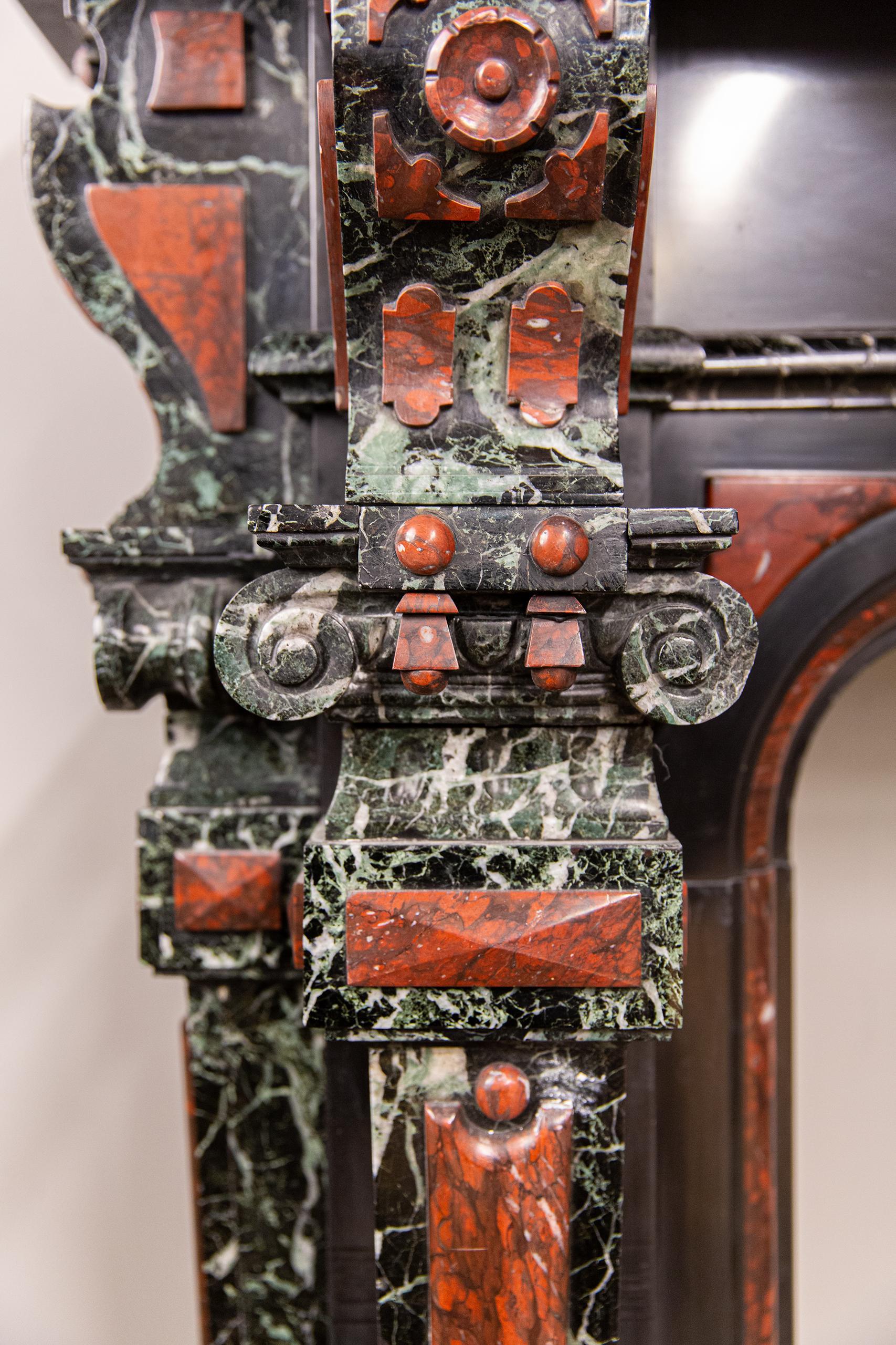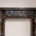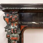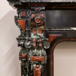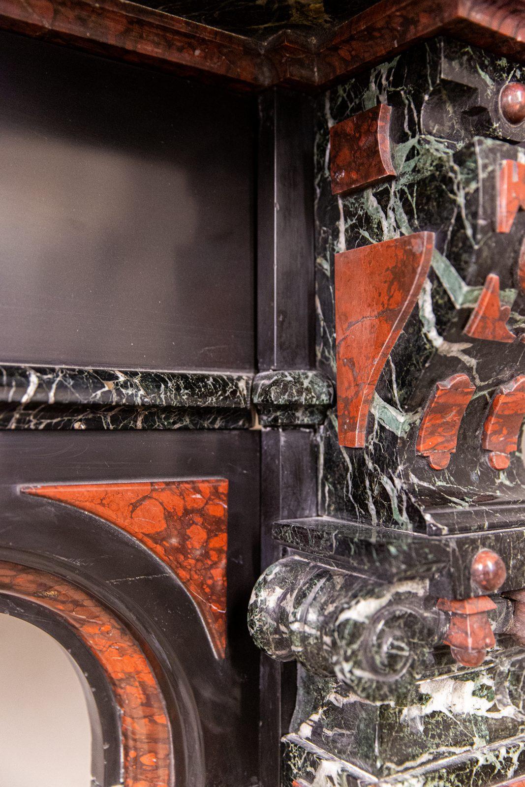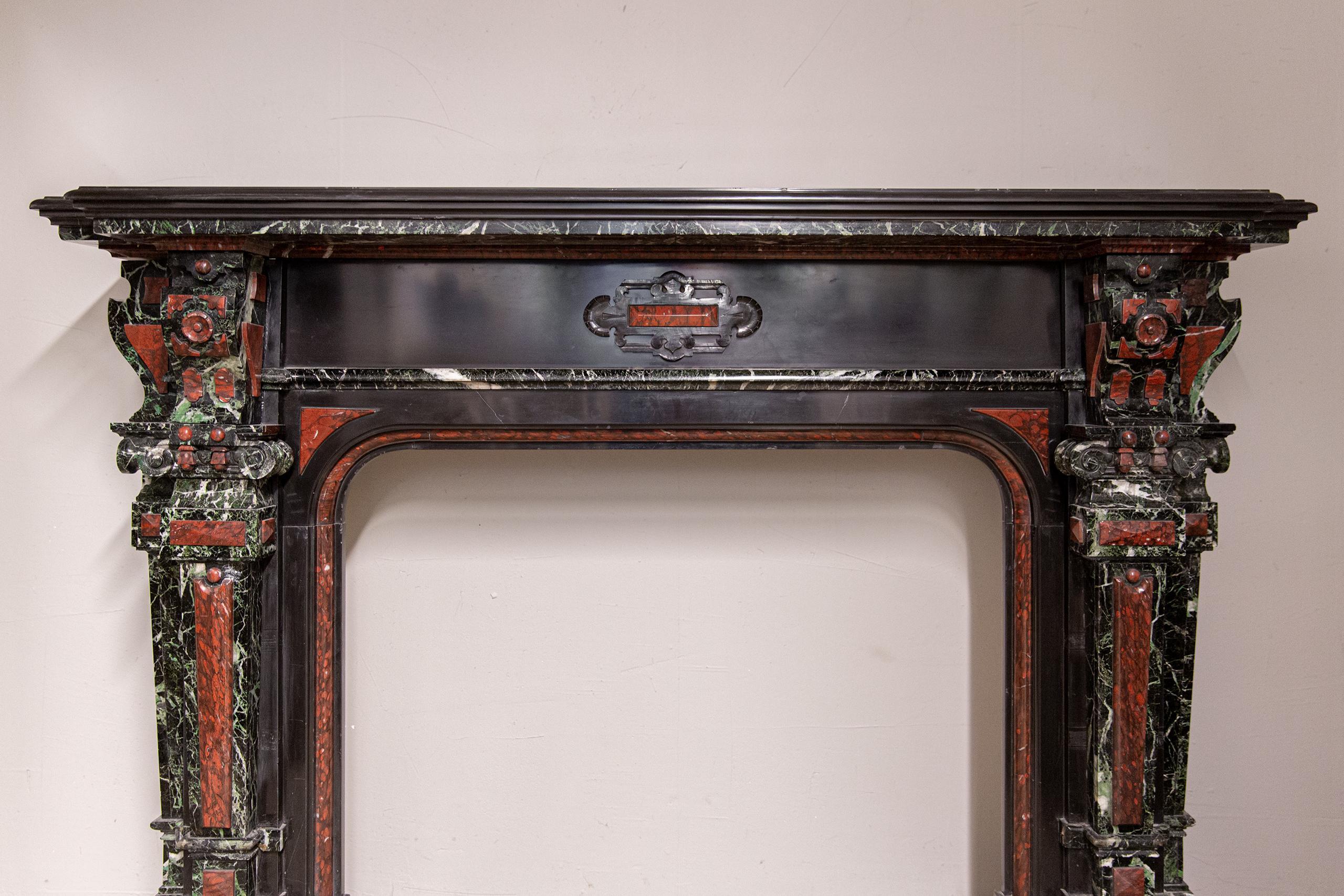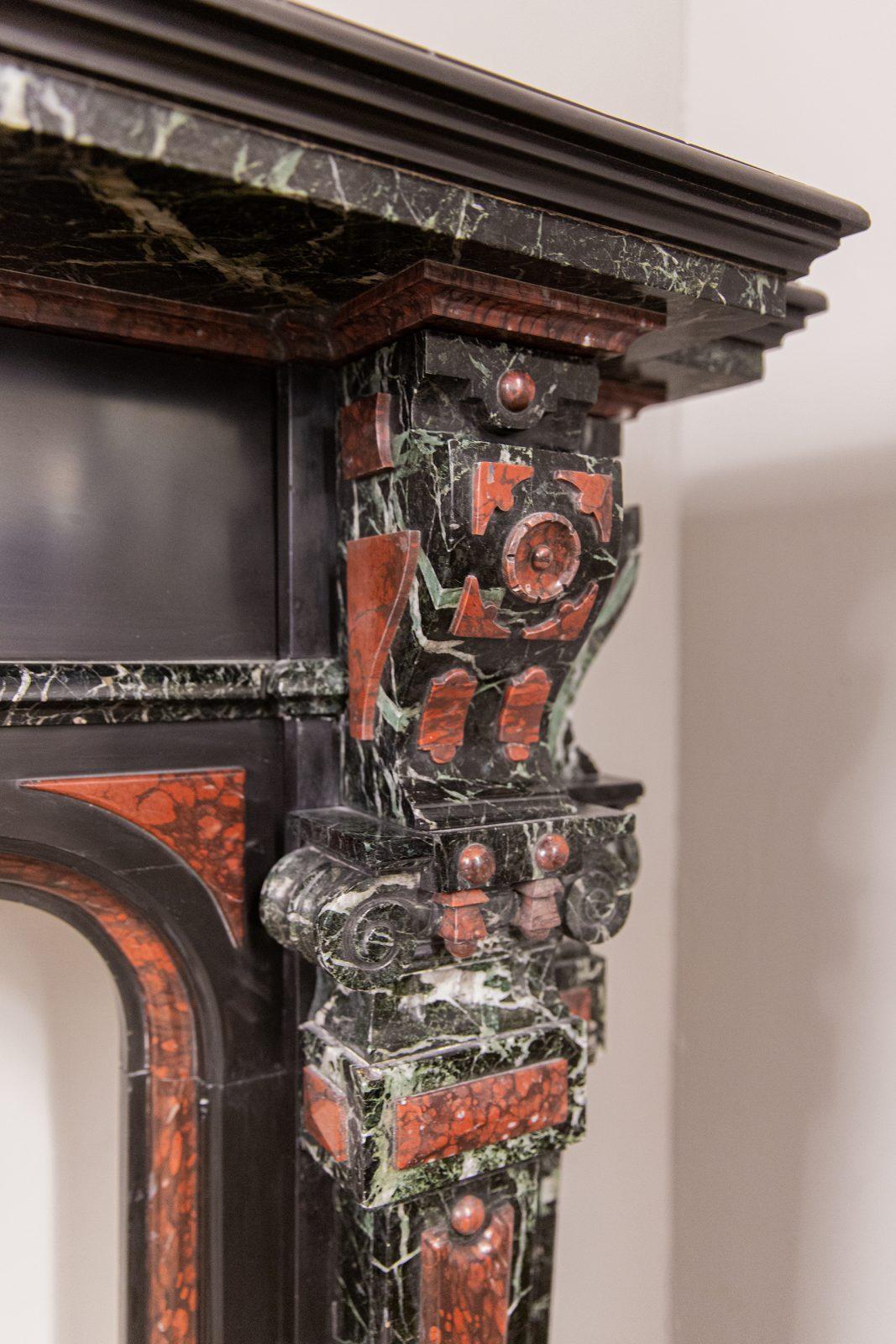 An extravagant appearance this antique black marble fireplace. This fireplace is totally decorated with red and green marble overlays. The details and the amount of work that went into making this fireplace are incomprehensible. The consoles are double, the frame is fully decorated with a round red trim. The top is more layered and made of black and green marble.