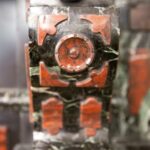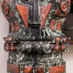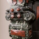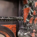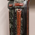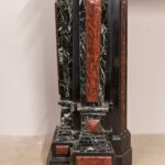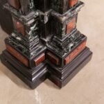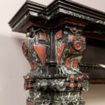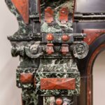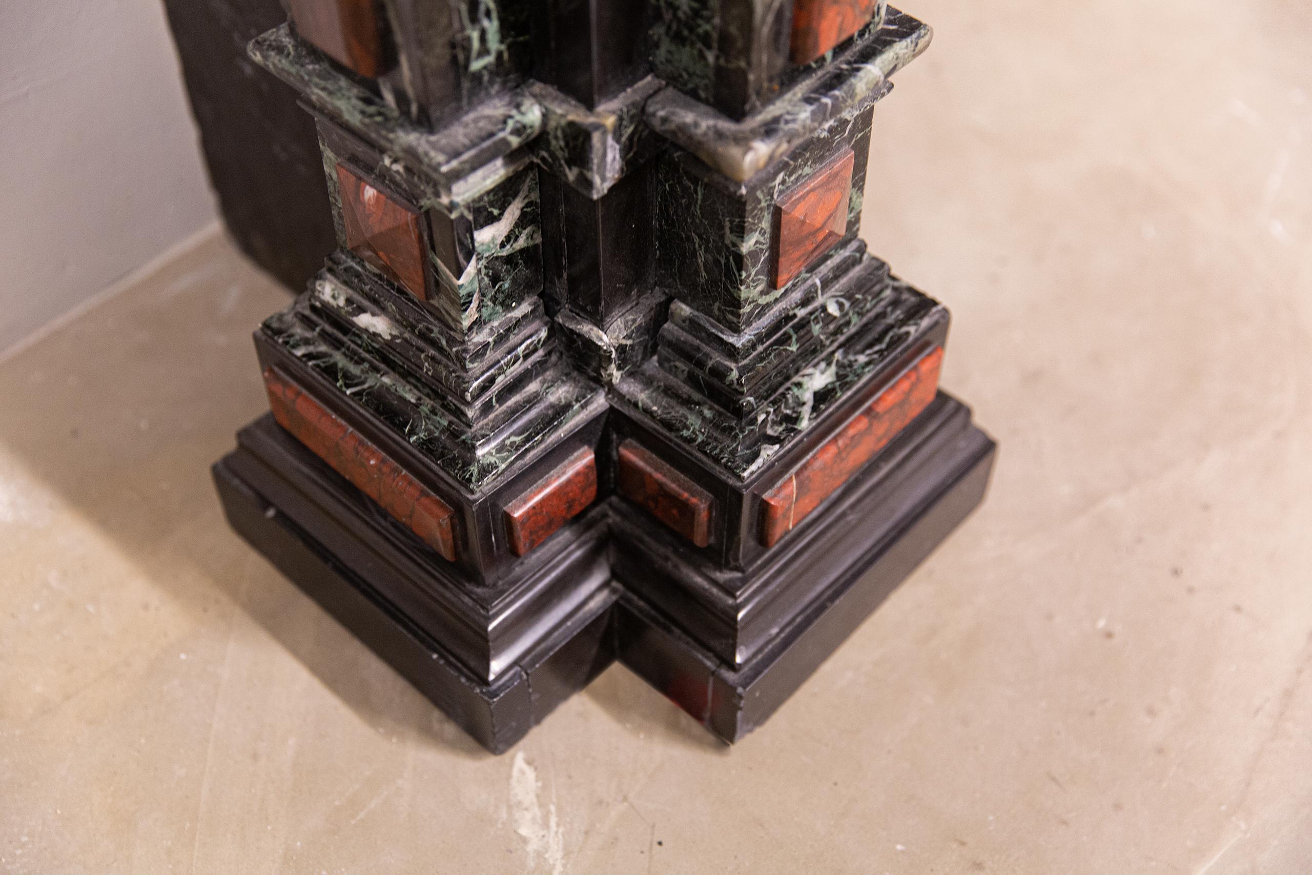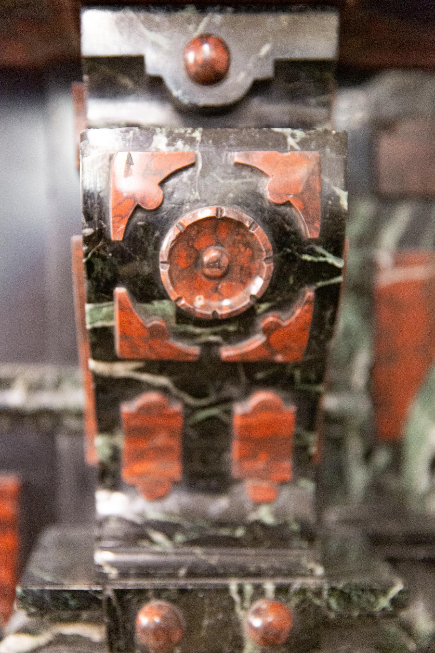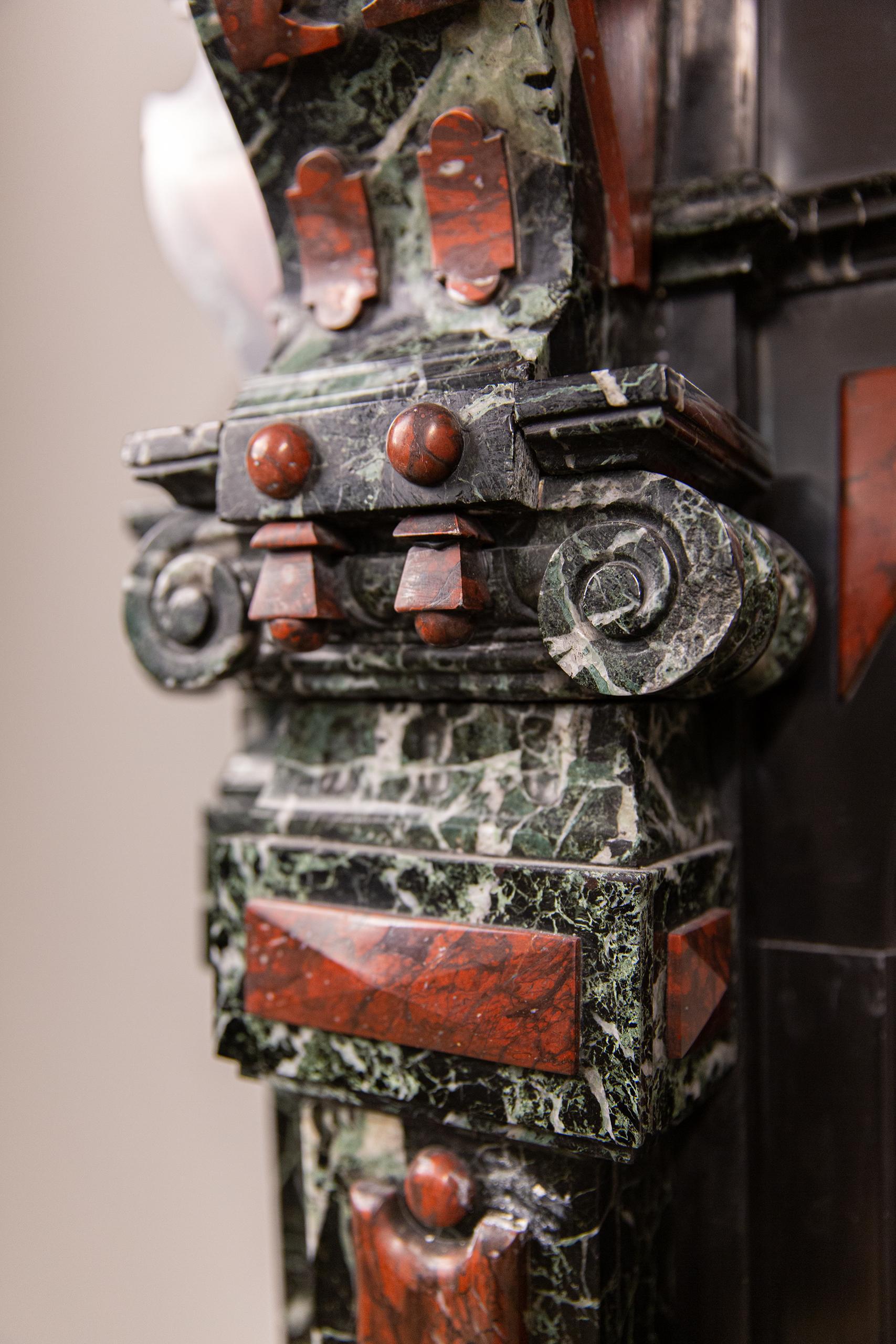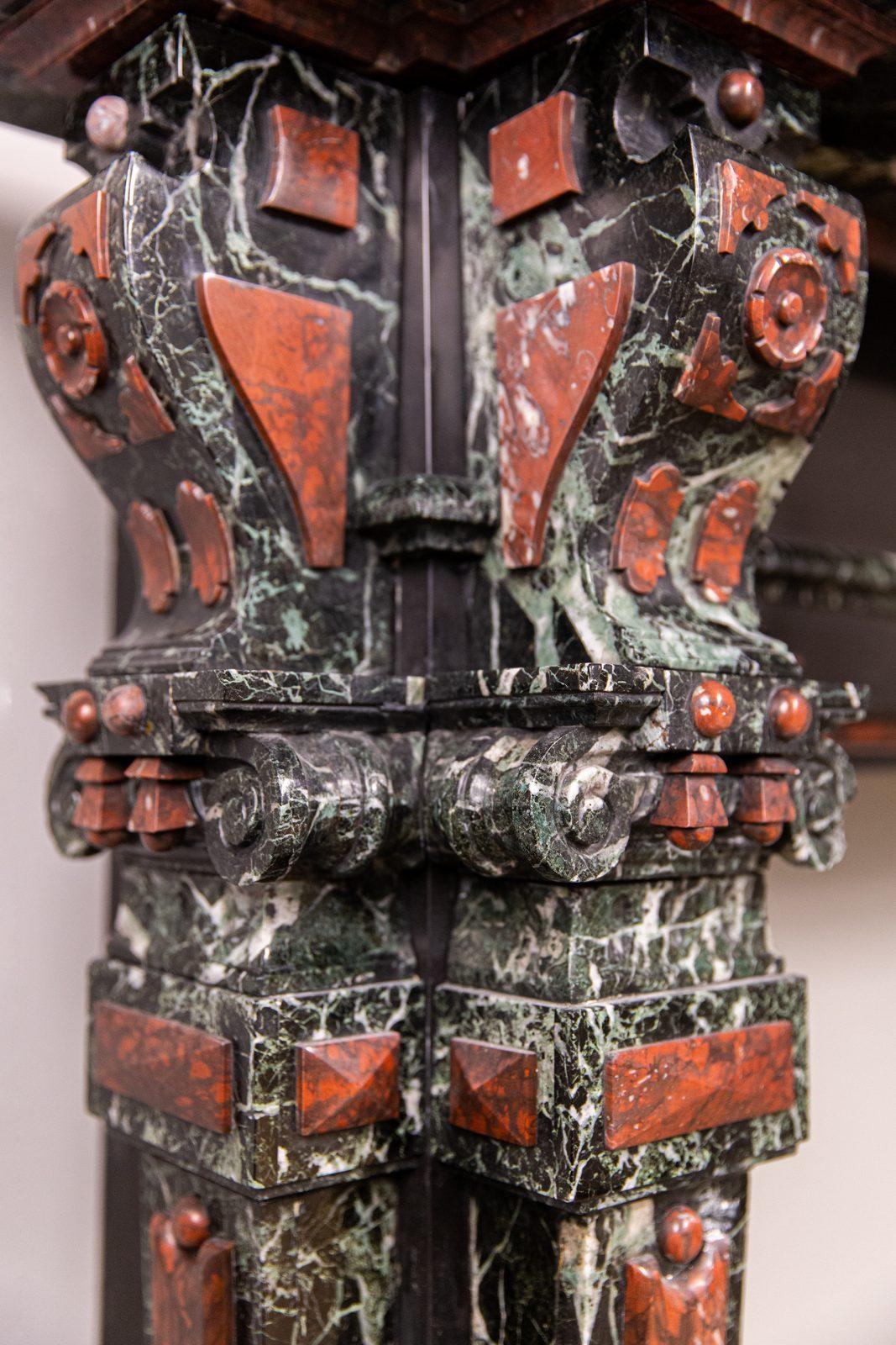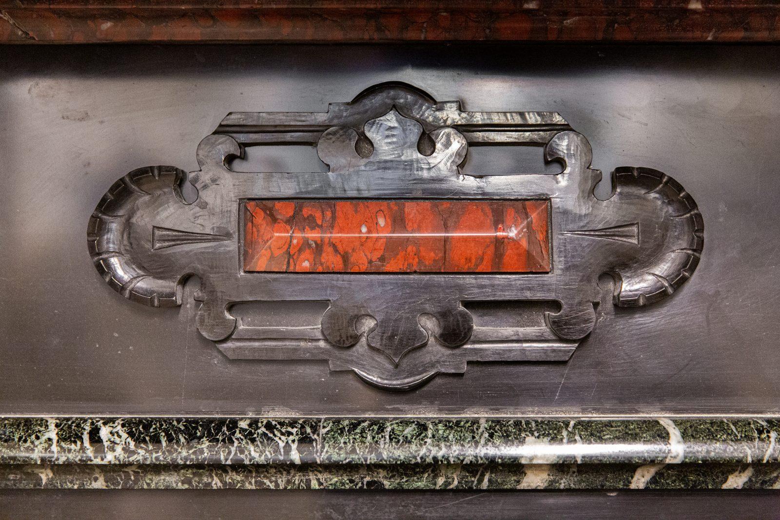 An extravagant appearance this antique black marble fireplace. This fireplace is totally decorated with red and green marble overlays. The details and the amount of work that went into making this fireplace are incomprehensible. The consoles are double, the frame is fully decorated with a round red trim. The top is more layered and made of black and green marble.