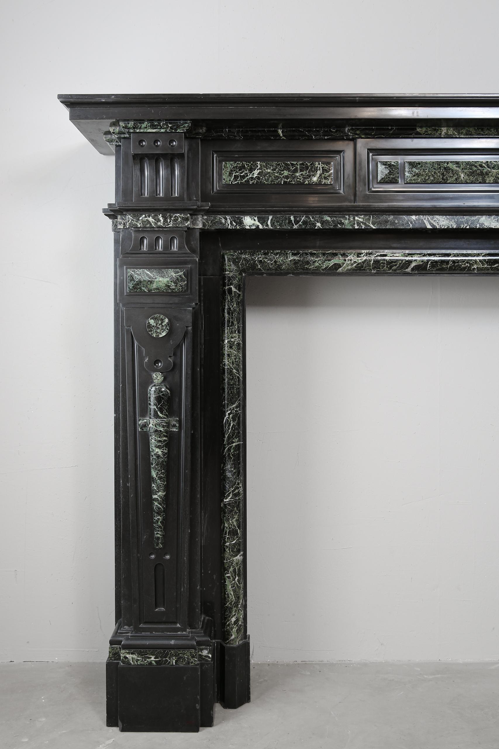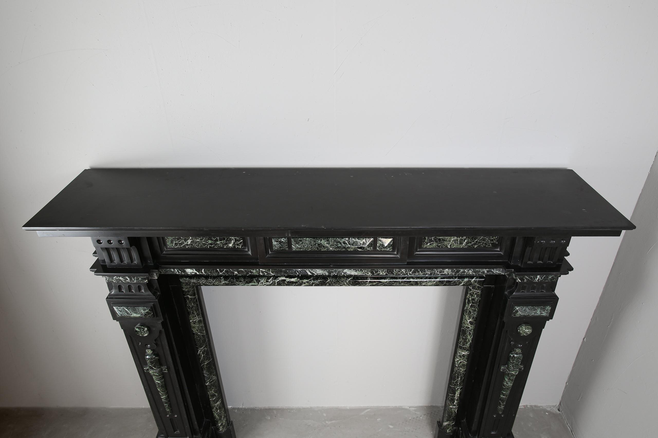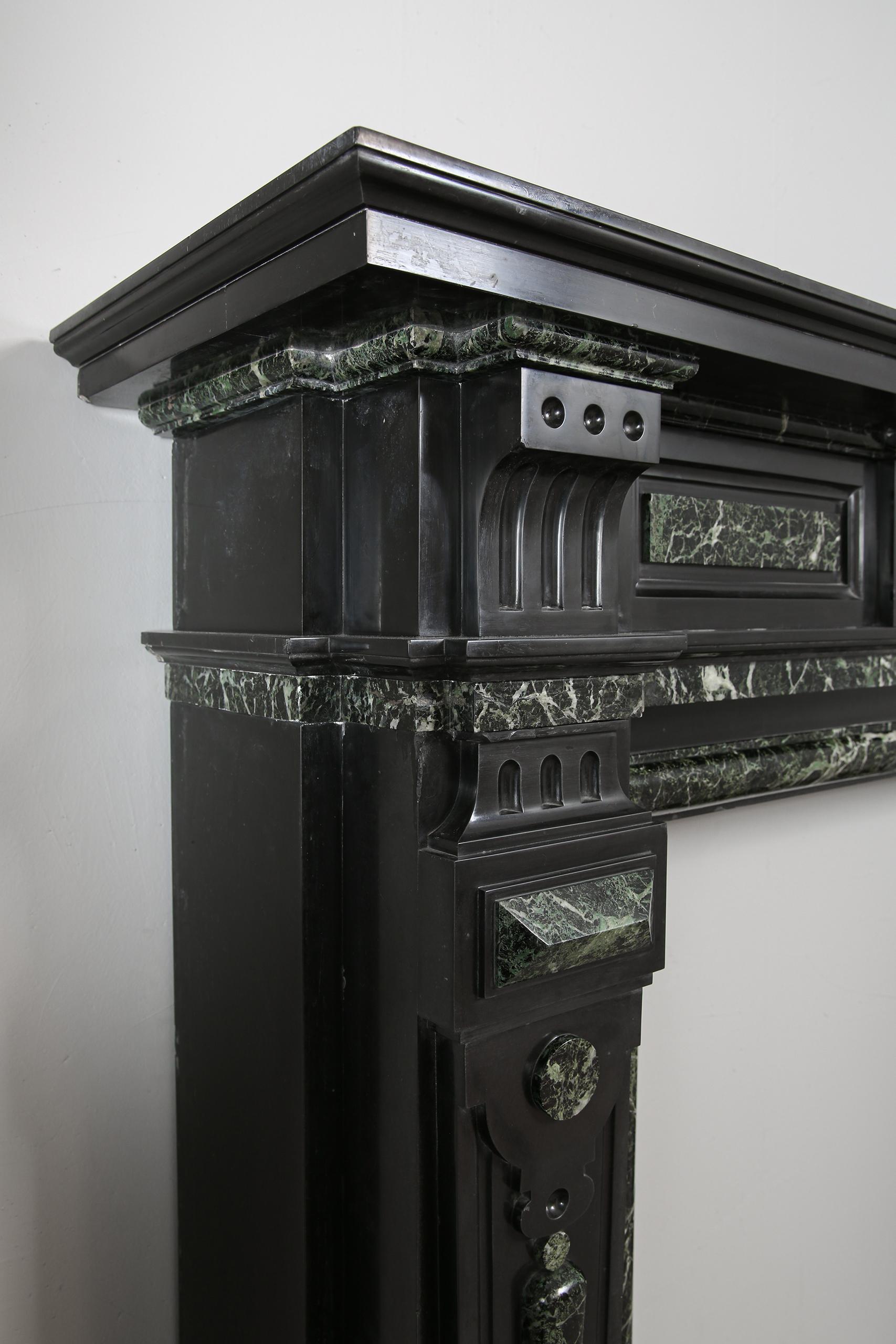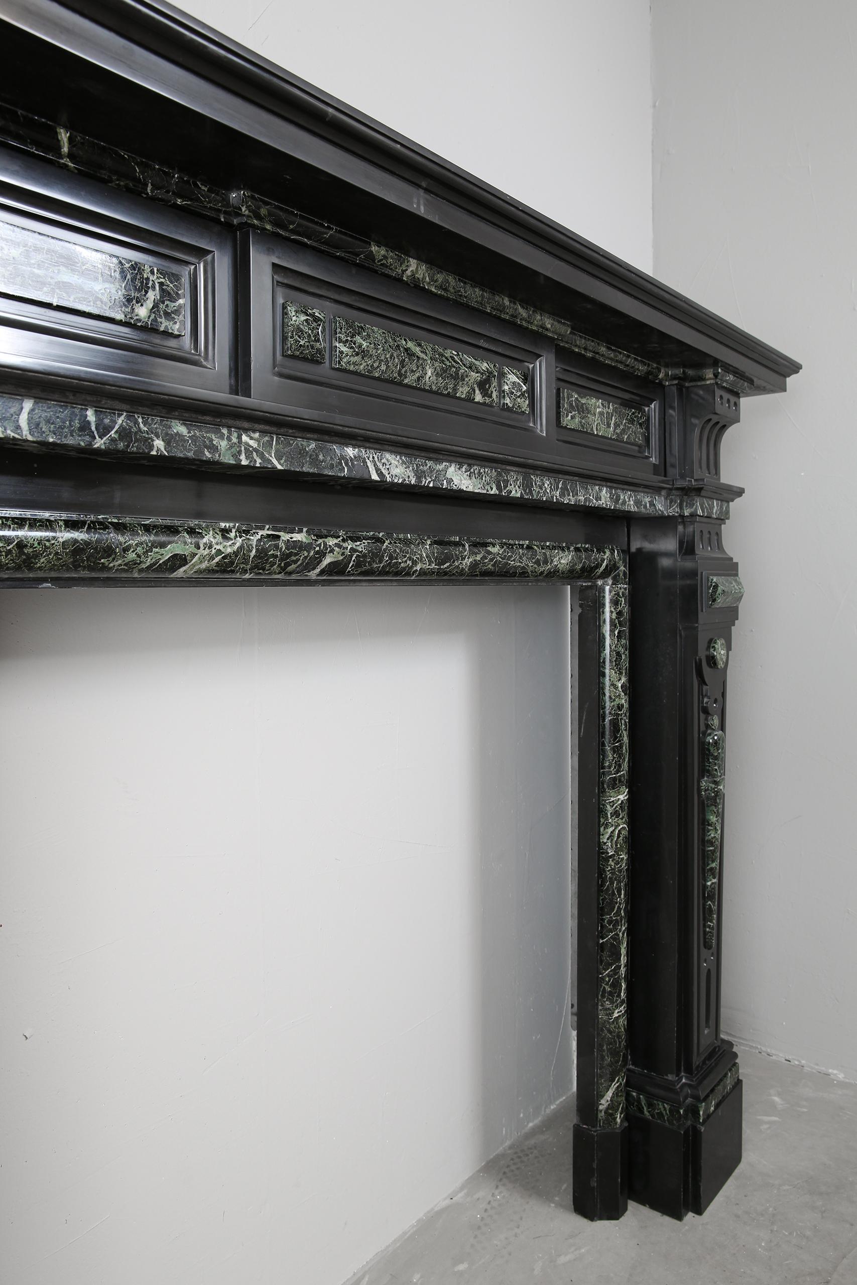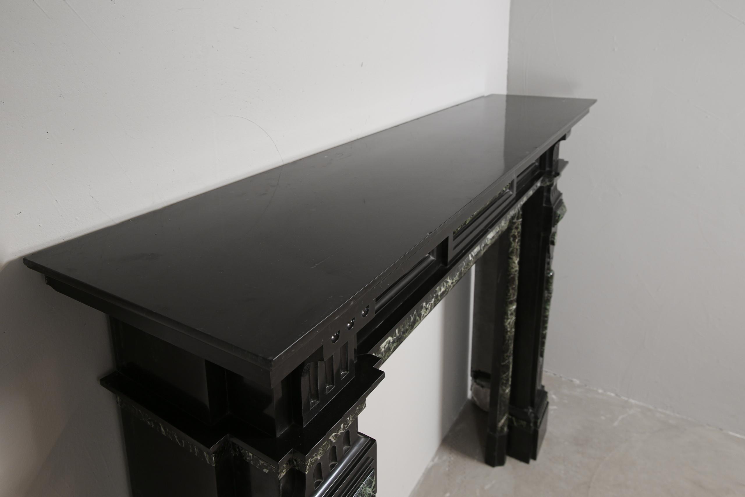 Grand neoclassical black and green marble antique fireplace surround. The quality of the marble on this fireplace is exceptional. The Noir de Mazy black marble has a shine that is not common. The deep shine gives this piece an exceptional appearance. This fantastic fireplace is a special piece in our collection. The Noir de Mazy black marble combined with marble Verde. The details continue from the skirting boards of the consoles to the top, which is finished with green trim. The consoles are really nice, decorated with a wrought iron ornament in green marble. The formats are the fireplace are very special the height and thickness of the marble you do not see every day with this type of fireplaces.