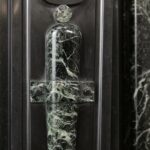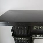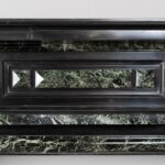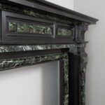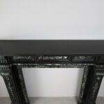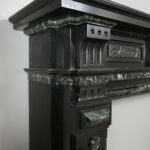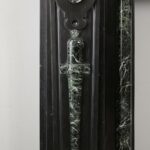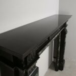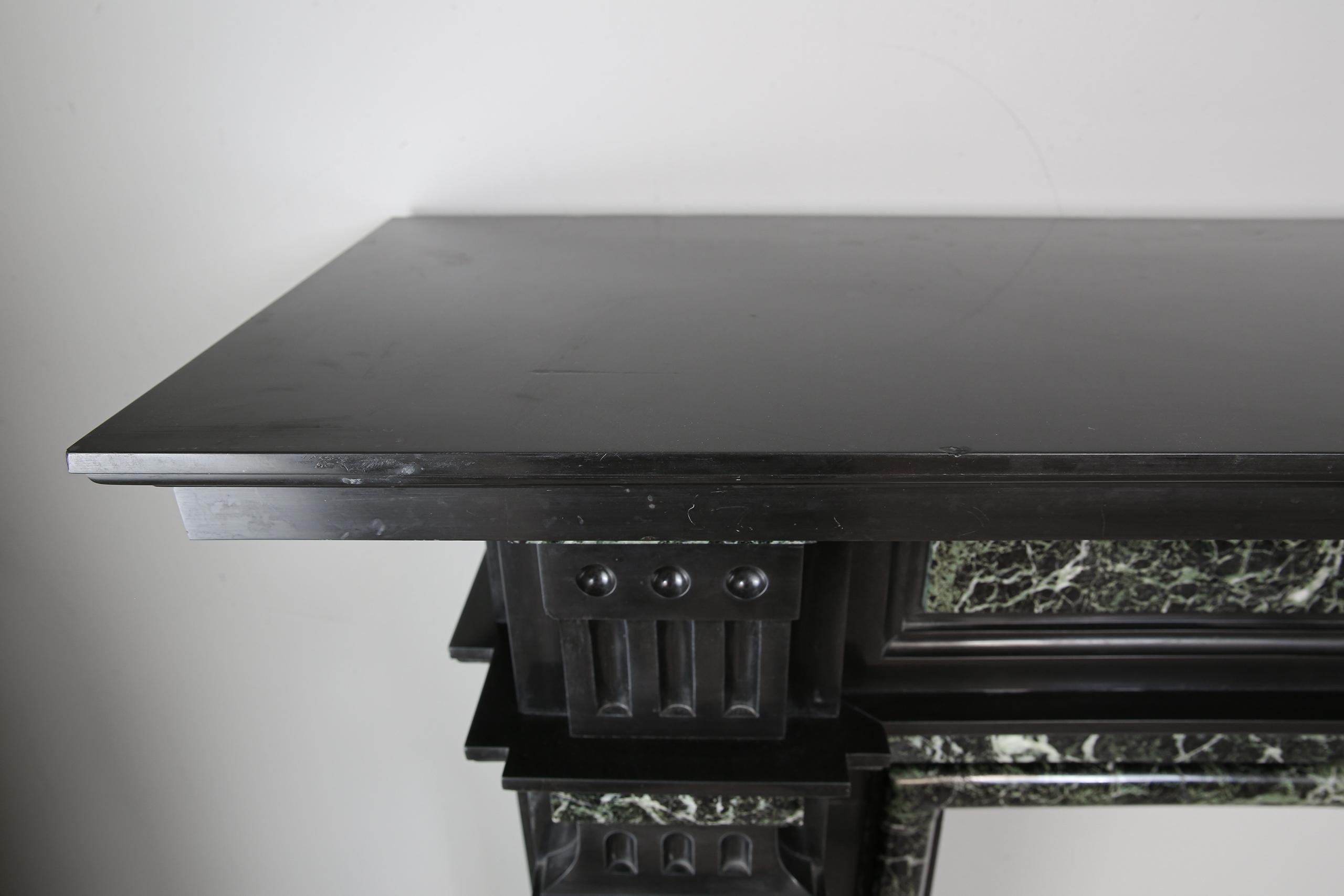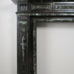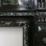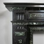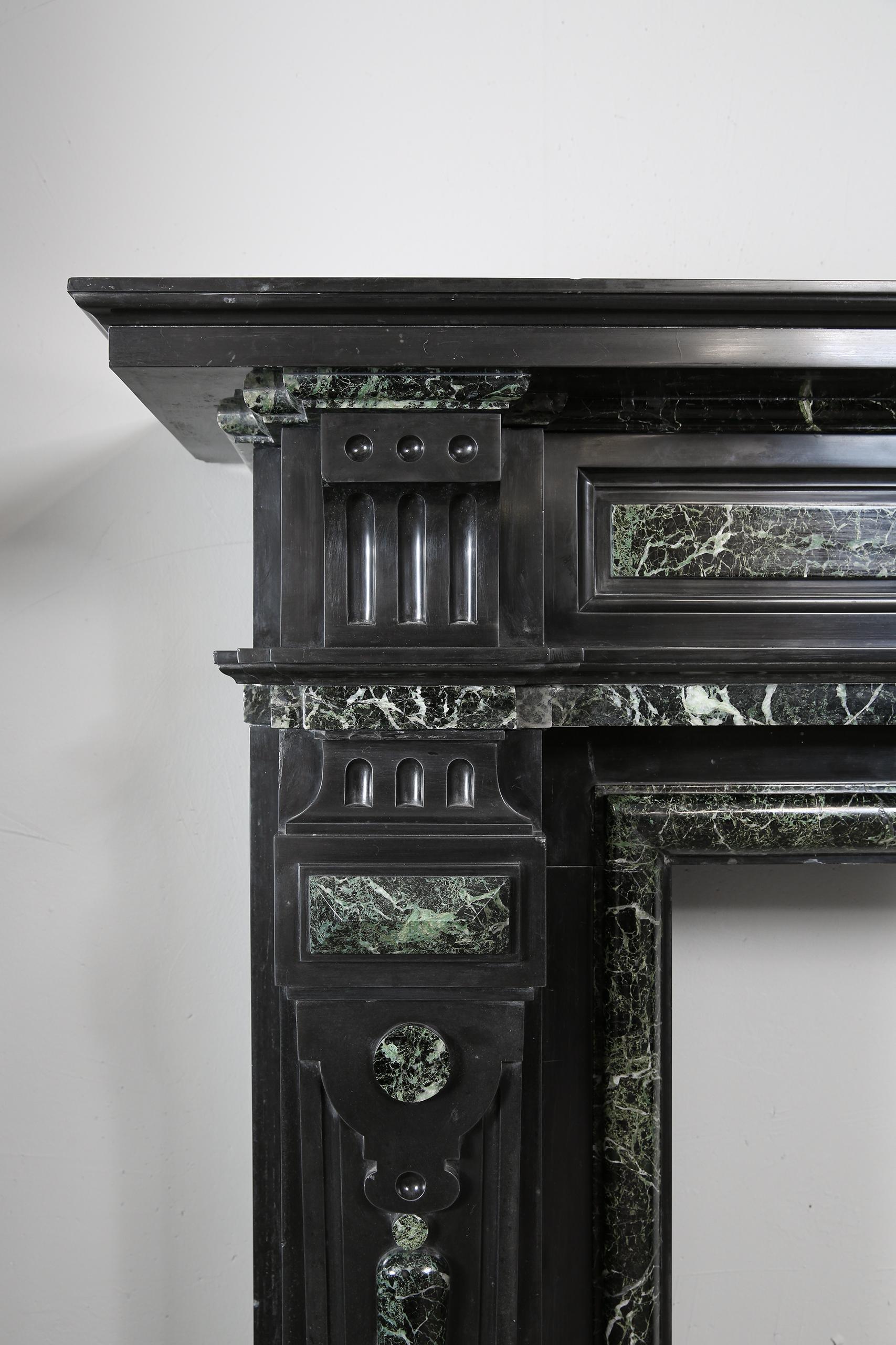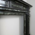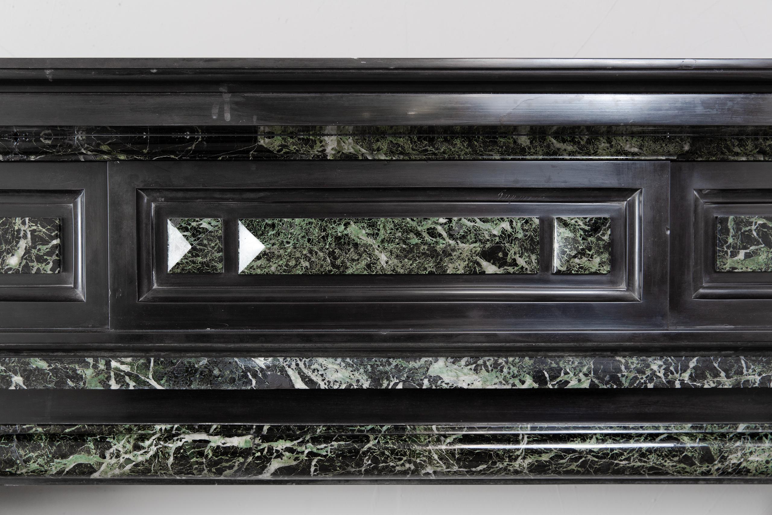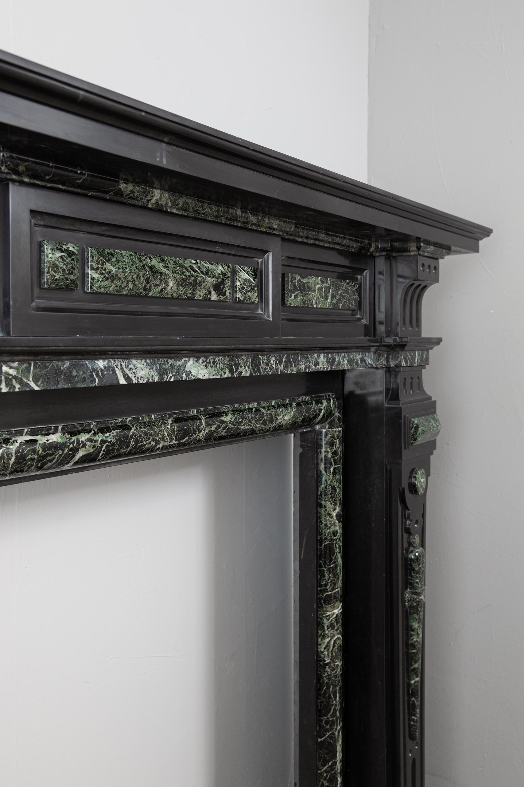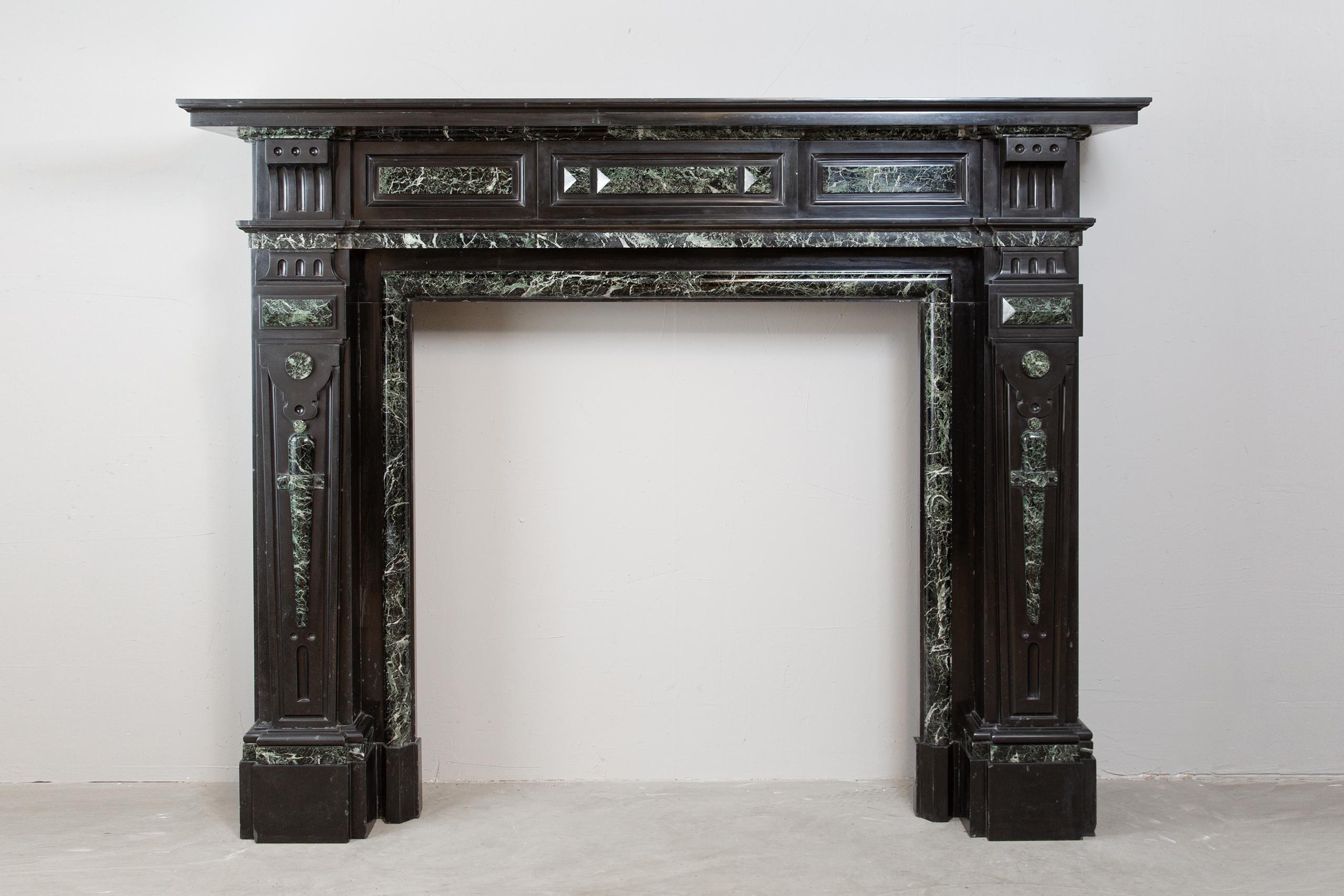 Grand neoclassical black and green marble antique fireplace surround. The quality of the marble on this fireplace is exceptional. The Noir de Mazy black marble has a shine that is not common. The deep shine gives this piece an exceptional appearance. This fantastic fireplace is a special piece in our collection. The Noir de Mazy black marble combined with marble Verde. The details continue from the skirting boards of the consoles to the top, which is finished with green trim. The consoles are really nice, decorated with a wrought iron ornament in green marble. The formats are the fireplace are very special the height and thickness of the marble you do not see every day with this type of fireplaces.