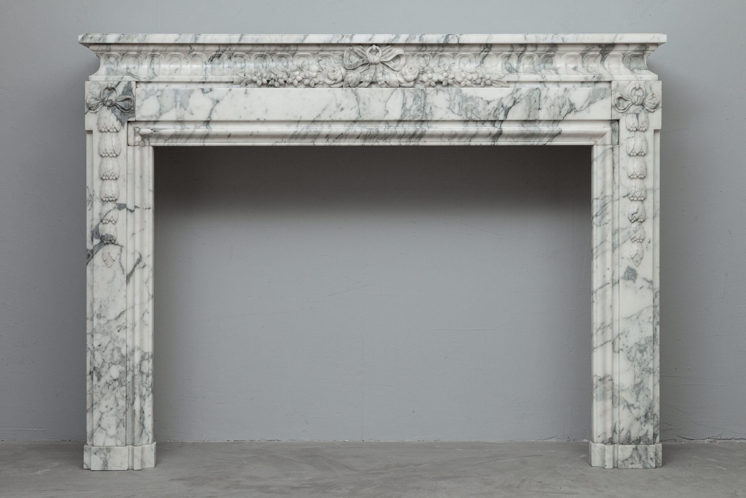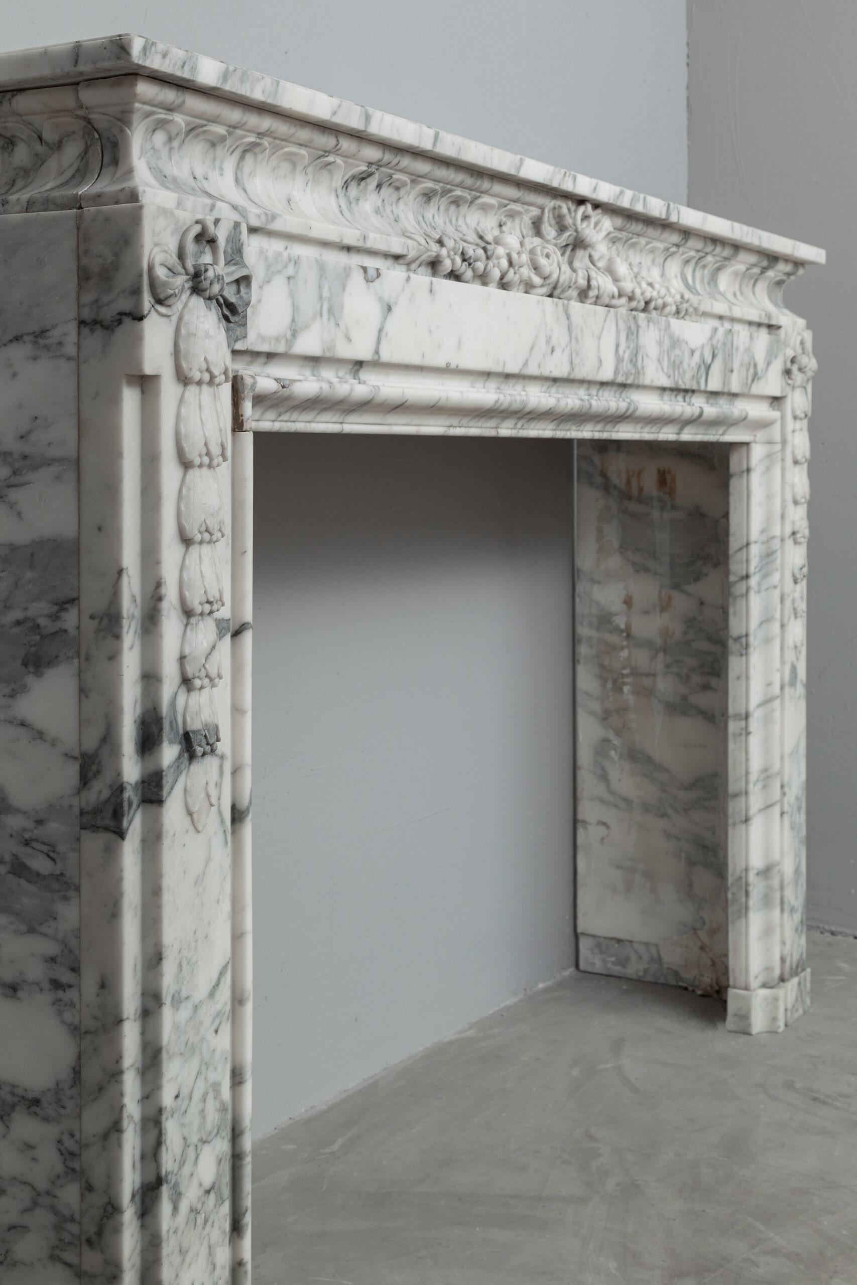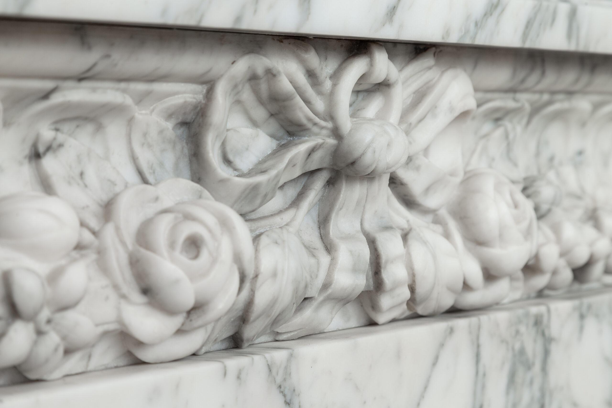 A personal favorite! Everything comes together in this mantelpiece, elegance, style, craftsmanship, and perfectly selected marble. The mantelpiece exudes a kind of softness, with the art deco flower and bow motifs. In the Front, you will find a beautiful bow, cut by a craftsman, decorated with roses and other flowers. The perfect proportions of this mantelpiece and made of this chic marble type make this a real masterpiece. We are very curious about which beautiful home this pearl will end up in.