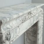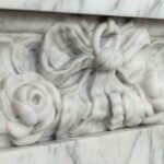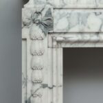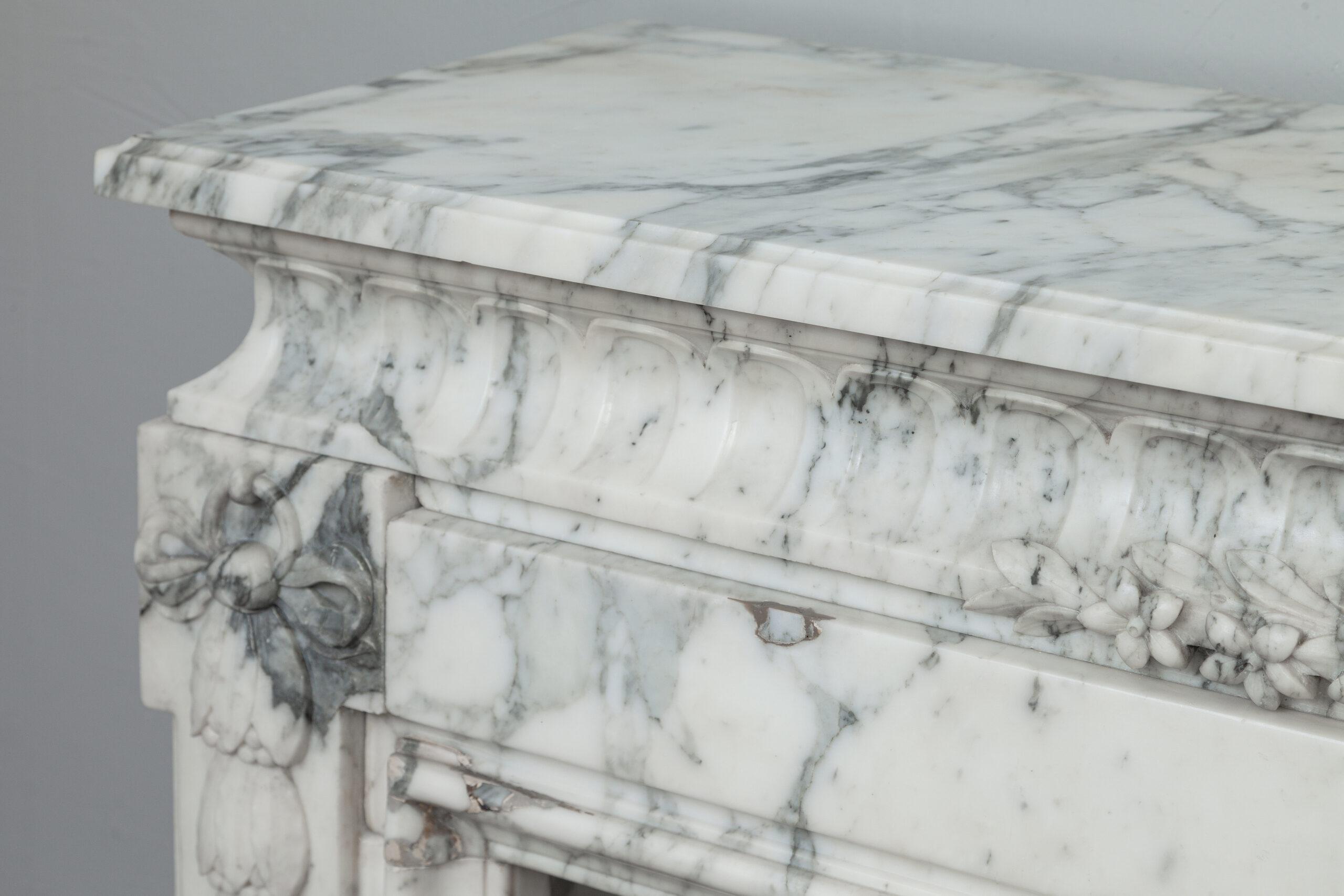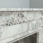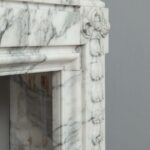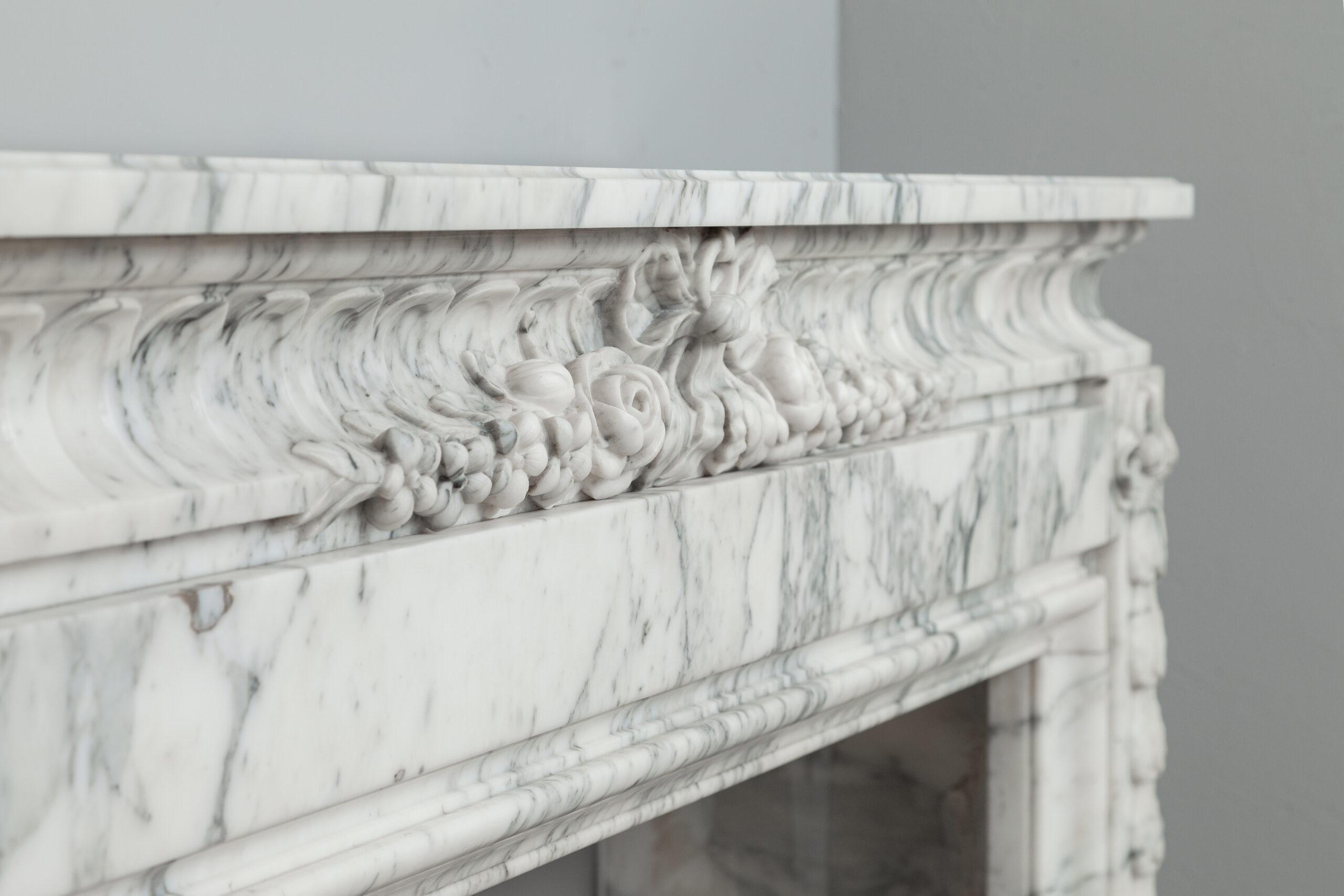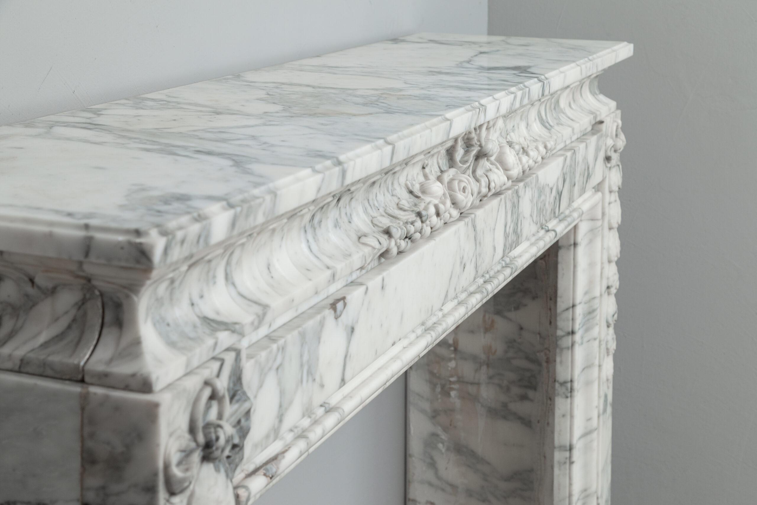 A personal favorite! Everything comes together in this mantelpiece, elegance, style, craftsmanship, and perfectly selected marble. The mantelpiece exudes a kind of softness, with the art deco flower and bow motifs. In the Front, you will find a beautiful bow, cut by a craftsman, decorated with roses and other flowers. The perfect proportions of this mantelpiece and made of this chic marble type make this a real masterpiece. We are very curious about which beautiful home this pearl will end up in.