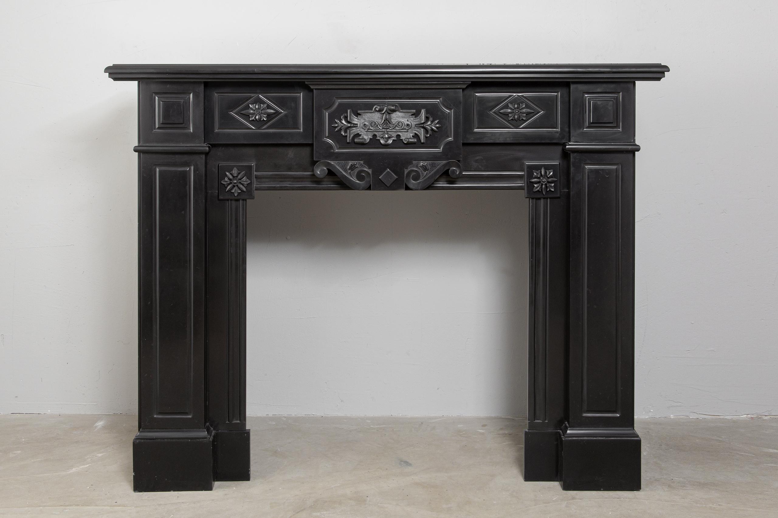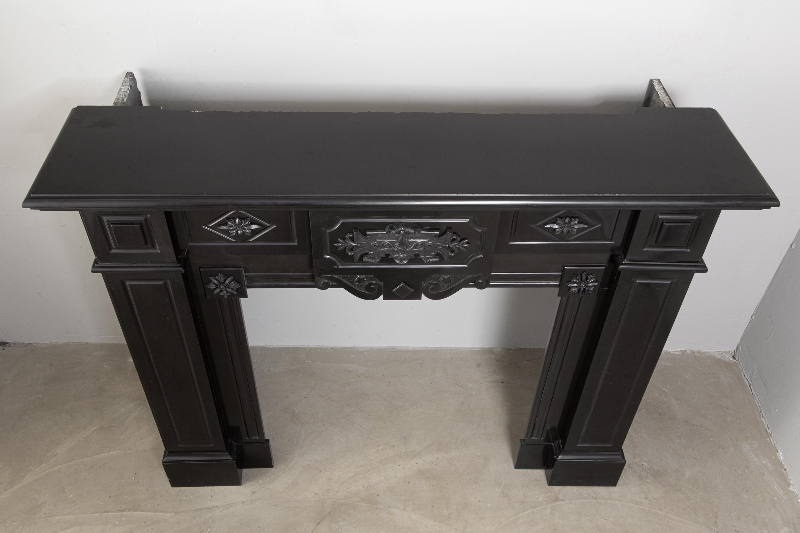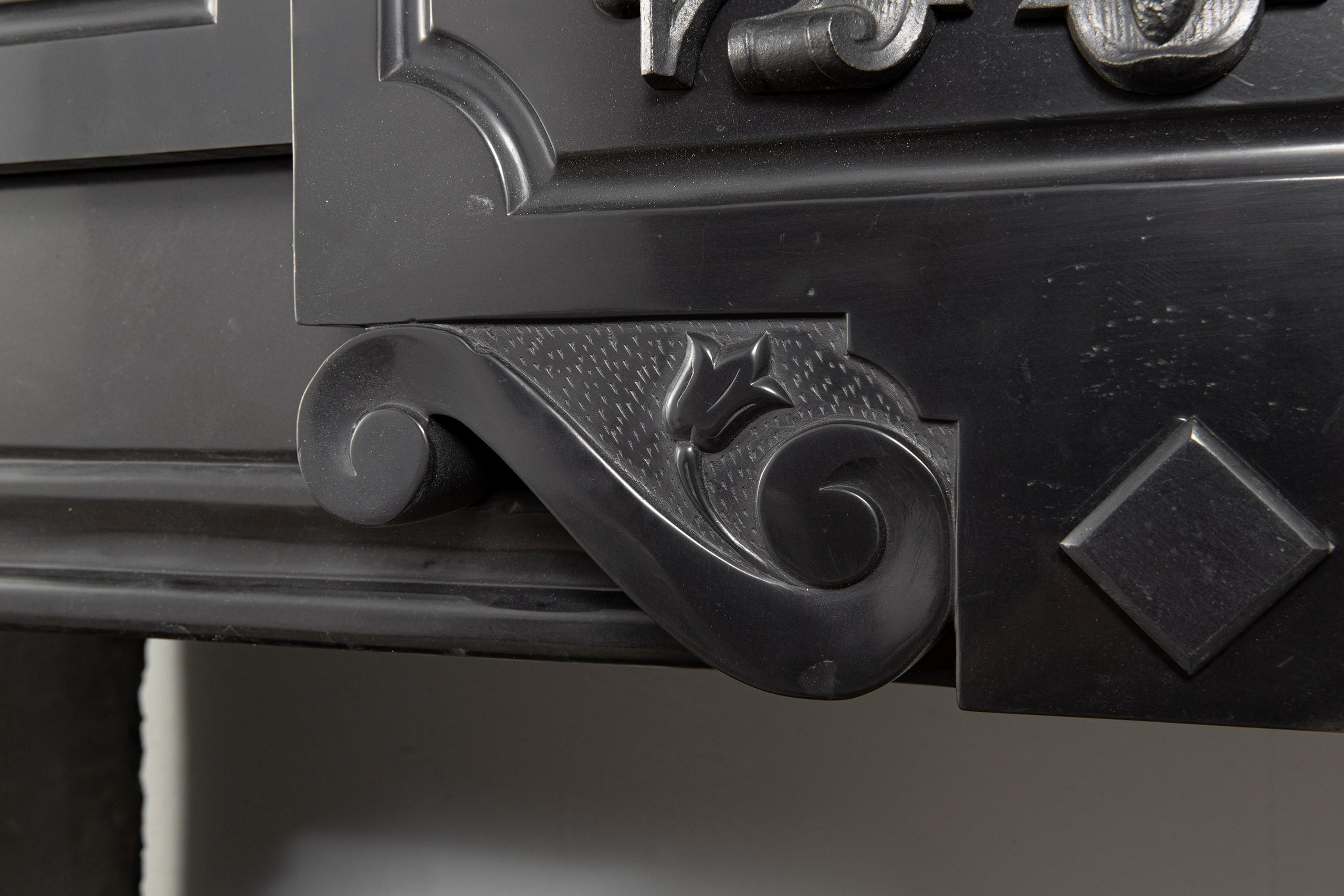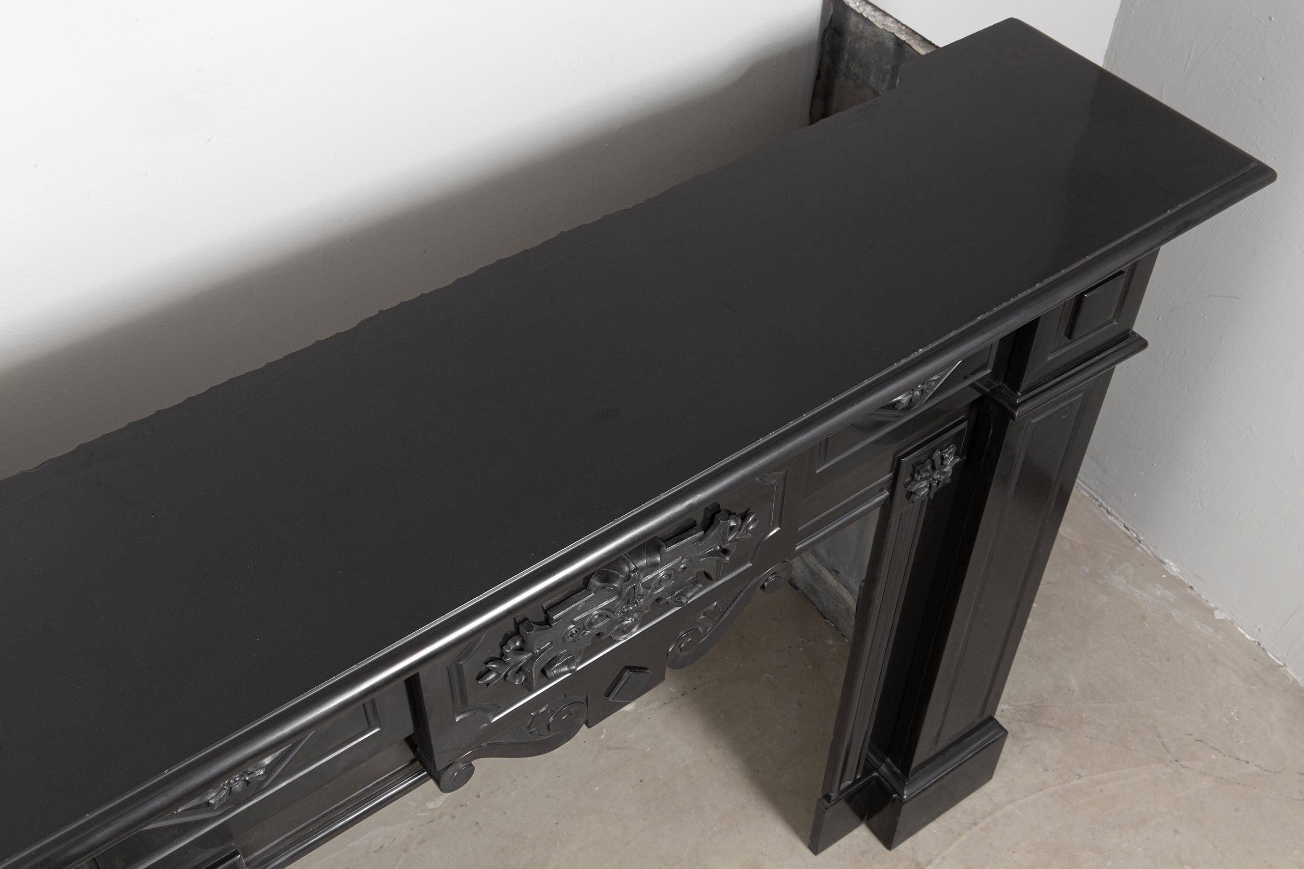 A Unique antique black marble fireplace. The fireplace is in beautiful condition. Richly decorated with iron attachments, these ornaments give the fireplace a powerful appearance. The detailing and quality of the fireplace are really beautiful. This fireplace comes from a large canal house in the Netherlands, where they decorated the front and backrooms.