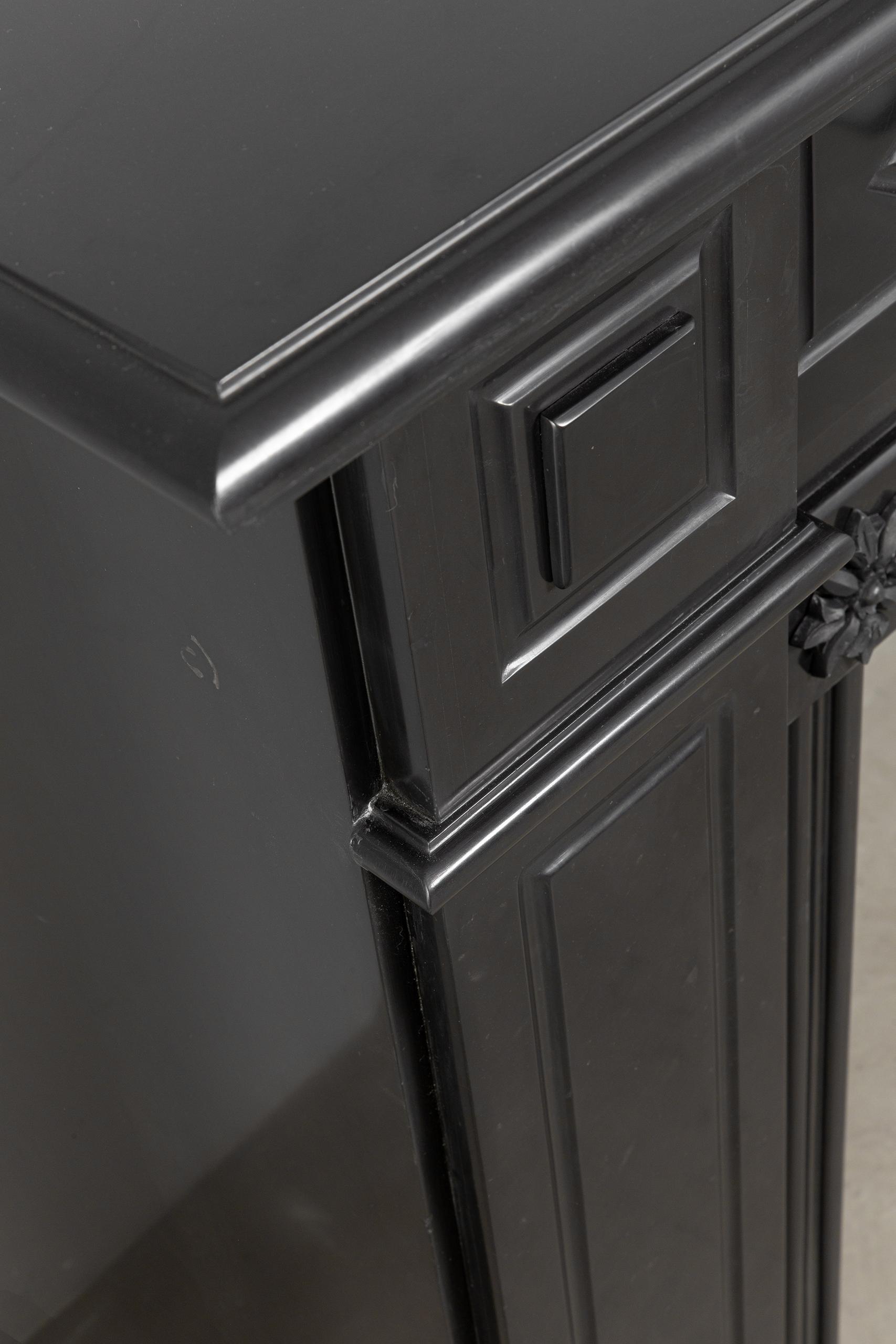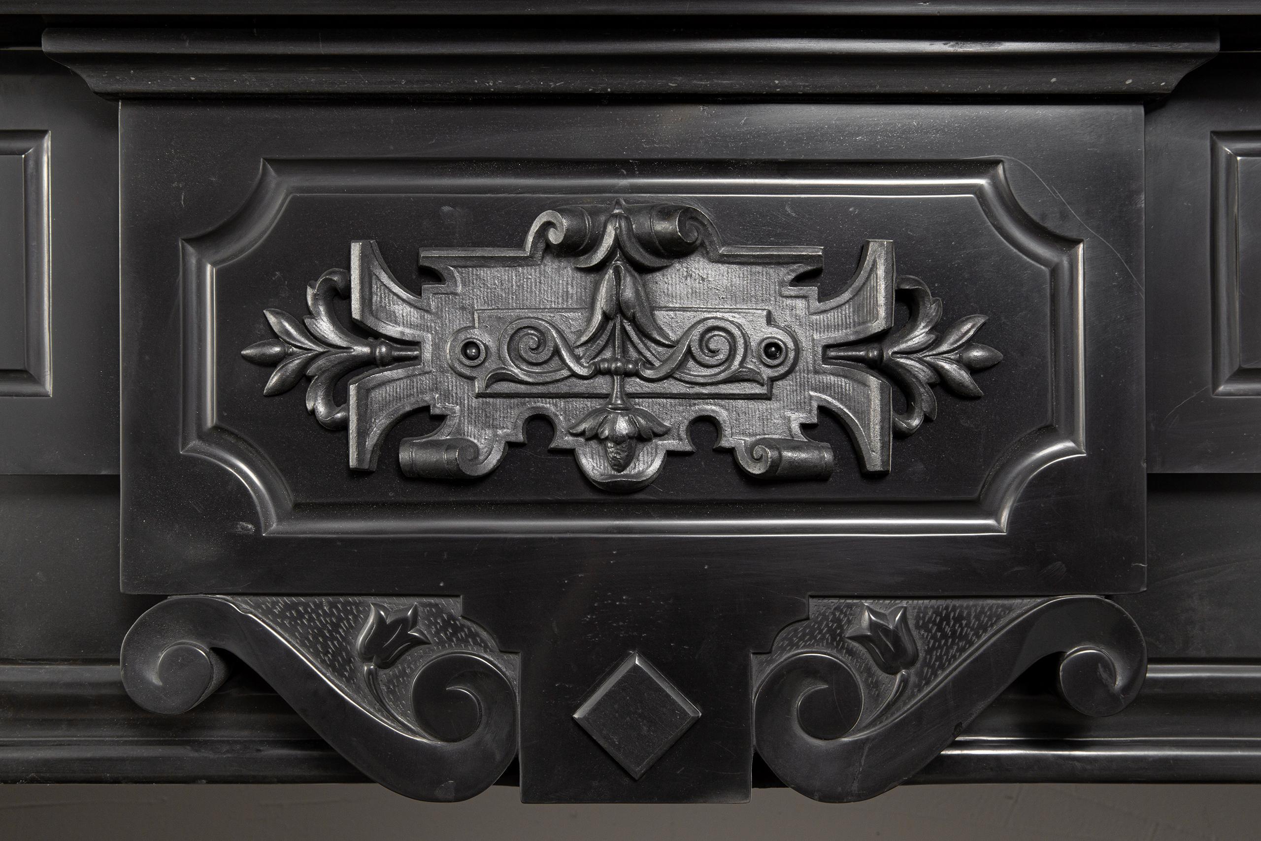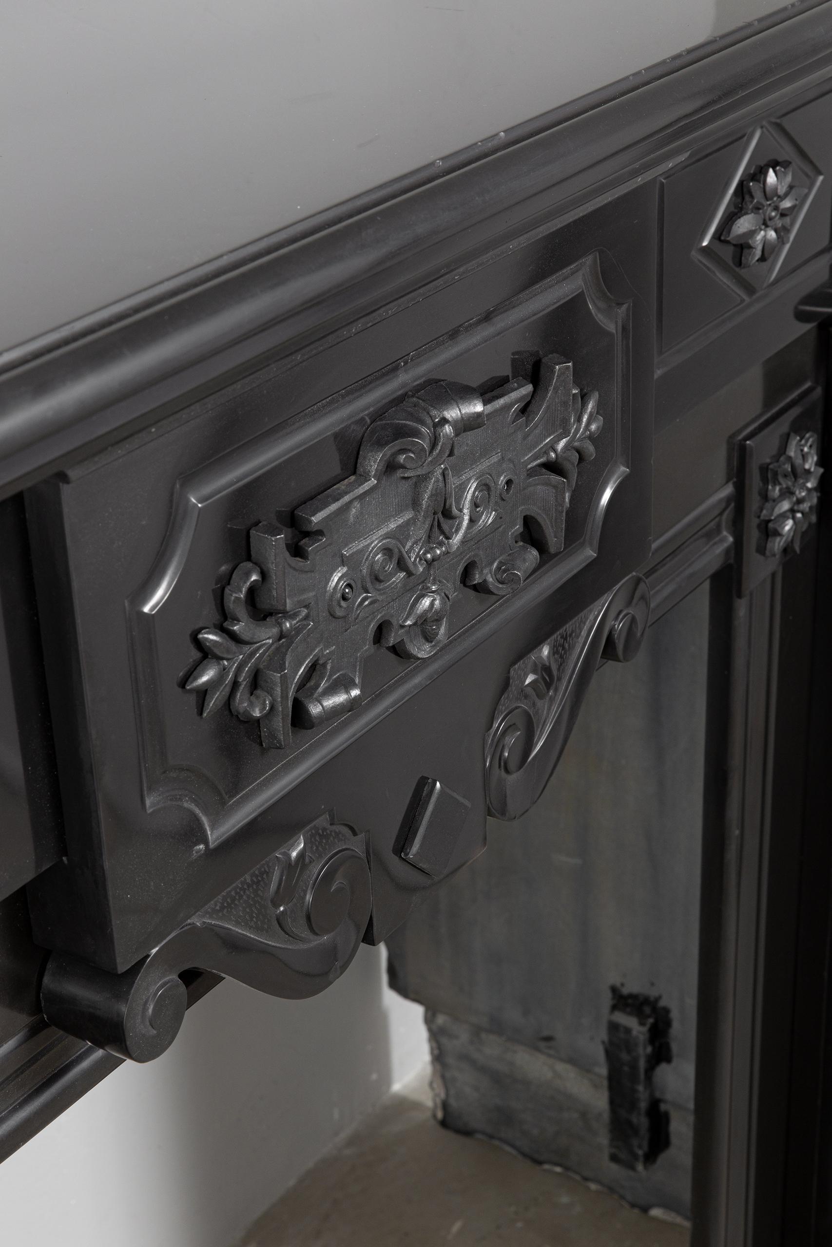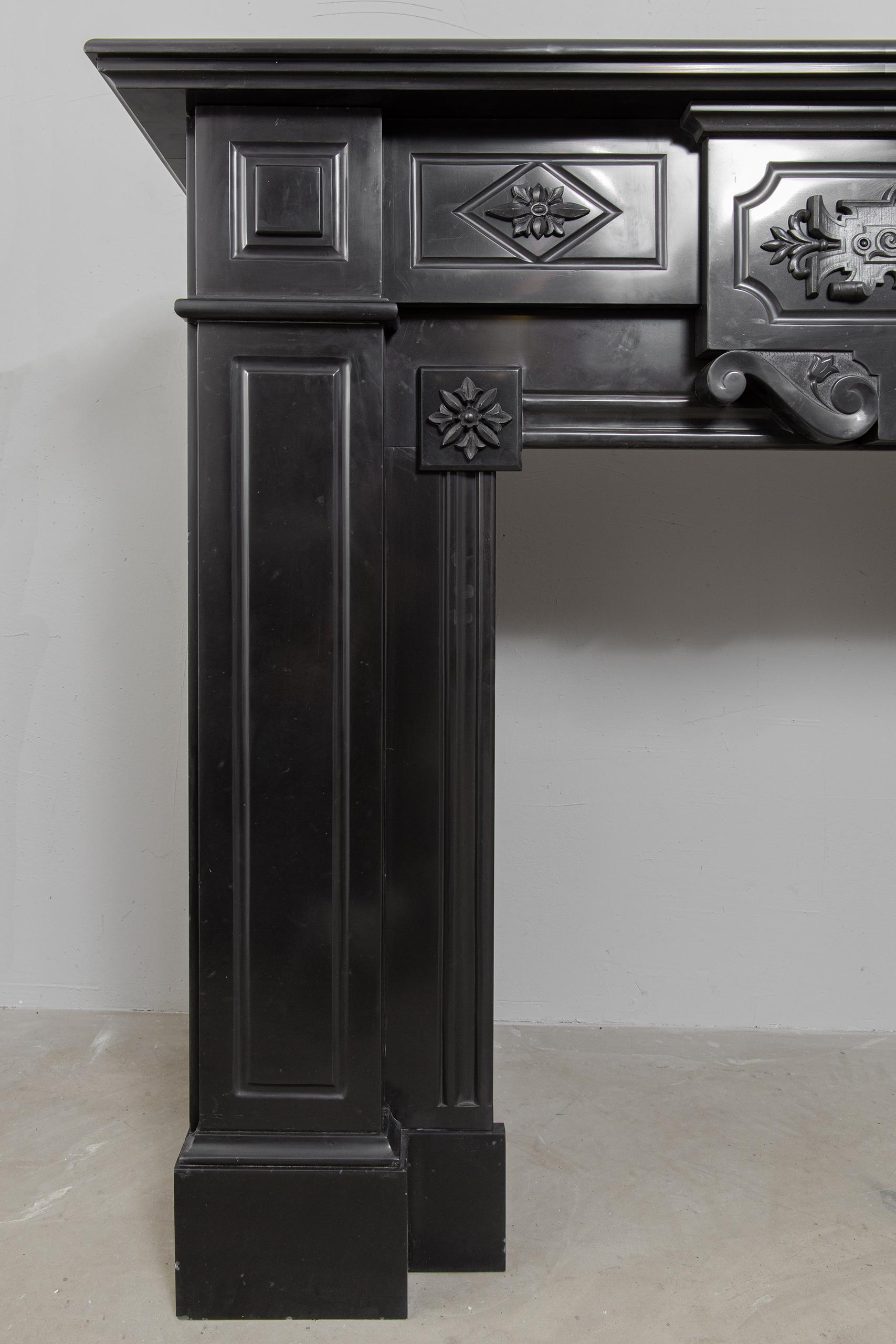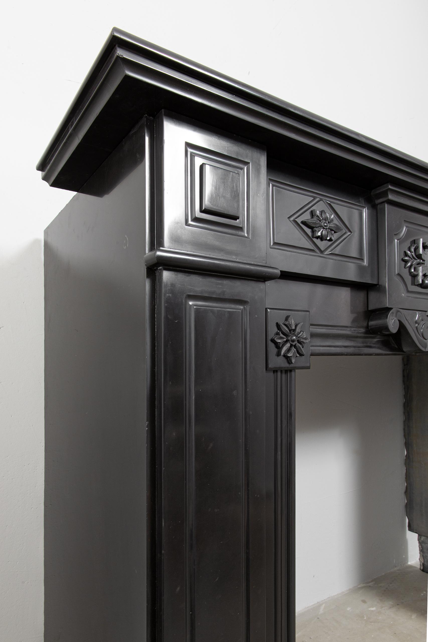 A Unique antique black marble fireplace. The fireplace is in beautiful condition. Richly decorated with iron attachments, these ornaments give the fireplace a powerful appearance. The detailing and quality of the fireplace are really beautiful. This fireplace comes from a large canal house in the Netherlands, where they decorated the front and backrooms.