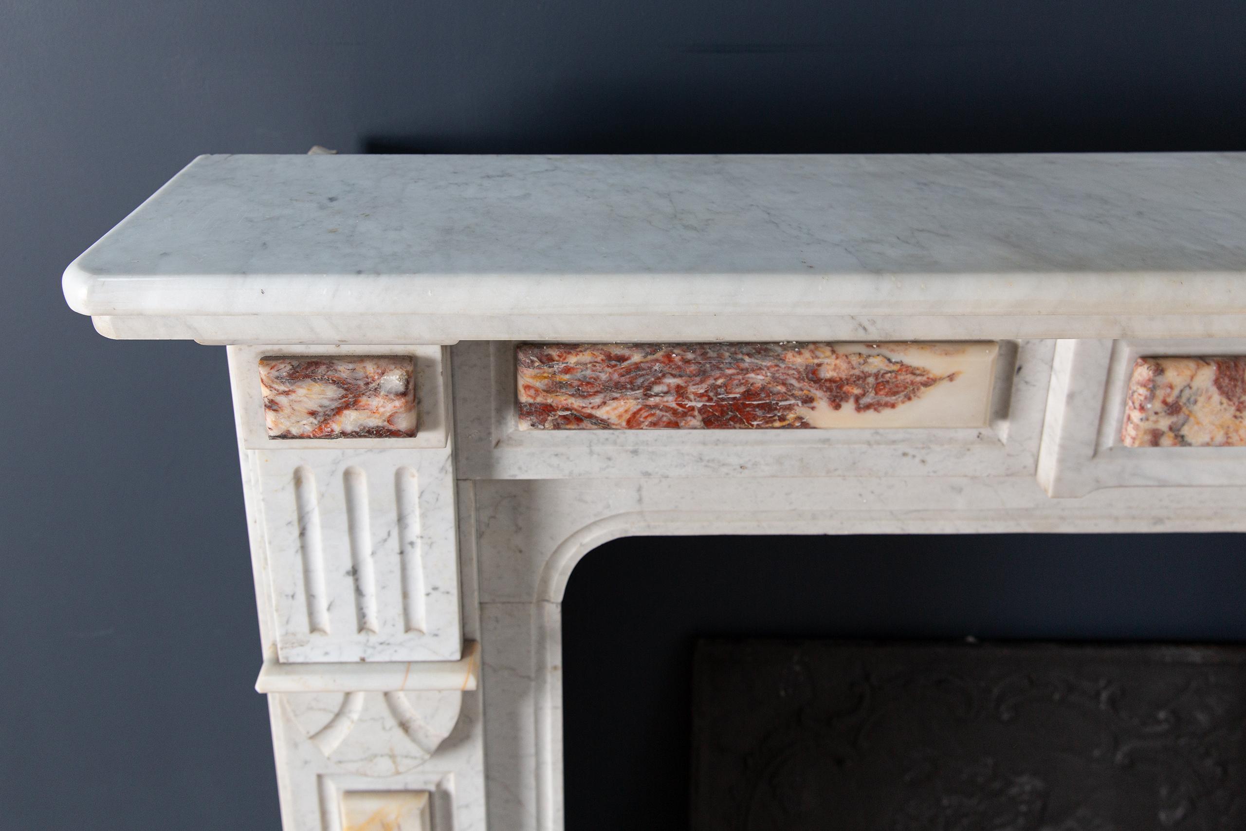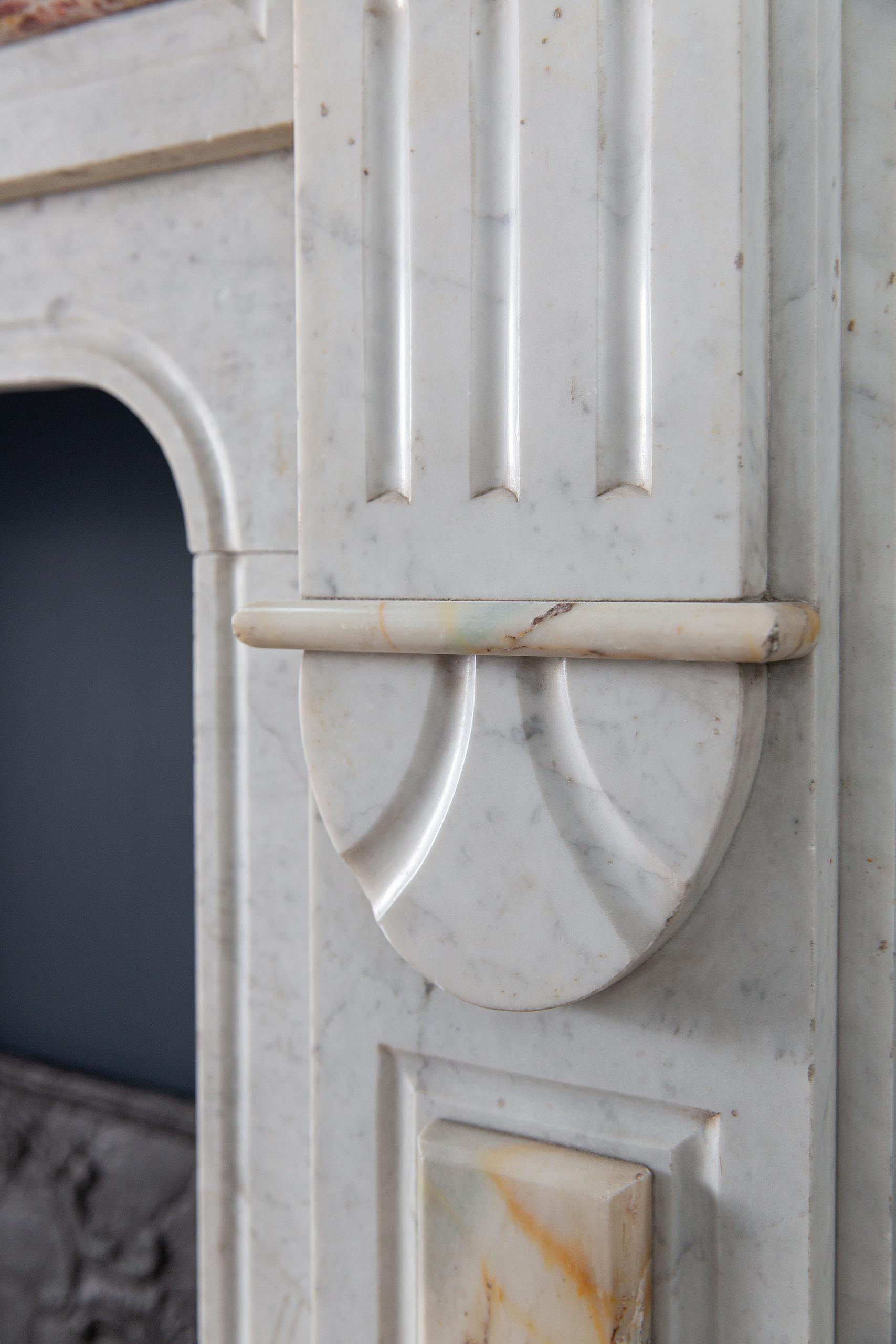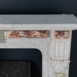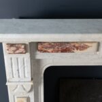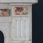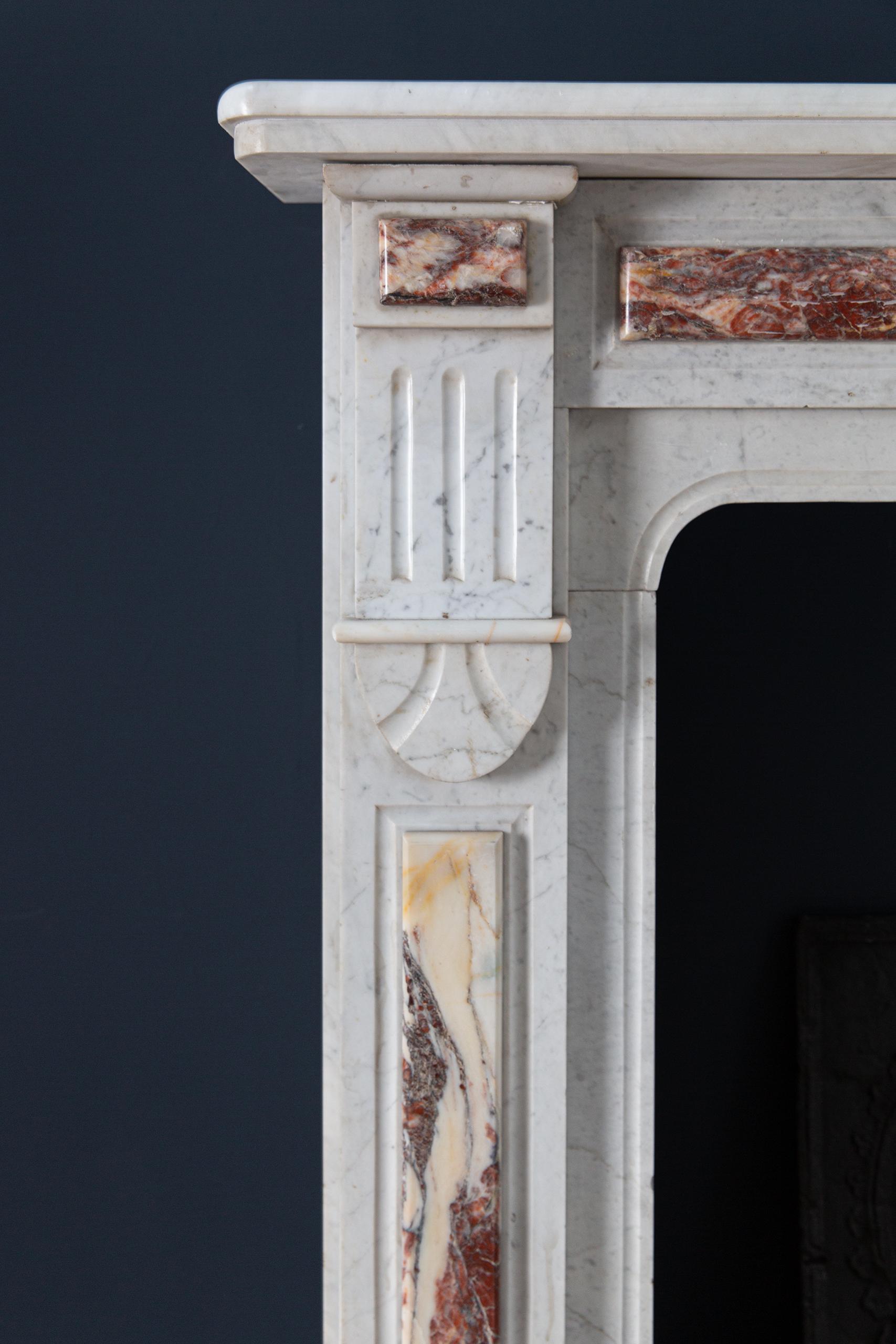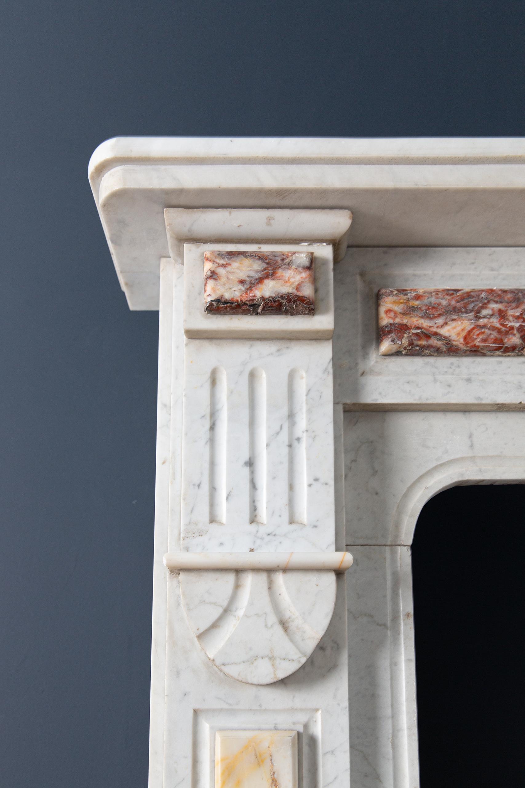 White Marble Antique Neoclassical French Turning Fireplace. An antique fireplace made of Carrara marble. The fireplace is decorated with red marble attachments which give this fireplace a unique look. The fireplace is richly decorated not only by the termination pieces but also by profiling on the consoles and the inner frame.