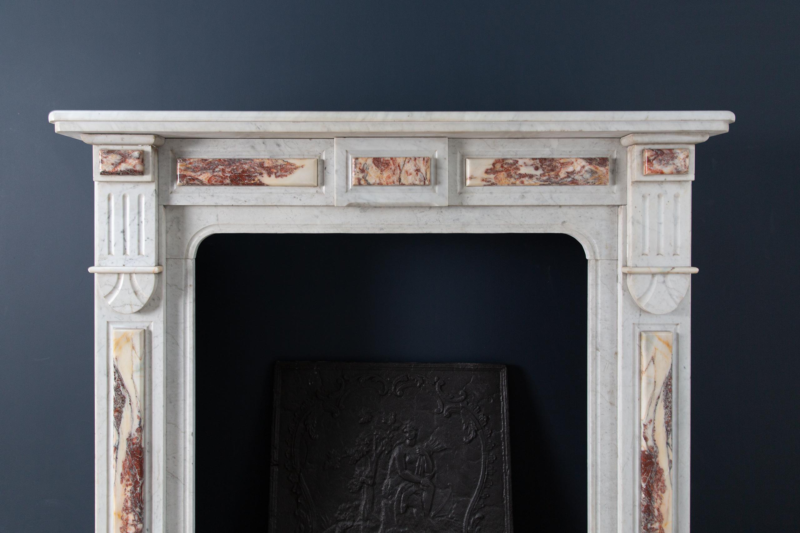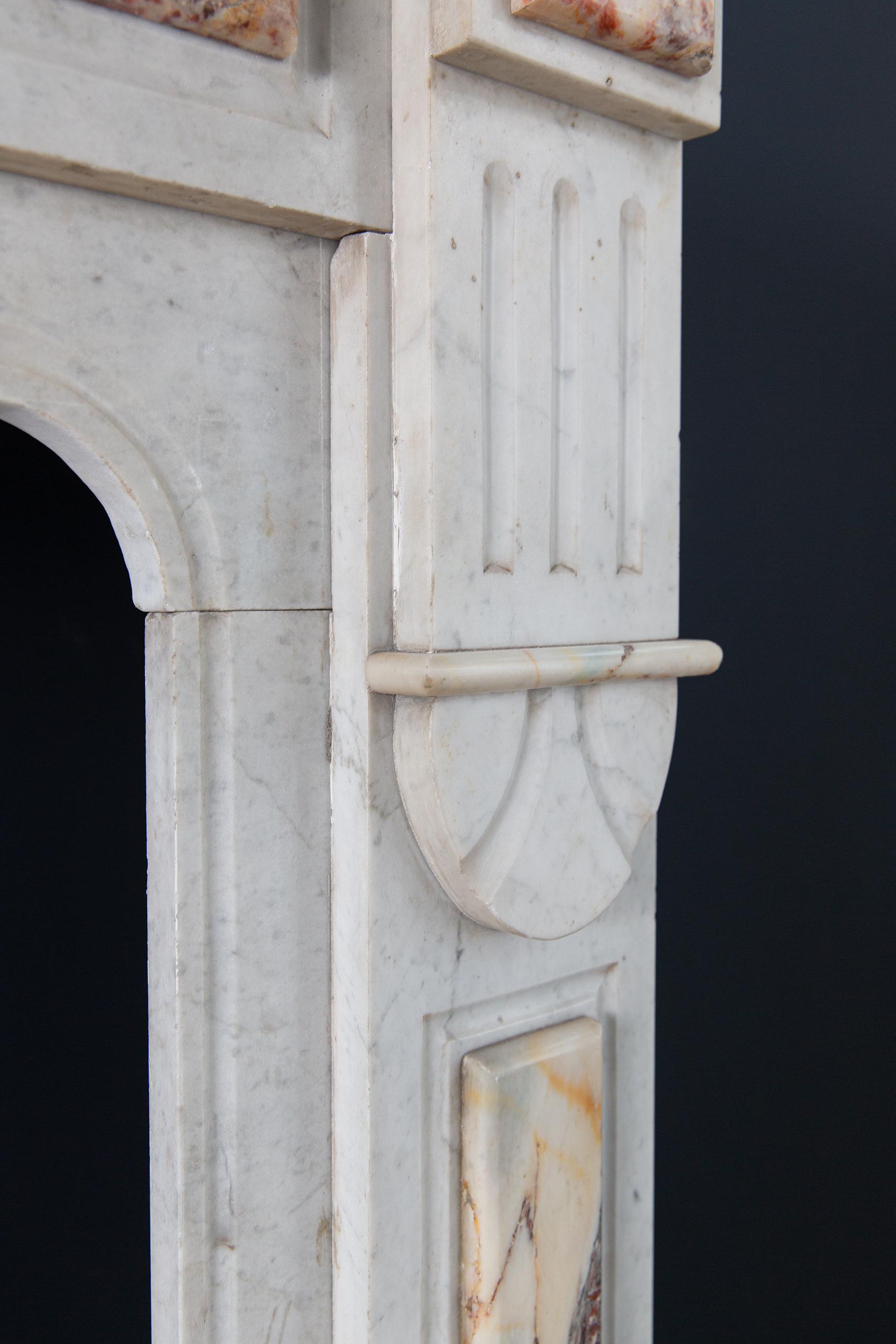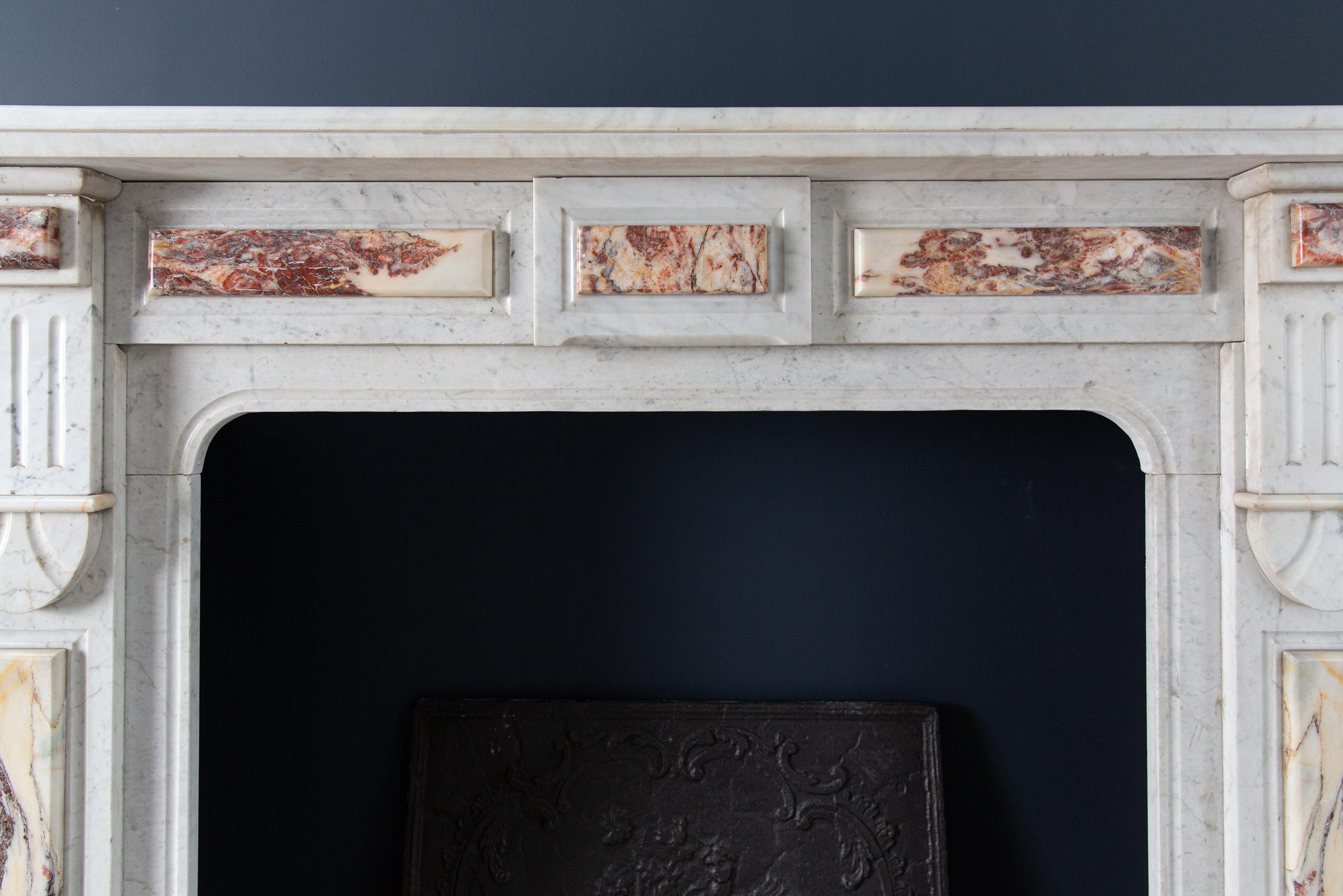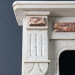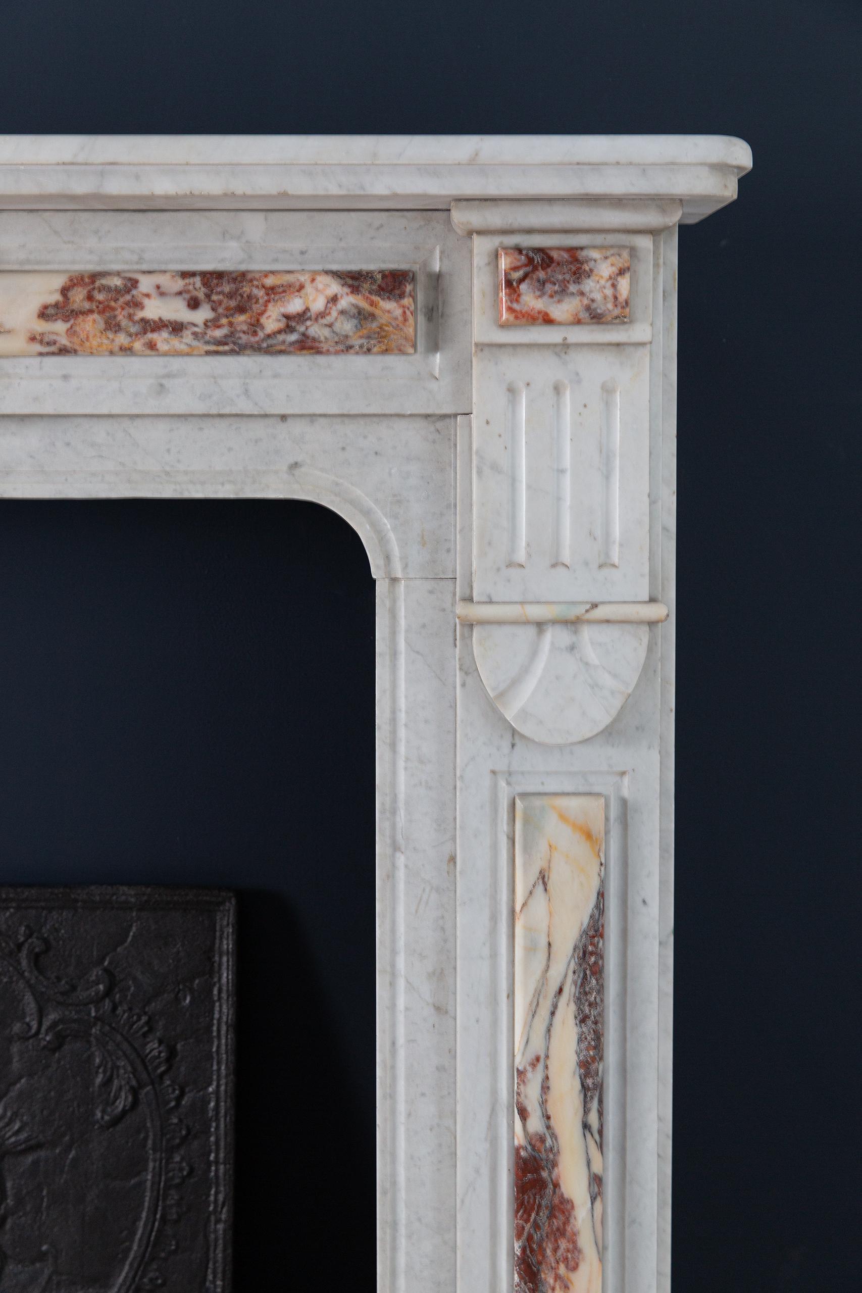 White Marble Antique Neoclassical French Turning Fireplace. An antique fireplace made of Carrara marble. The fireplace is decorated with red marble attachments which give this fireplace a unique look. The fireplace is richly decorated not only by the termination pieces but also by profiling on the consoles and the inner frame.