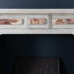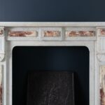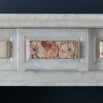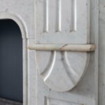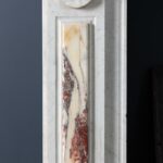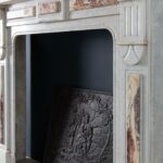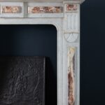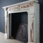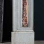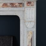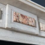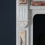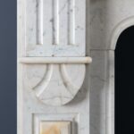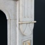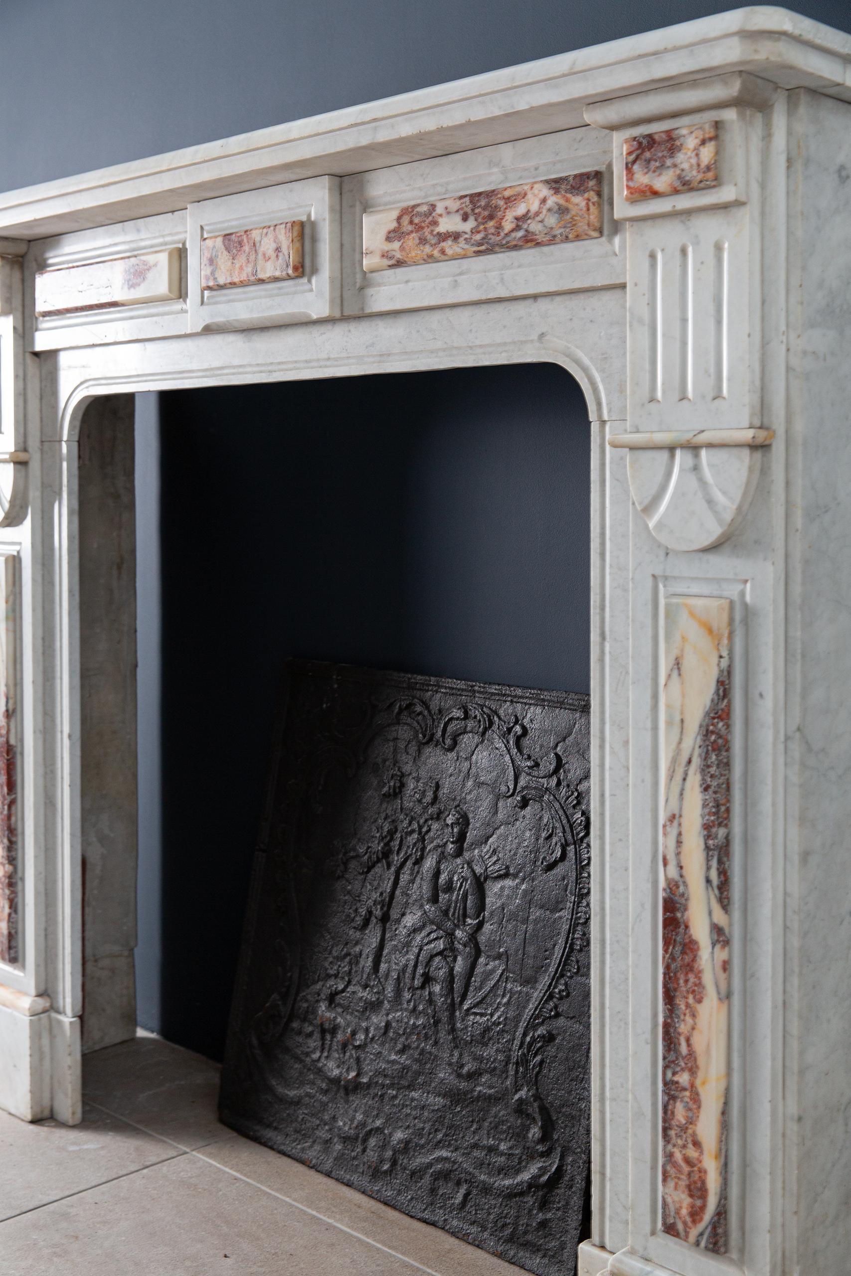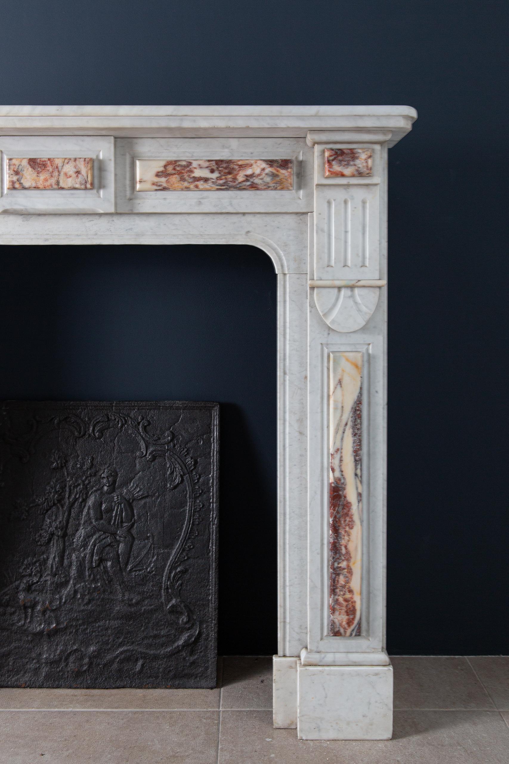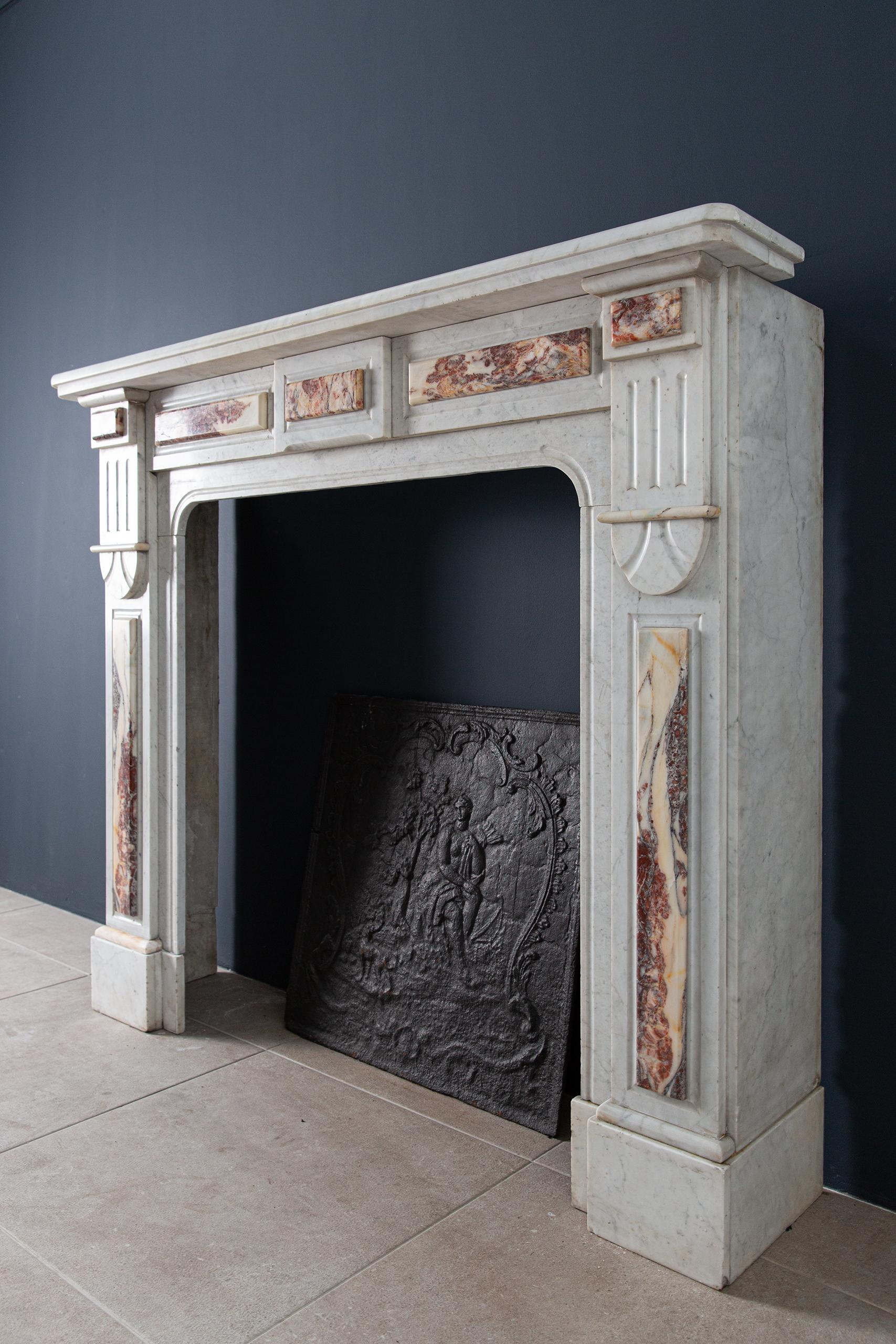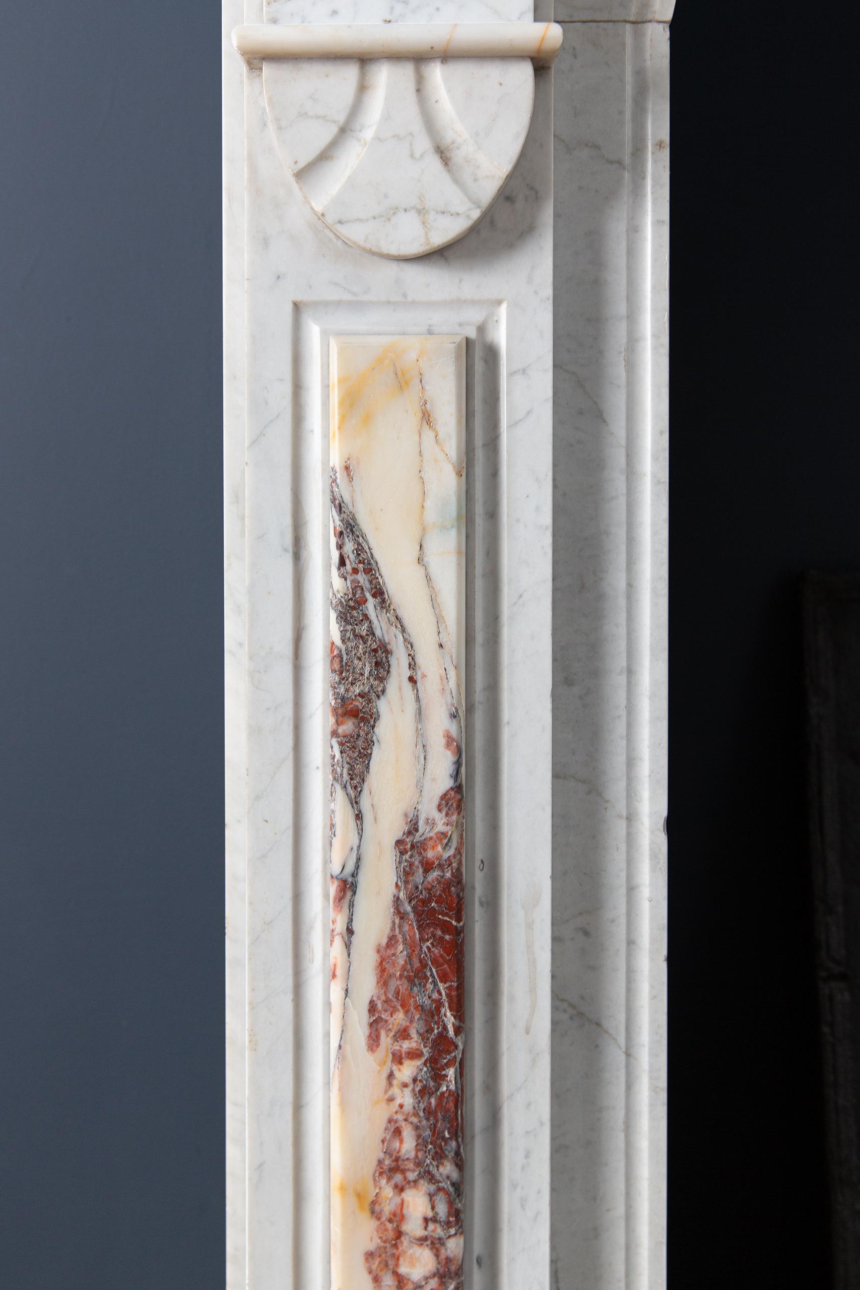 White Marble Antique Neoclassical French Turning Fireplace. An antique fireplace made of Carrara marble. The fireplace is decorated with red marble attachments which give this fireplace a unique look. The fireplace is richly decorated not only by the termination pieces but also by profiling on the consoles and the inner frame.