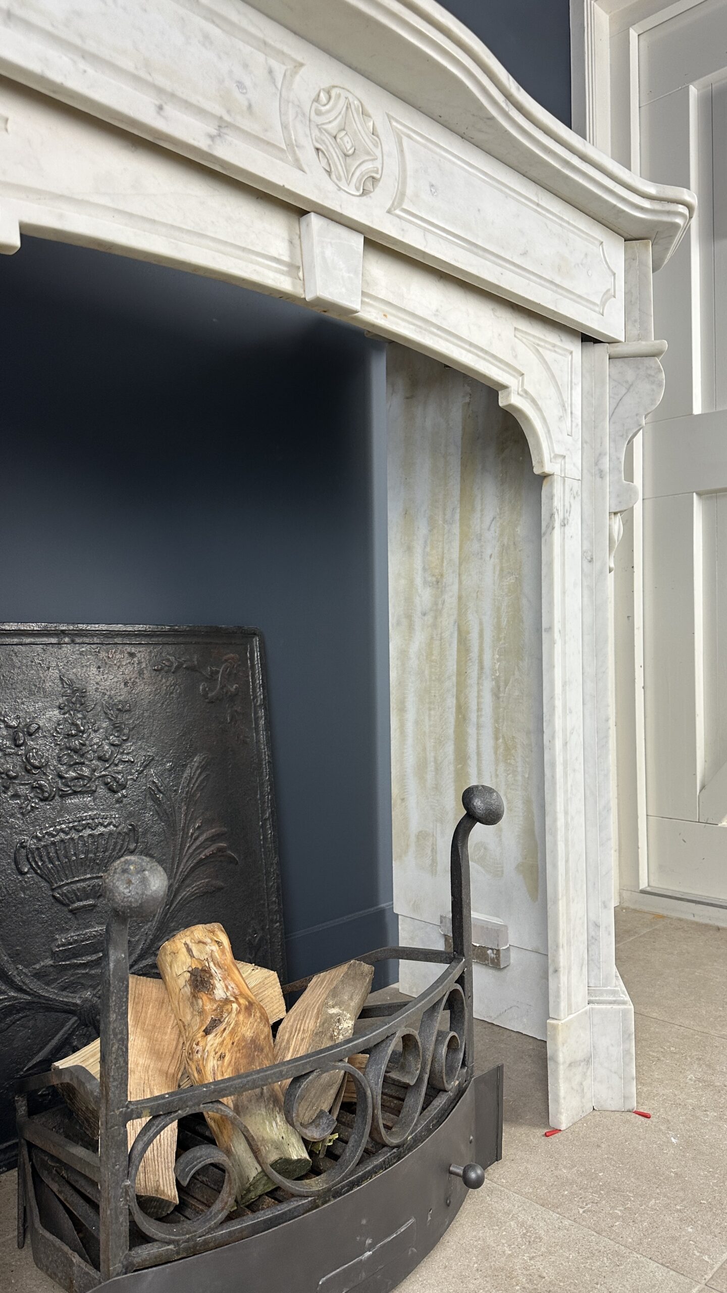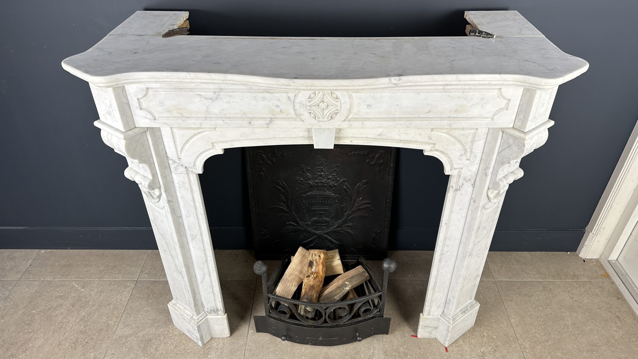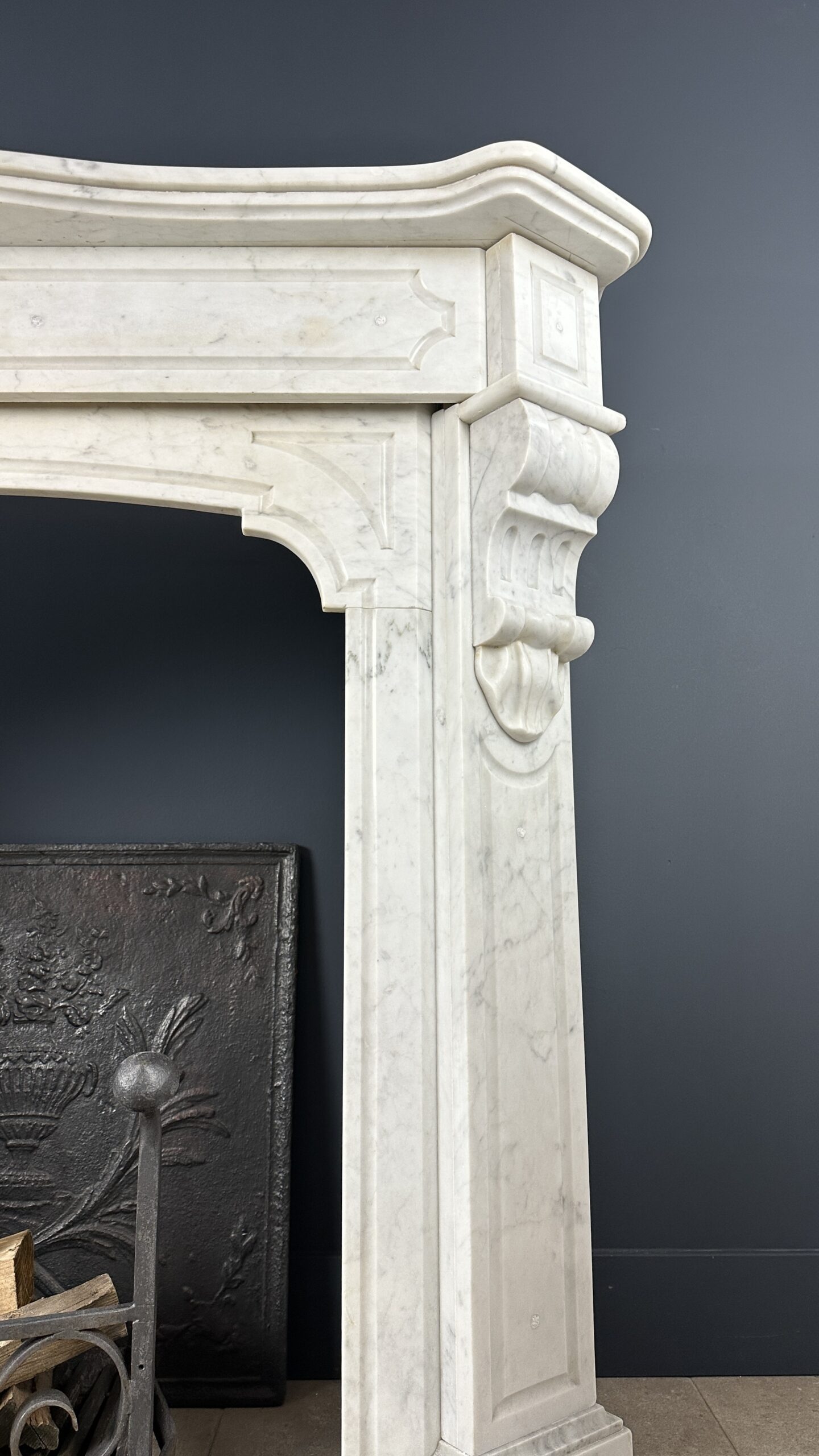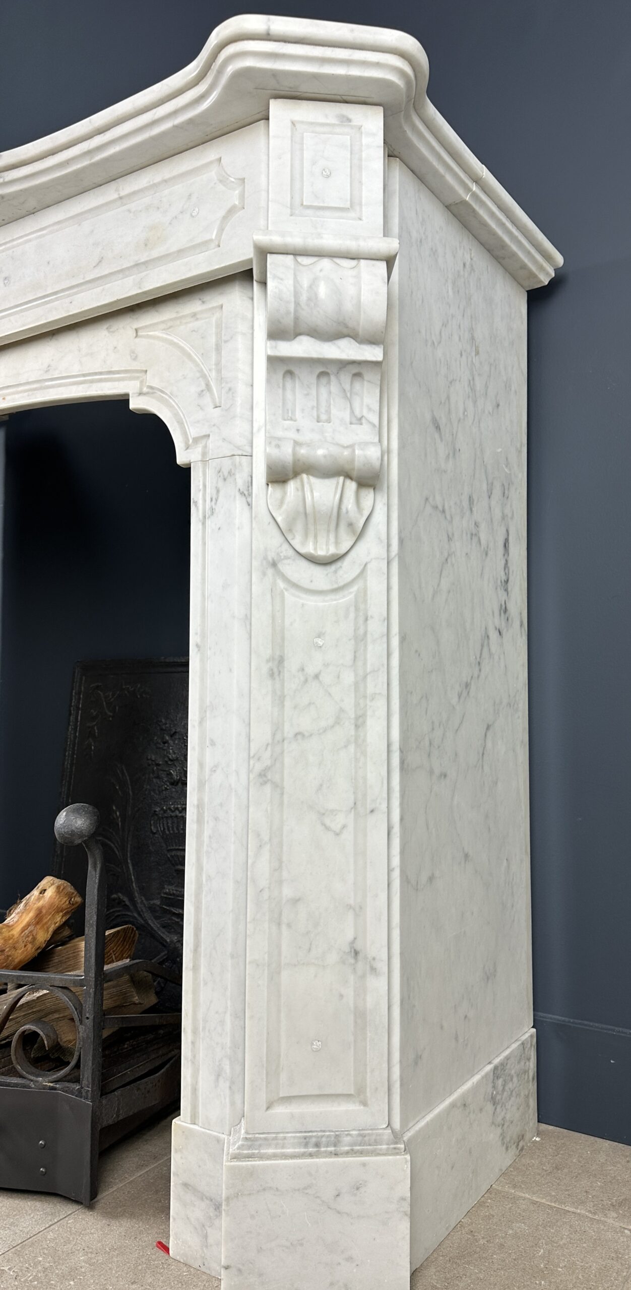 Deze antieke marmeren omloopschouw is een prachtig voorbeeld van elegant vakmanschap, vervaardigd uit hoogwaardig wit marmer met subtiele grijze aders. Het ontwerp wordt gekenmerkt door zijn lijnenspel en gedetailleerde ornamenten, waaronder de sierlijke consoles die de rijke uitstraling van de schouw accentueren.