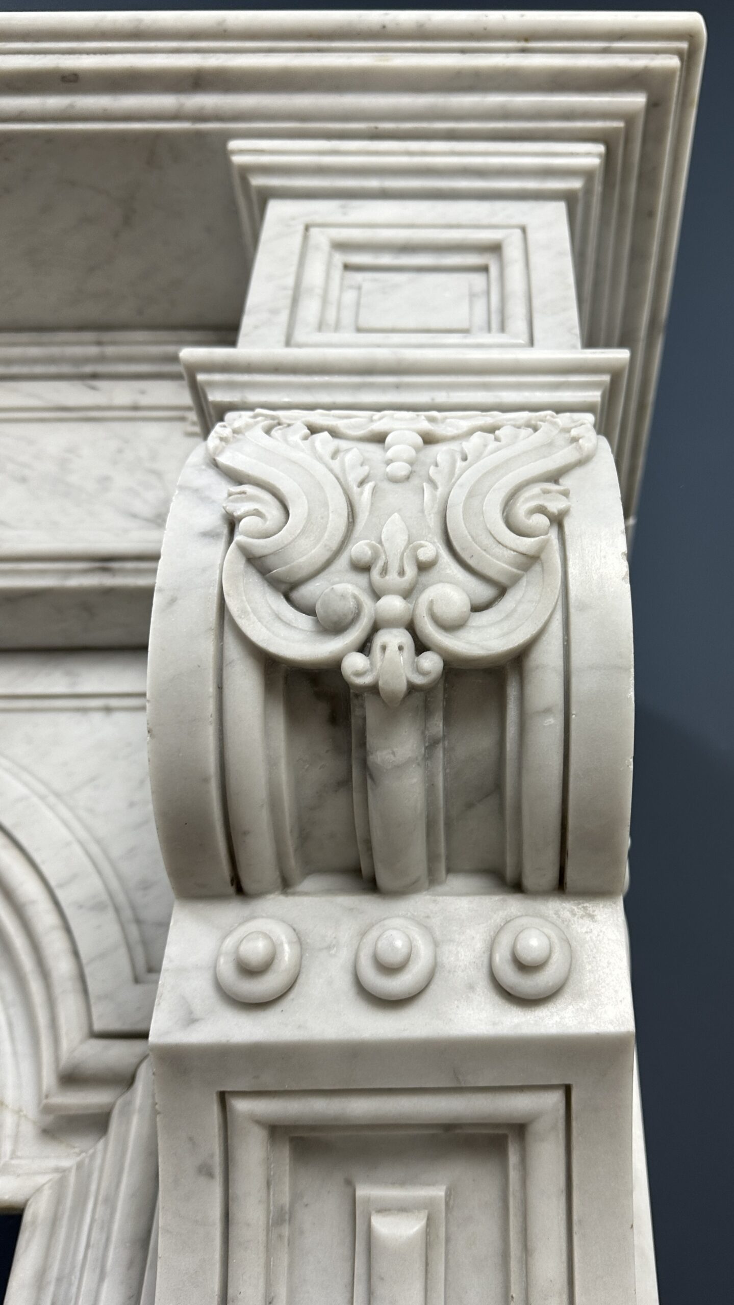 Laat u betoveren door de opvallende consoles, met hun scherpe lijnen en minutieuze details, die getuigen van een meesterlijk niveau van vakmanschap. Het weelderige binnenwerk, samengesteld uit meerdere lagen marmer, creëert een prachtige diepte en dimensie die de schoonheid van deze schouw nog verder versterkt.