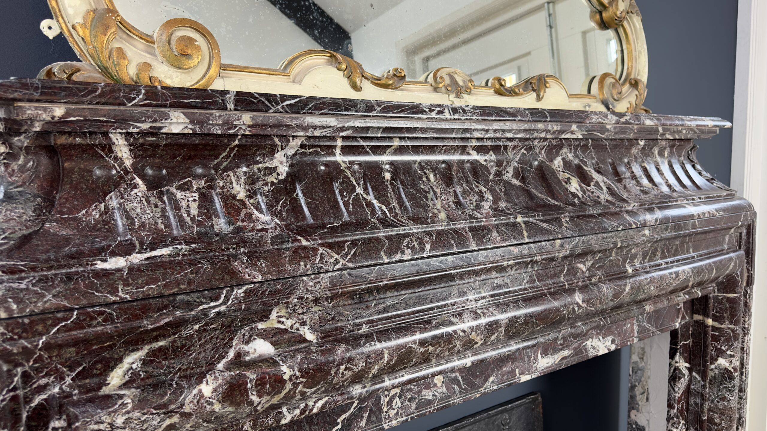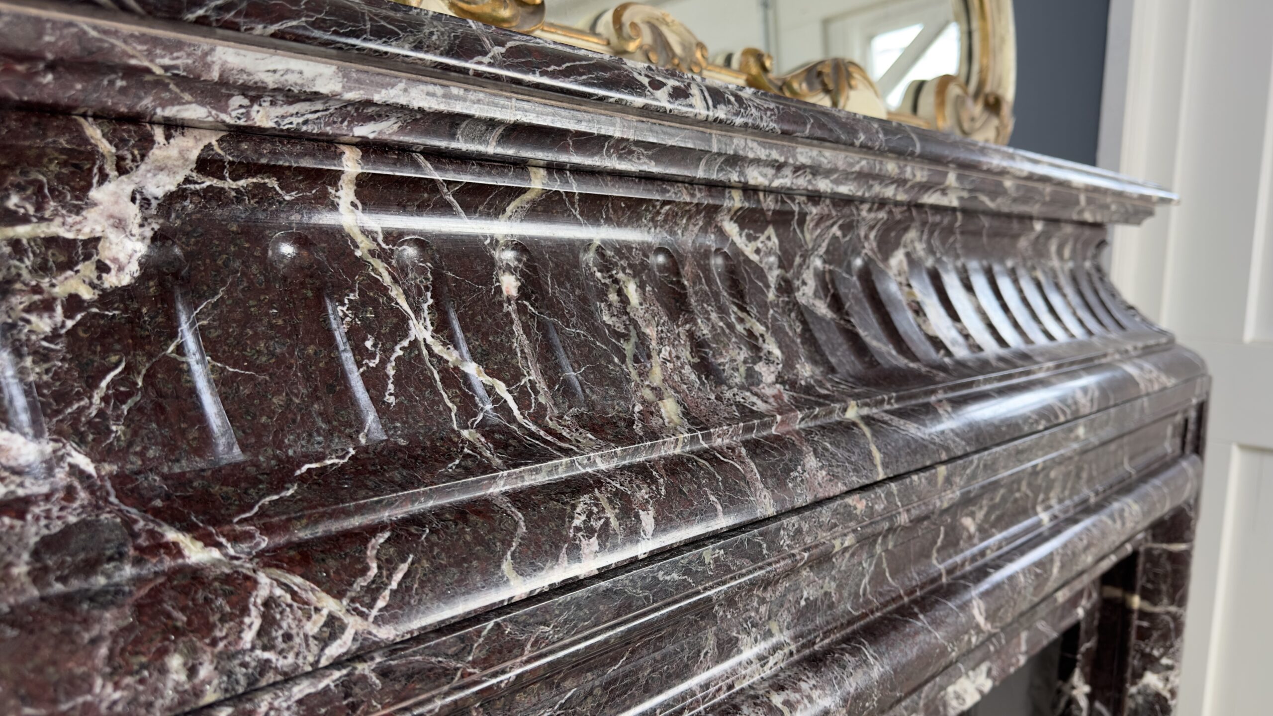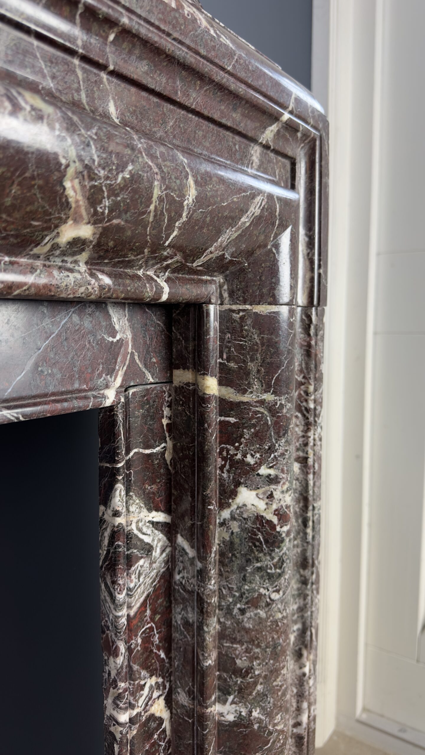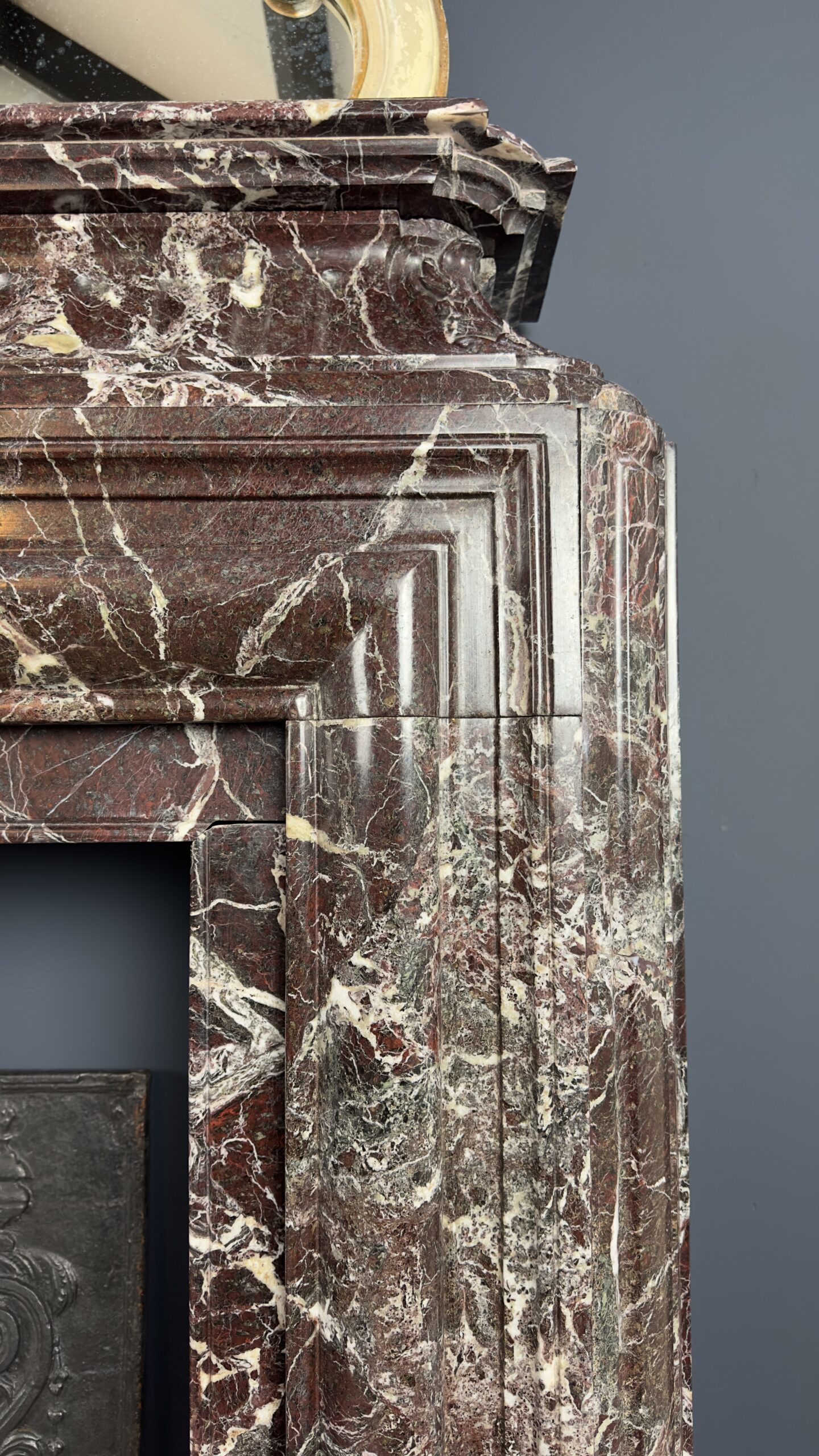 Verwelkom een van de meest uitmuntende stukken in onze verzameling antieke schouwen.Deze uitzonderlijk vormgegeven Antieke Schouw is een meesterwerk in het luxe marmer Rosso Levanto, met een diepe rode tint en warme kastanjebruine nuances, verrijkt met prachtige crèmekleurige en soms groene aders die zich op elegante wijze door de gehele schouw slingeren.