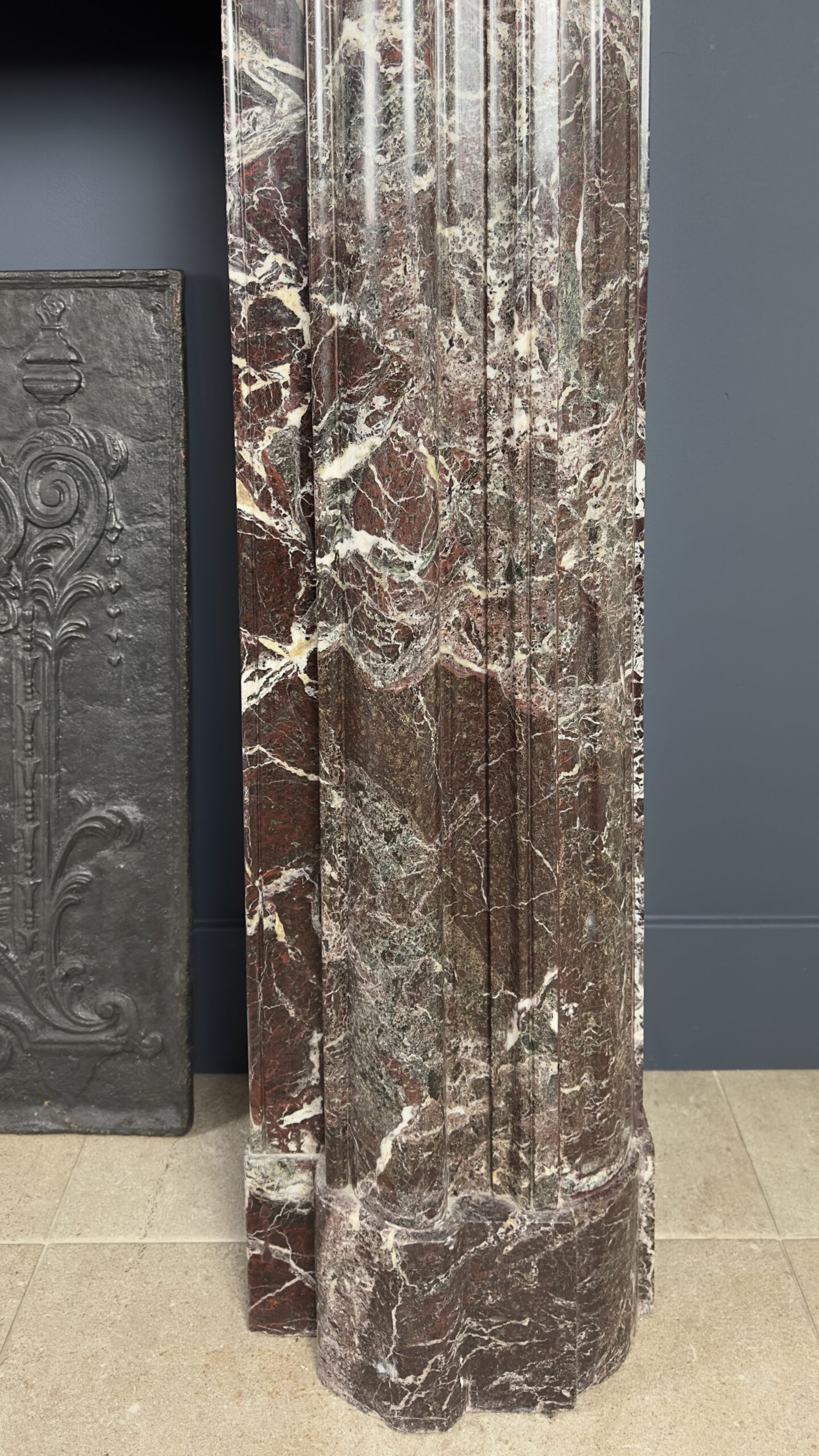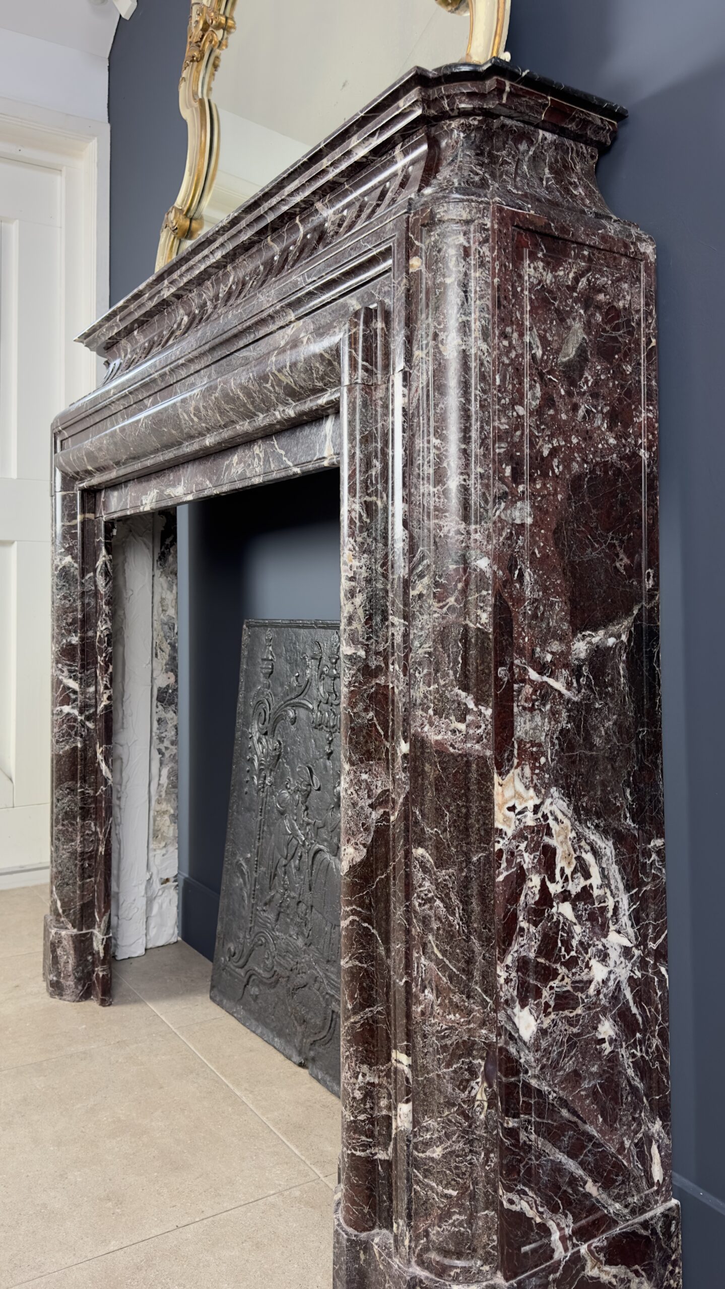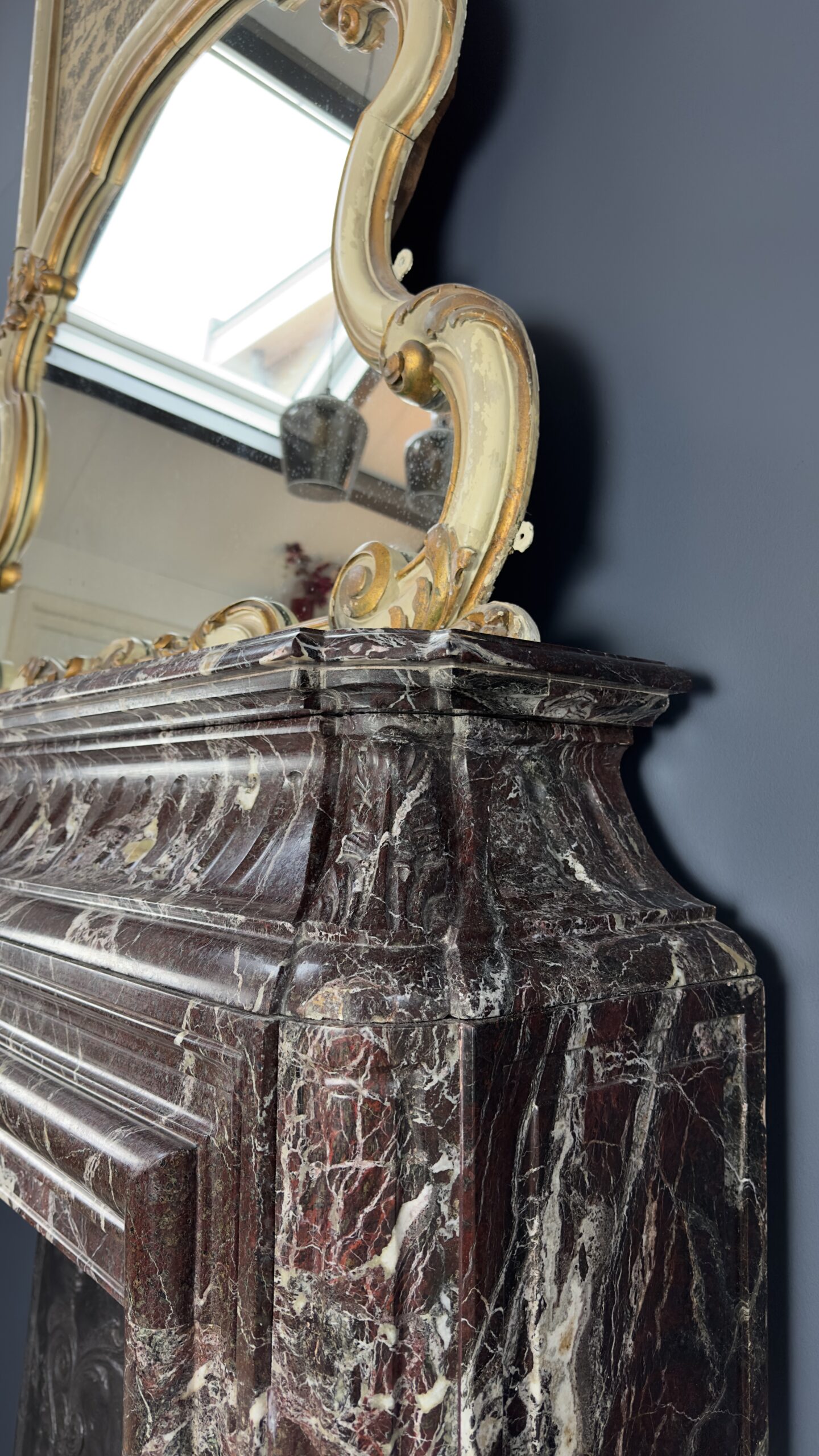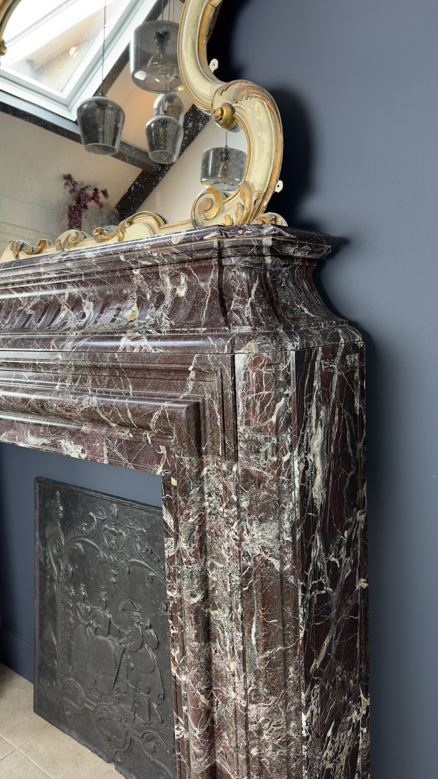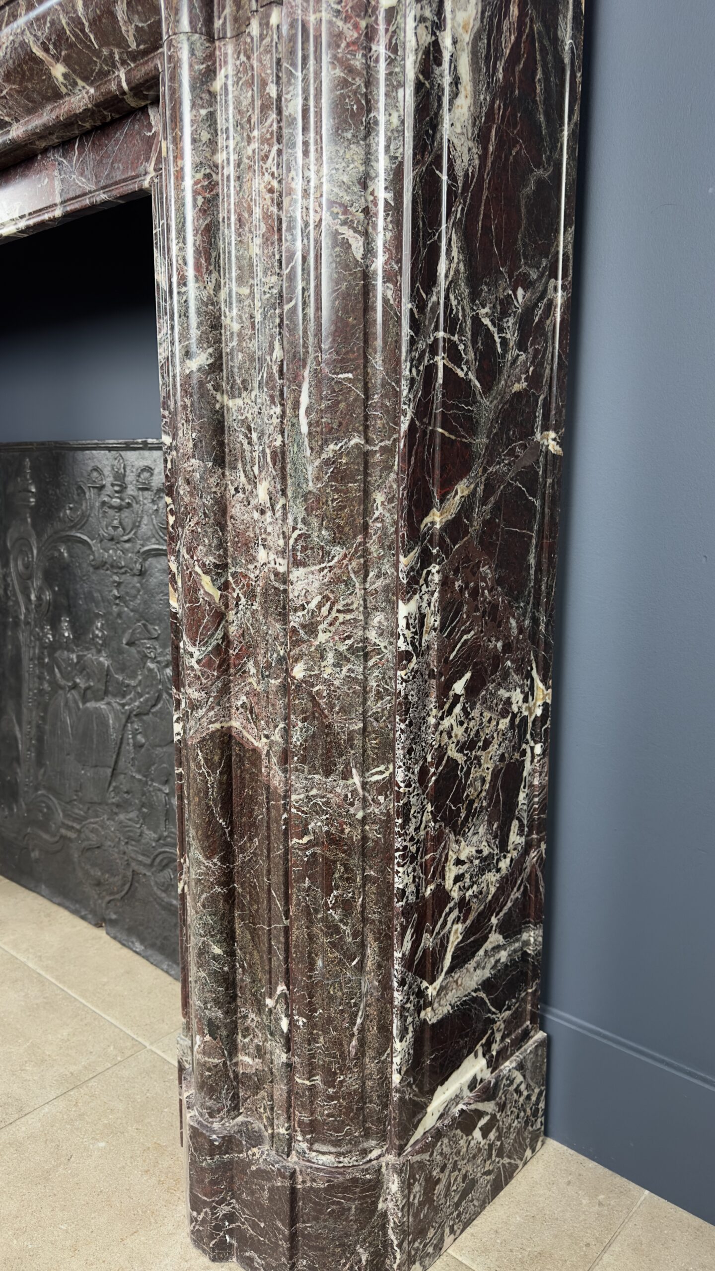 Verwelkom een van de meest uitmuntende stukken in onze verzameling antieke schouwen.Deze uitzonderlijk vormgegeven Antieke Schouw is een meesterwerk in het luxe marmer Rosso Levanto, met een diepe rode tint en warme kastanjebruine nuances, verrijkt met prachtige crèmekleurige en soms groene aders die zich op elegante wijze door de gehele schouw slingeren.