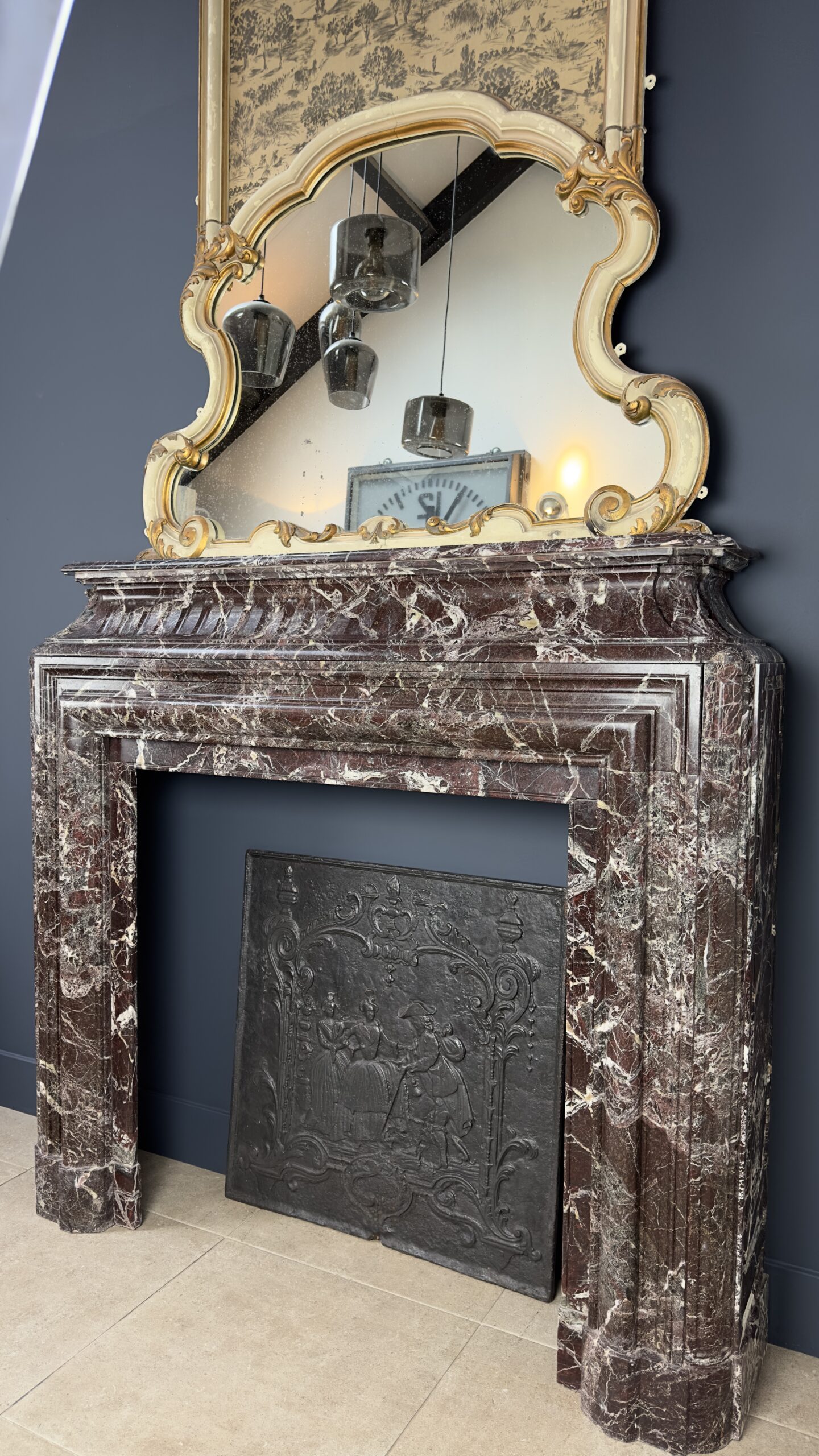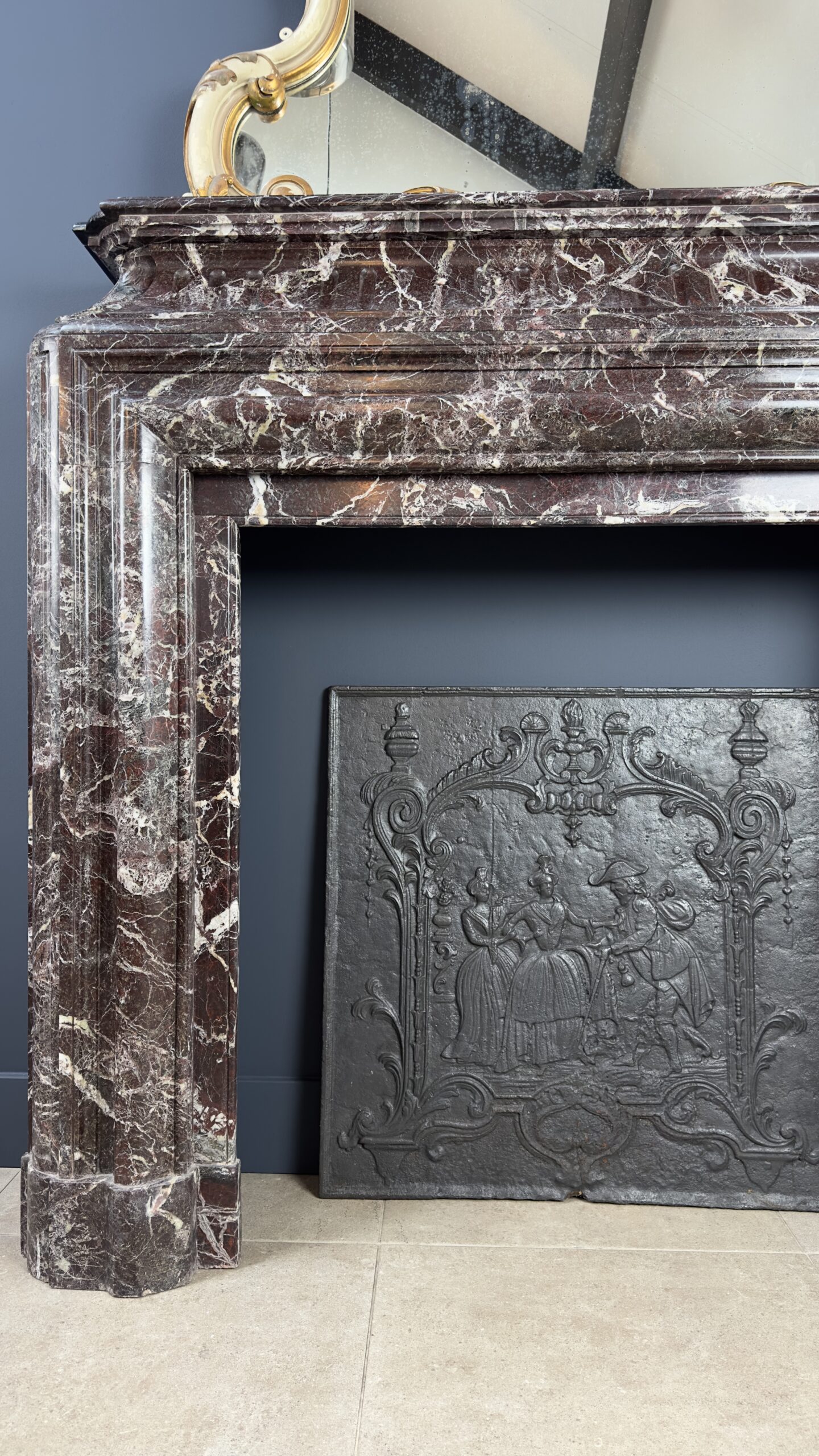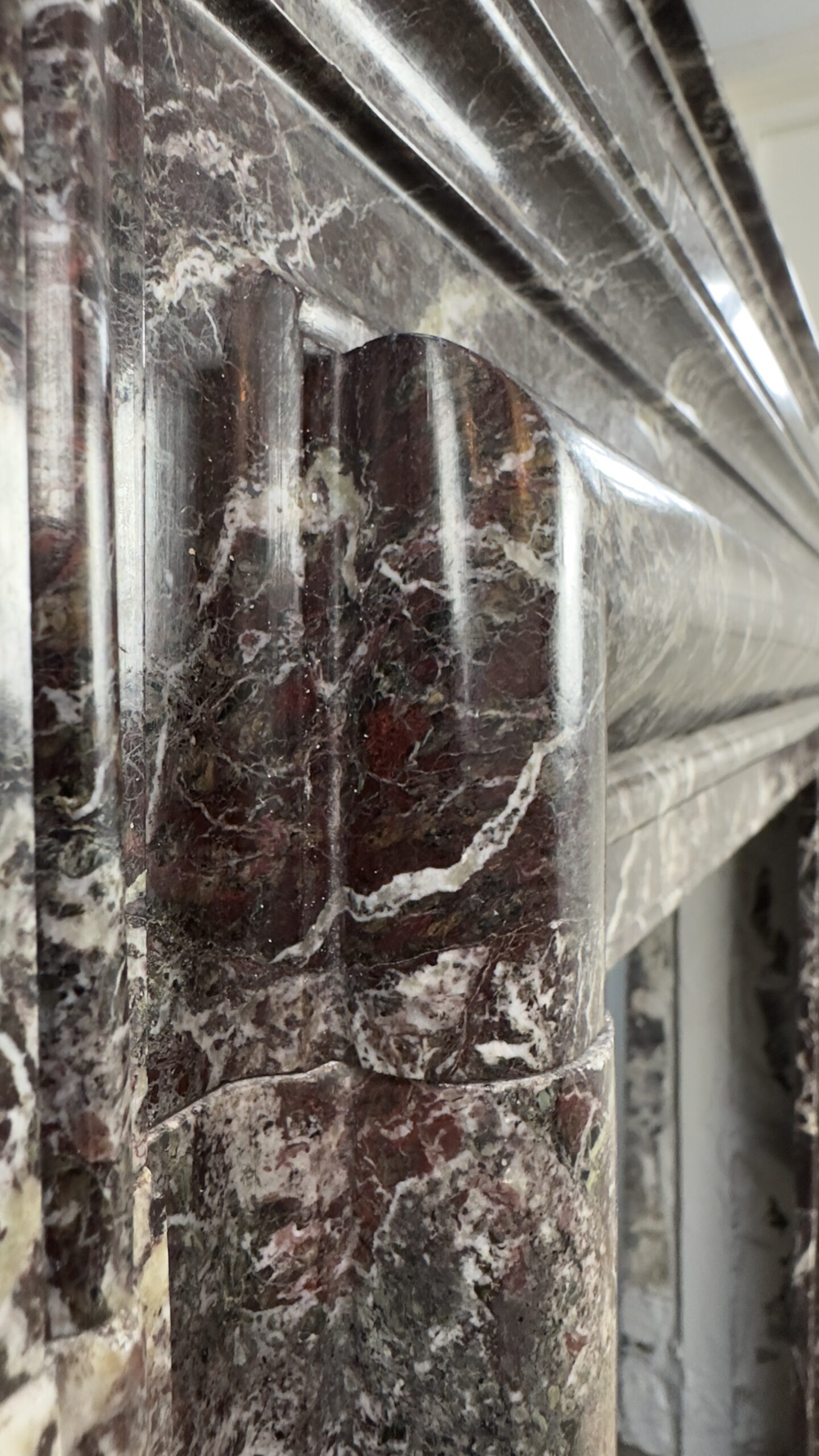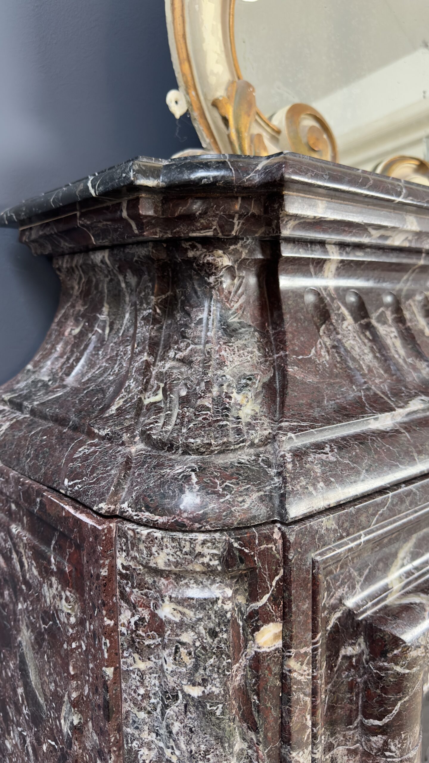Verwelkom een van de meest uitmuntende stukken in onze verzameling antieke schouwen.Deze uitzonderlijk vormgegeven Antieke Schouw is een meesterwerk in het luxe marmer Rosso Levanto, met een diepe rode tint en warme kastanjebruine nuances, verrijkt met prachtige crèmekleurige en soms groene aders die zich op elegante wijze door de gehele schouw slingeren.