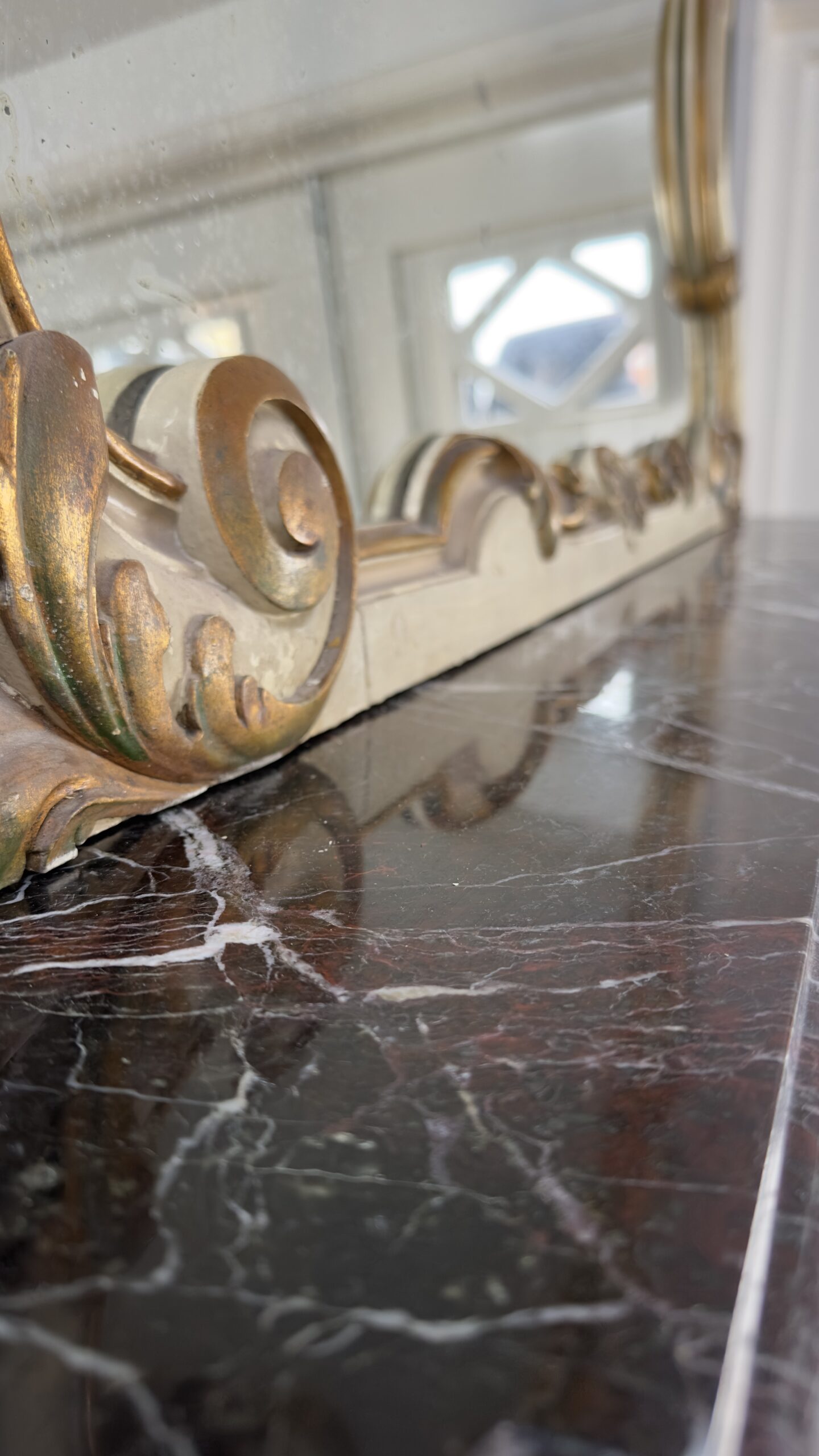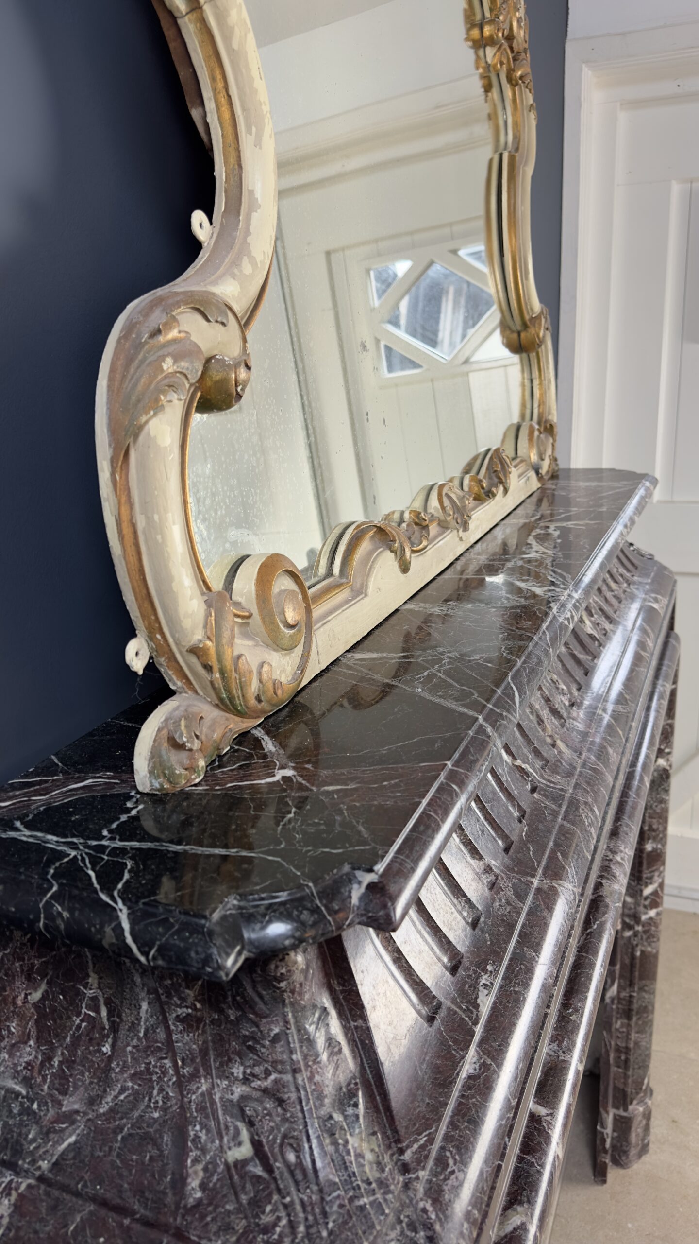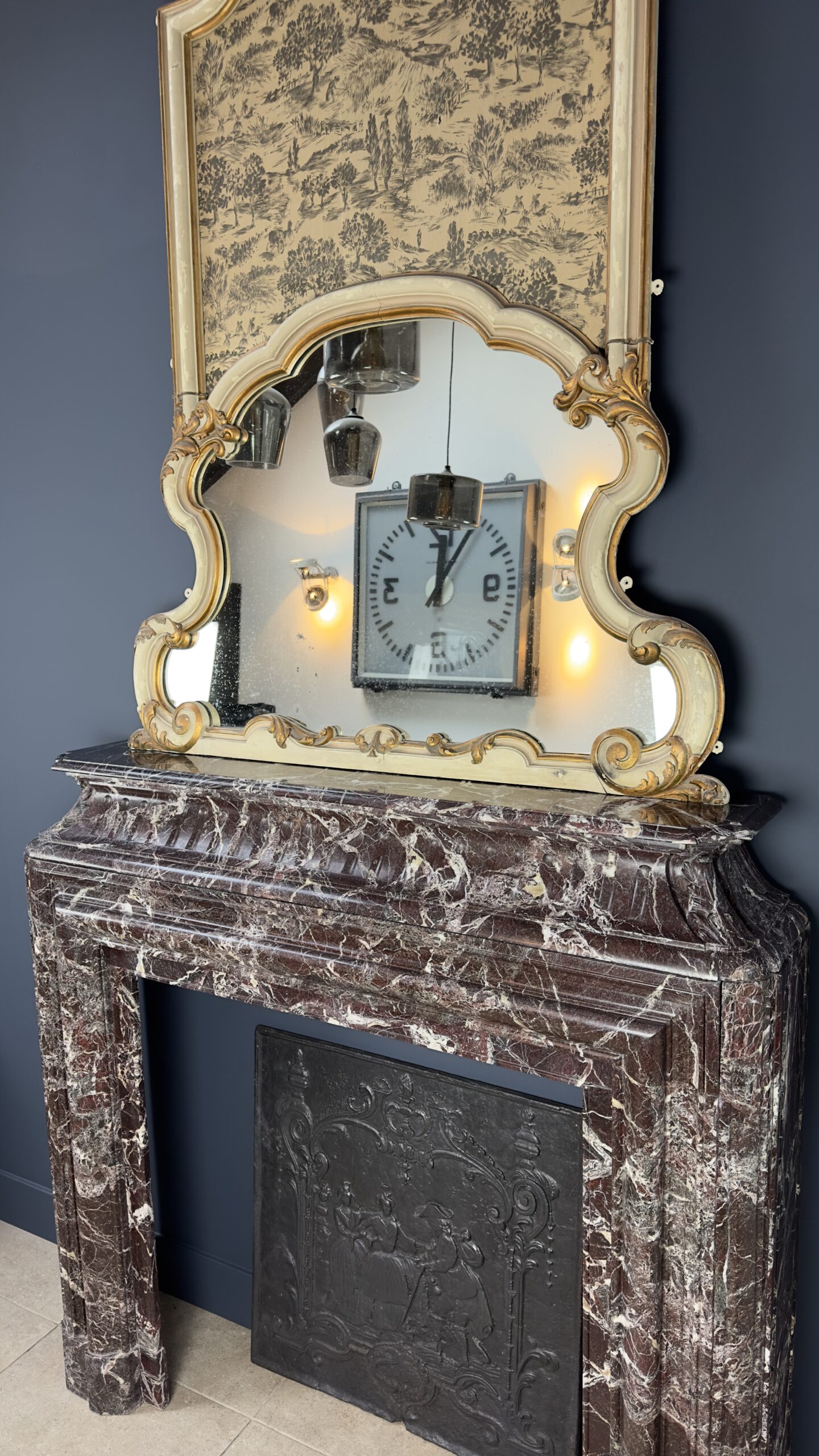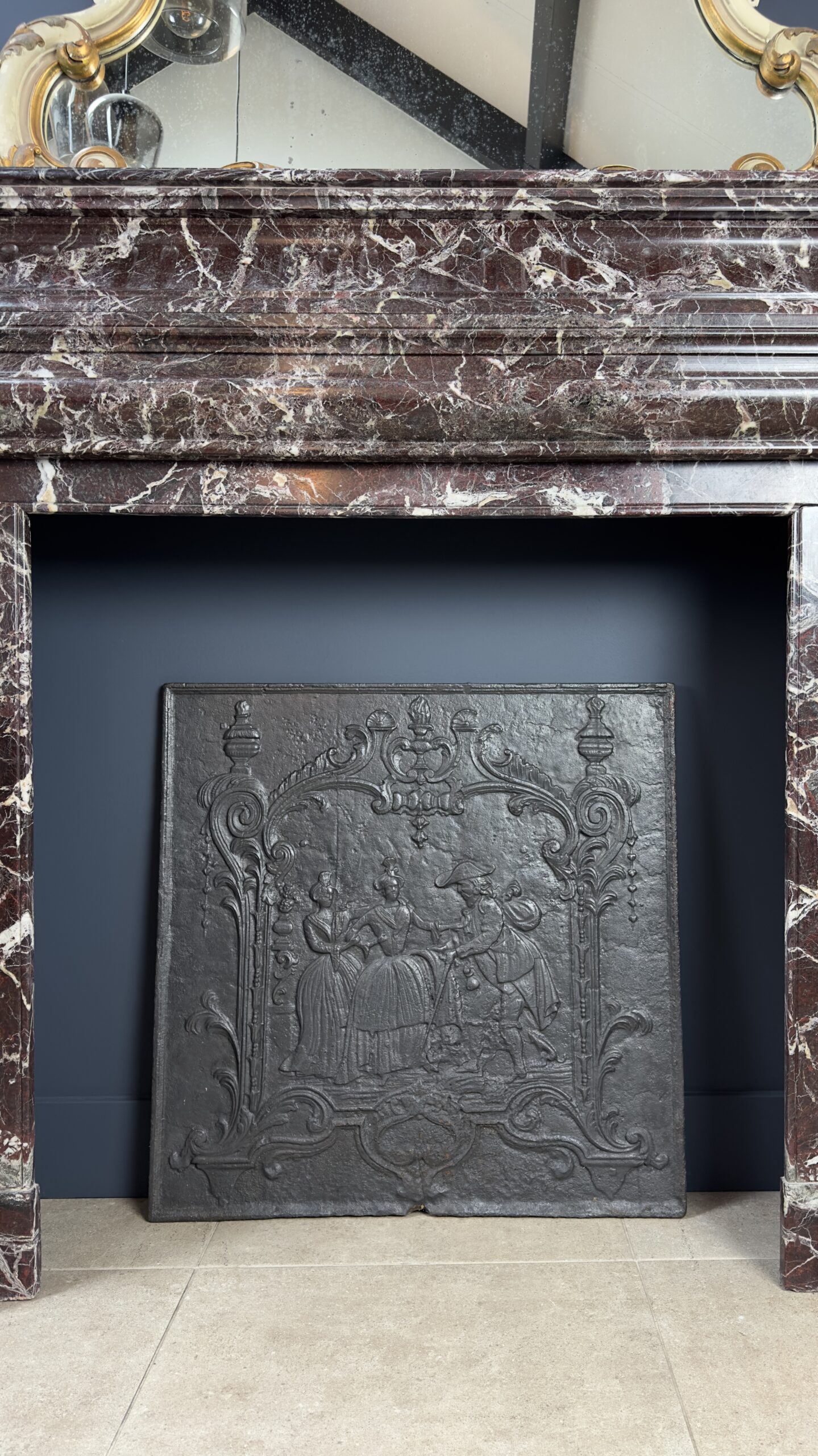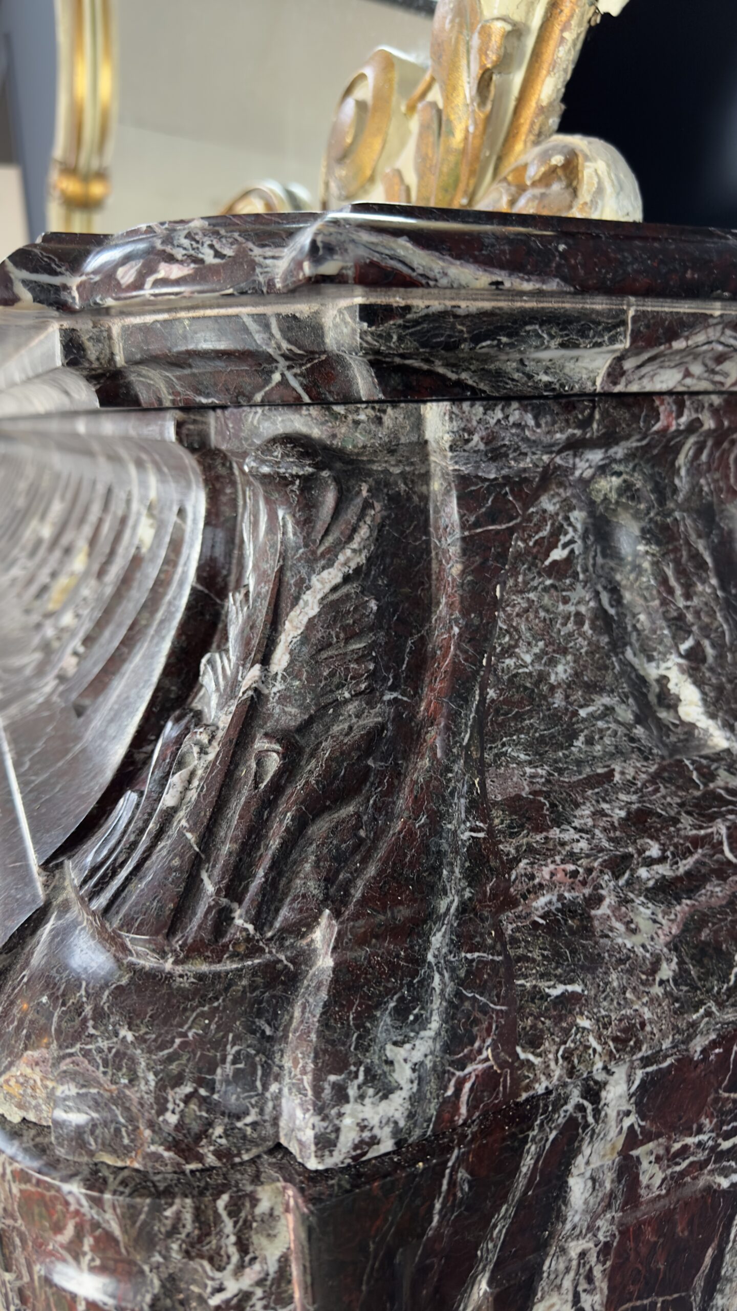 Verwelkom een van de meest uitmuntende stukken in onze verzameling antieke schouwen.Deze uitzonderlijk vormgegeven Antieke Schouw is een meesterwerk in het luxe marmer Rosso Levanto, met een diepe rode tint en warme kastanjebruine nuances, verrijkt met prachtige crèmekleurige en soms groene aders die zich op elegante wijze door de gehele schouw slingeren.