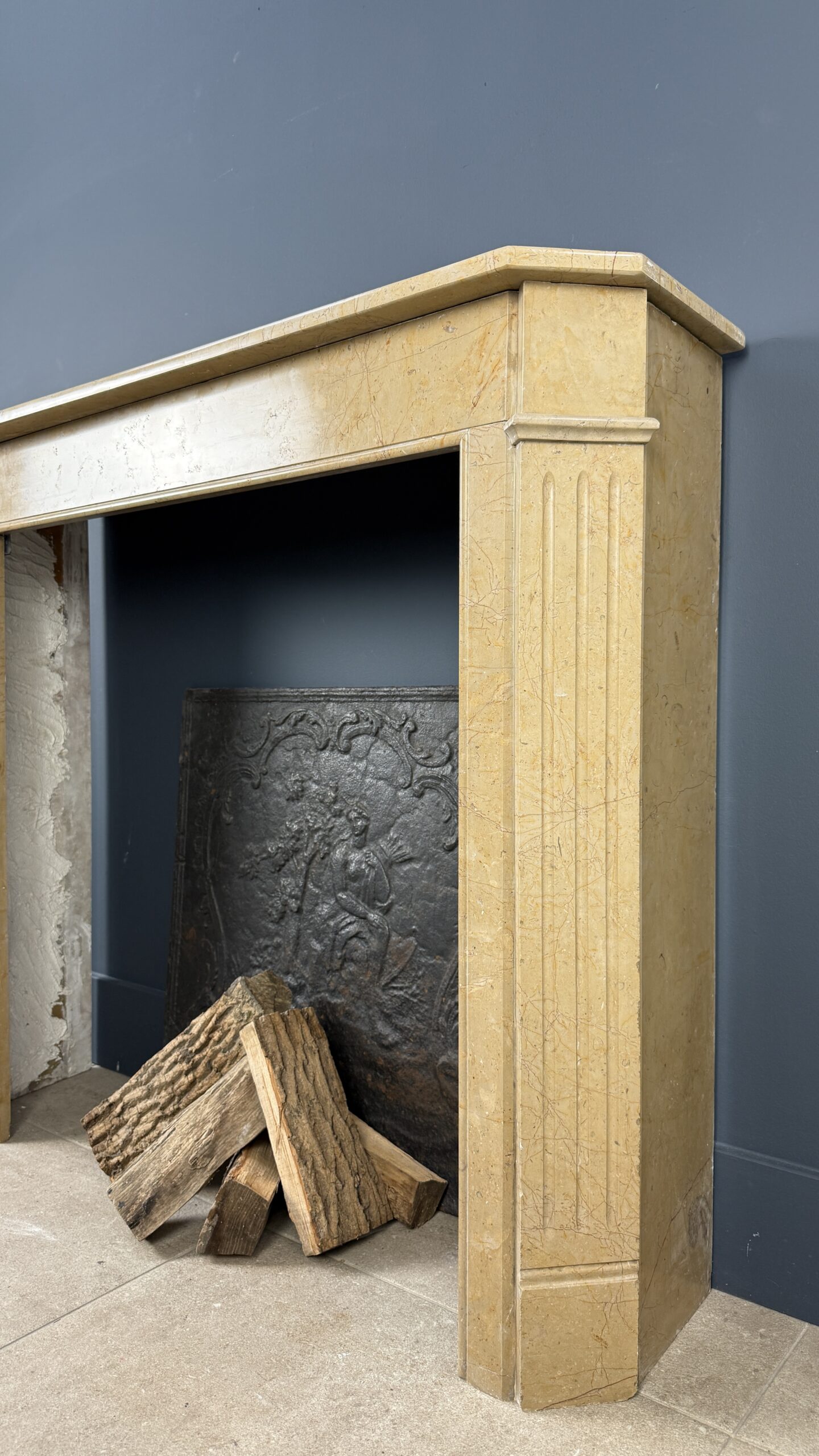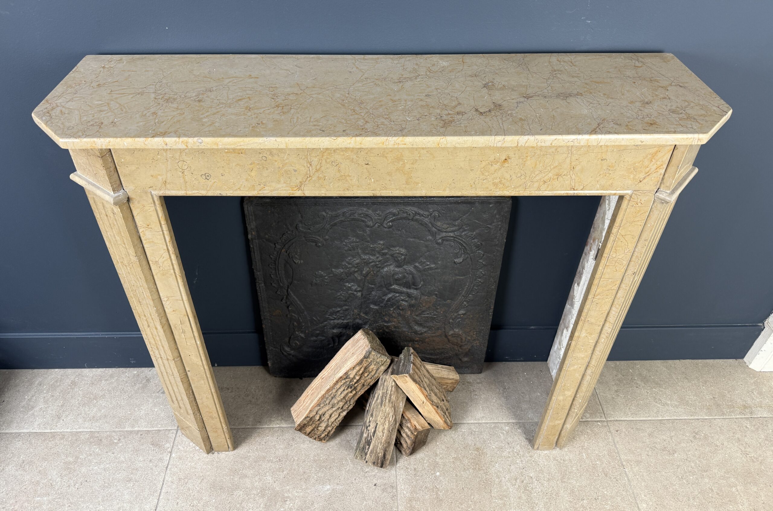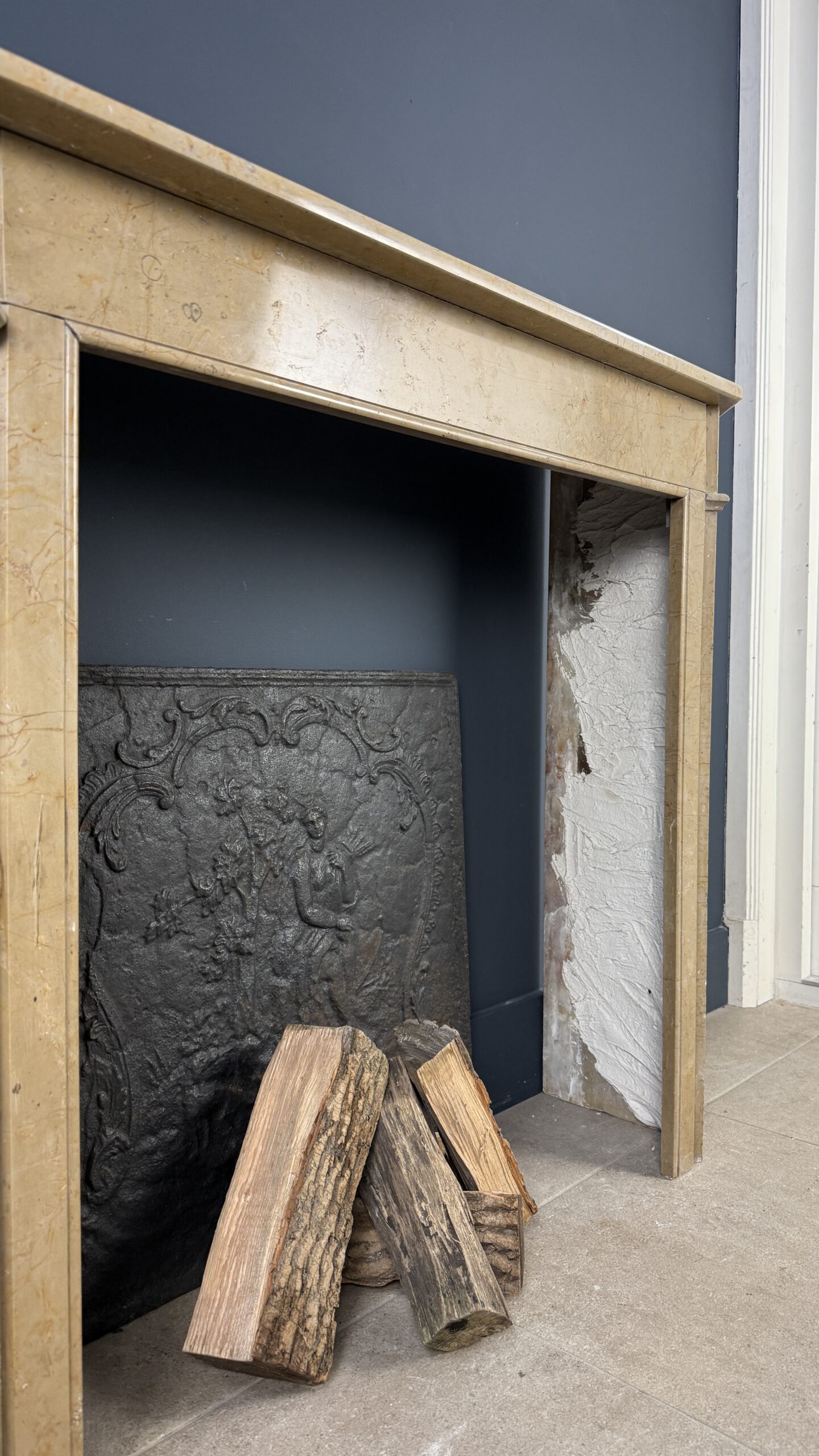 Deze Art Deco schouw, uitgevoerd in marmer met subtiele fijne adering. Het marmer, met zijn subtiele kleurnuances en lichte aderen, geeft de schouw een uitstraling die perfect past in een modern of minimalistischer interieur.