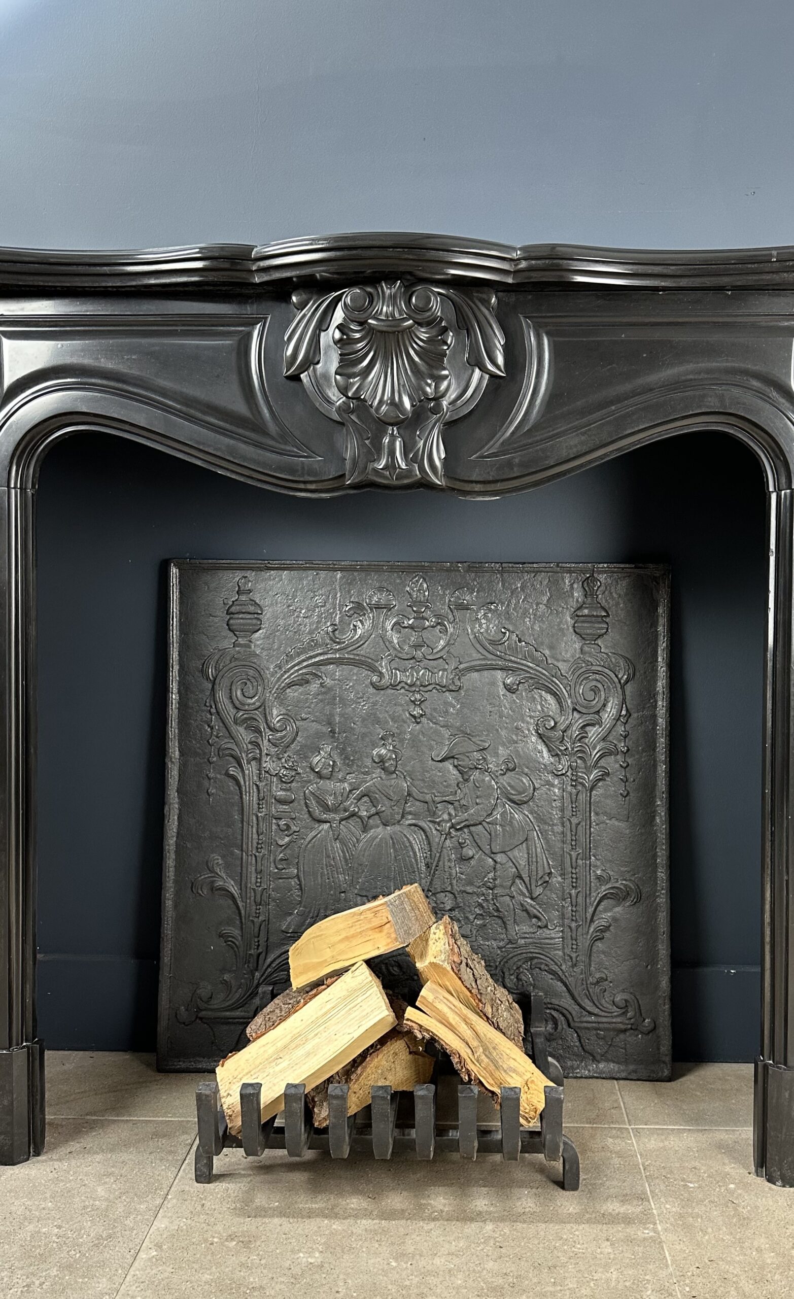 Laat u betoveren door het summum van verfijning met onze Louis XV Stijl Noir de Mazy Antieke Marmeren Frontschouw. Deze unieke creatie straalt een ongeëvenaarde pracht uit en is een waardevol kunstwerk waarvan er geen tweede te vinden is. De schouw is doordrenkt met weelderig gedetailleerde ornamenten, waarvan de sierlijke lijnen en het meeslepende rondspel direct in het oog springen.