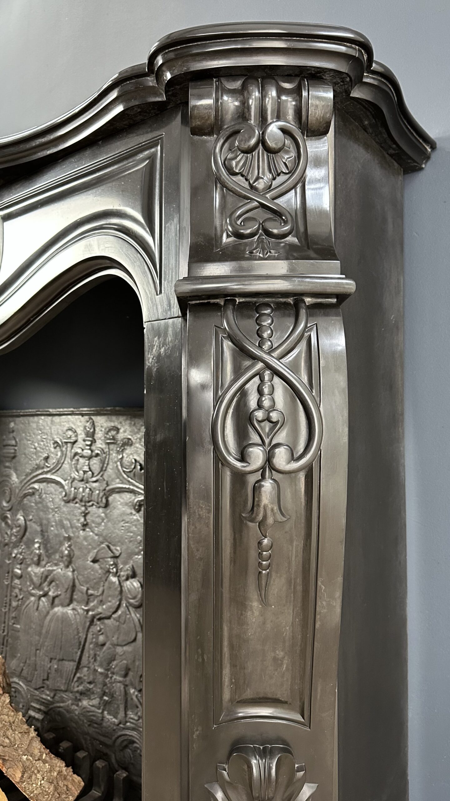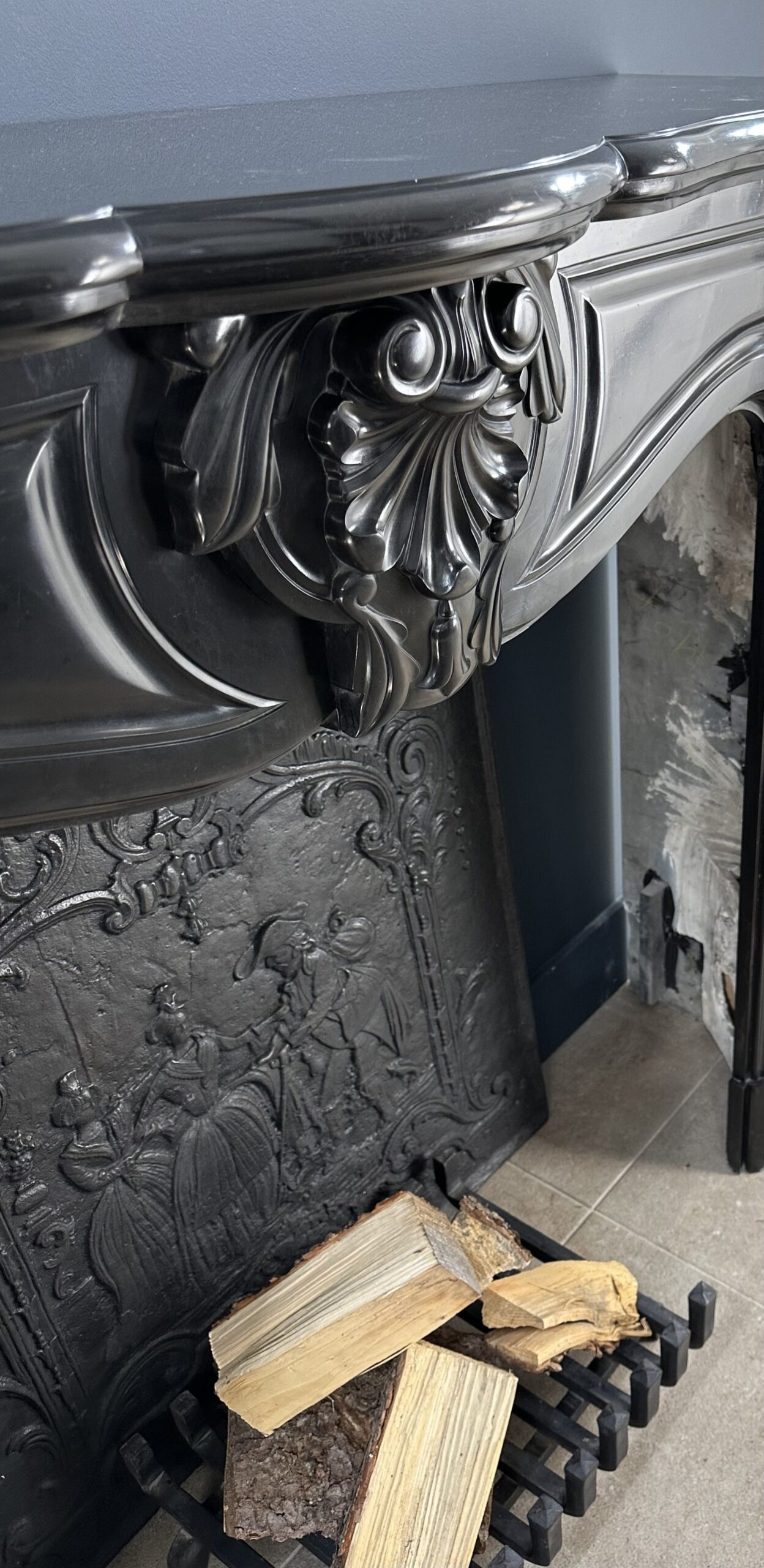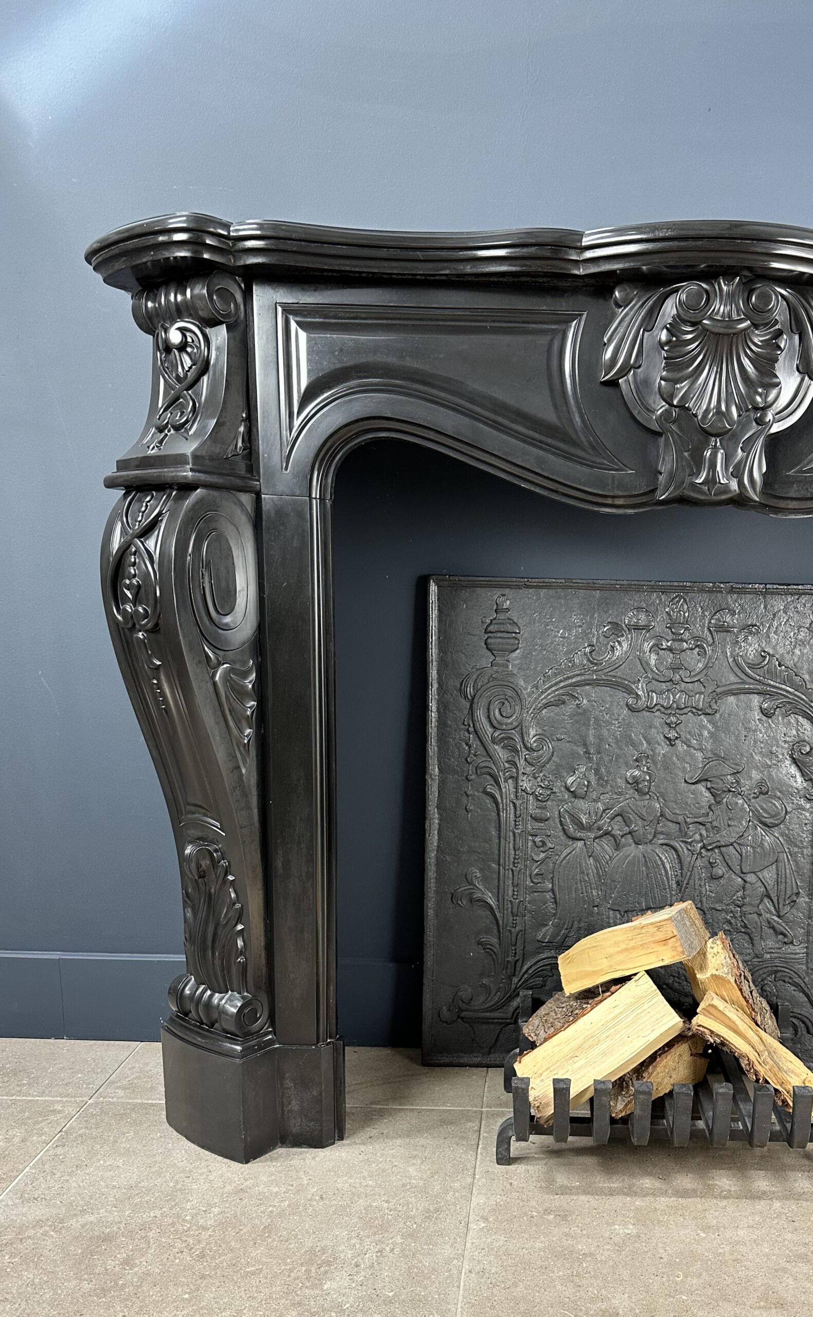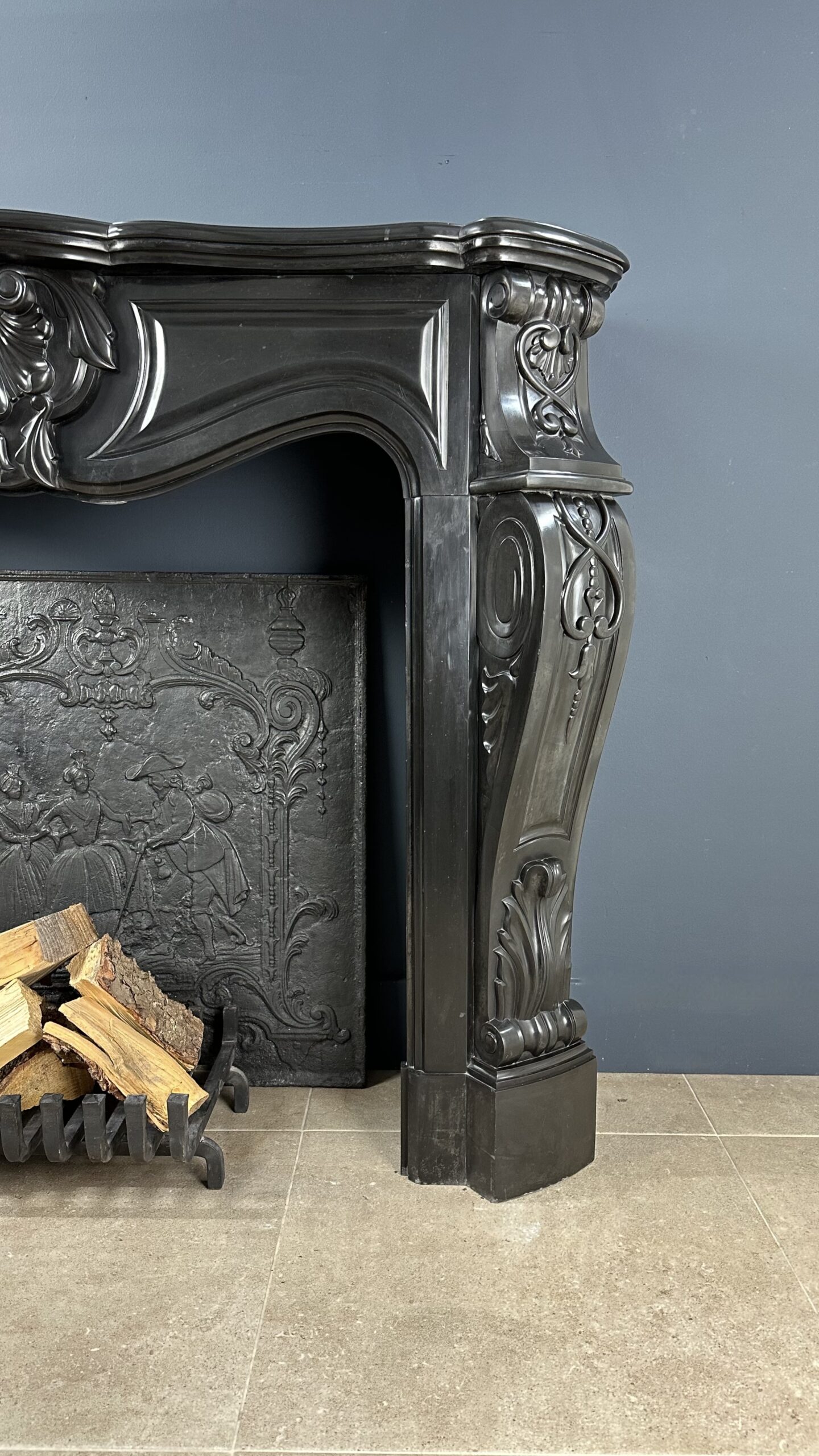 Gemaakt van het luxueuze Noir de Mazy marmer, getuigt dit meesterwerk van uitmuntend vakmanschap. De schouw is rijkelijk versierd met prachtige ornamenten en cannelures die de elegante benen sieren. Het dubbel geprofileerde bovenblad vormt de kroon op het werk, waardoor het geheel een onmiskenbaar karakter krijgt.