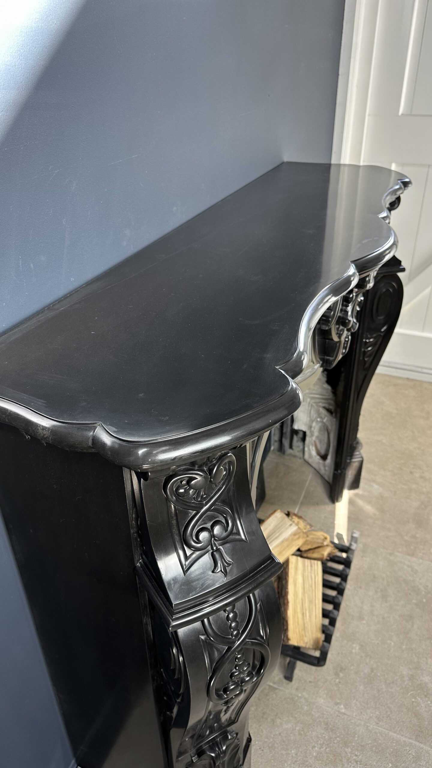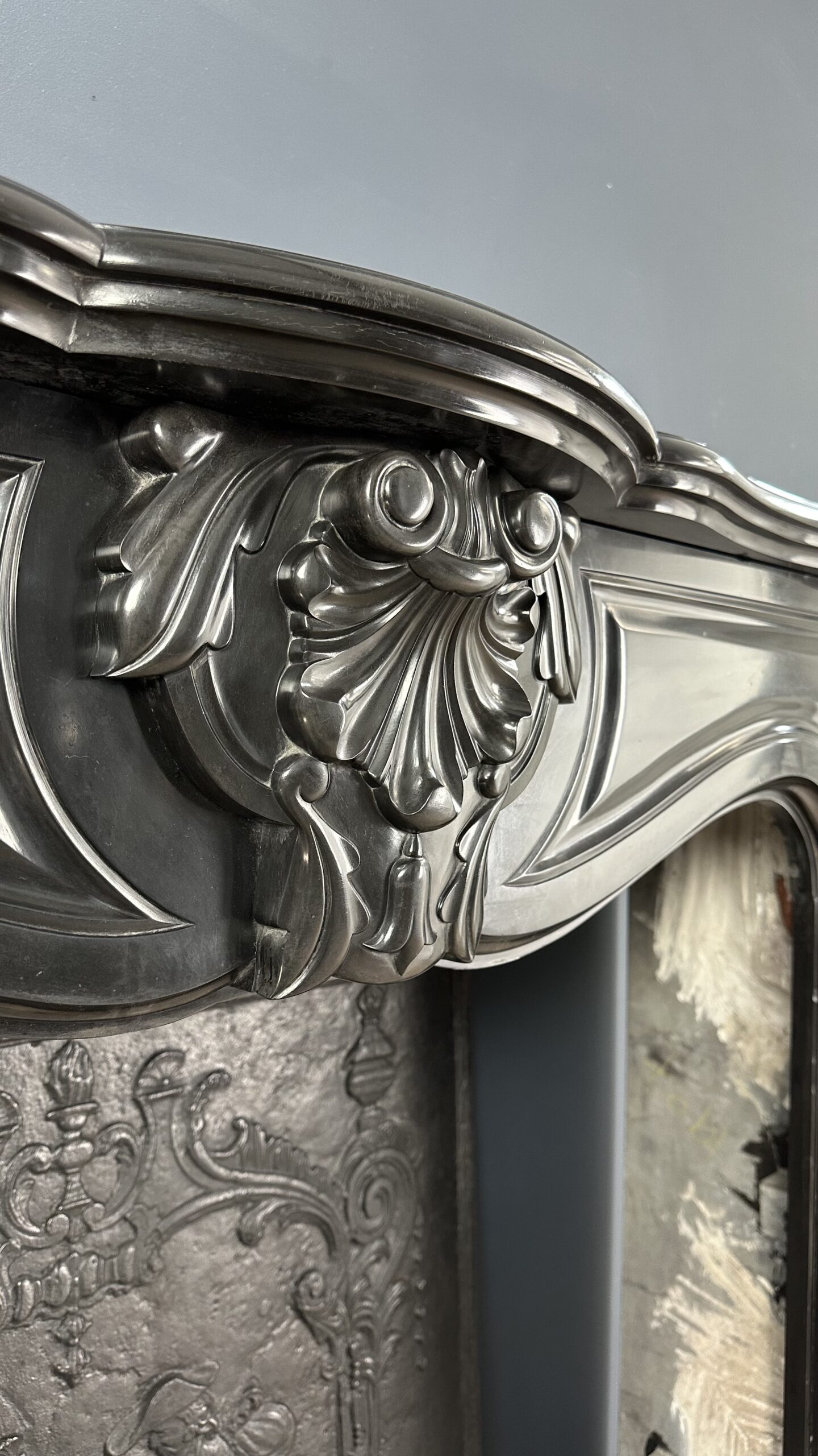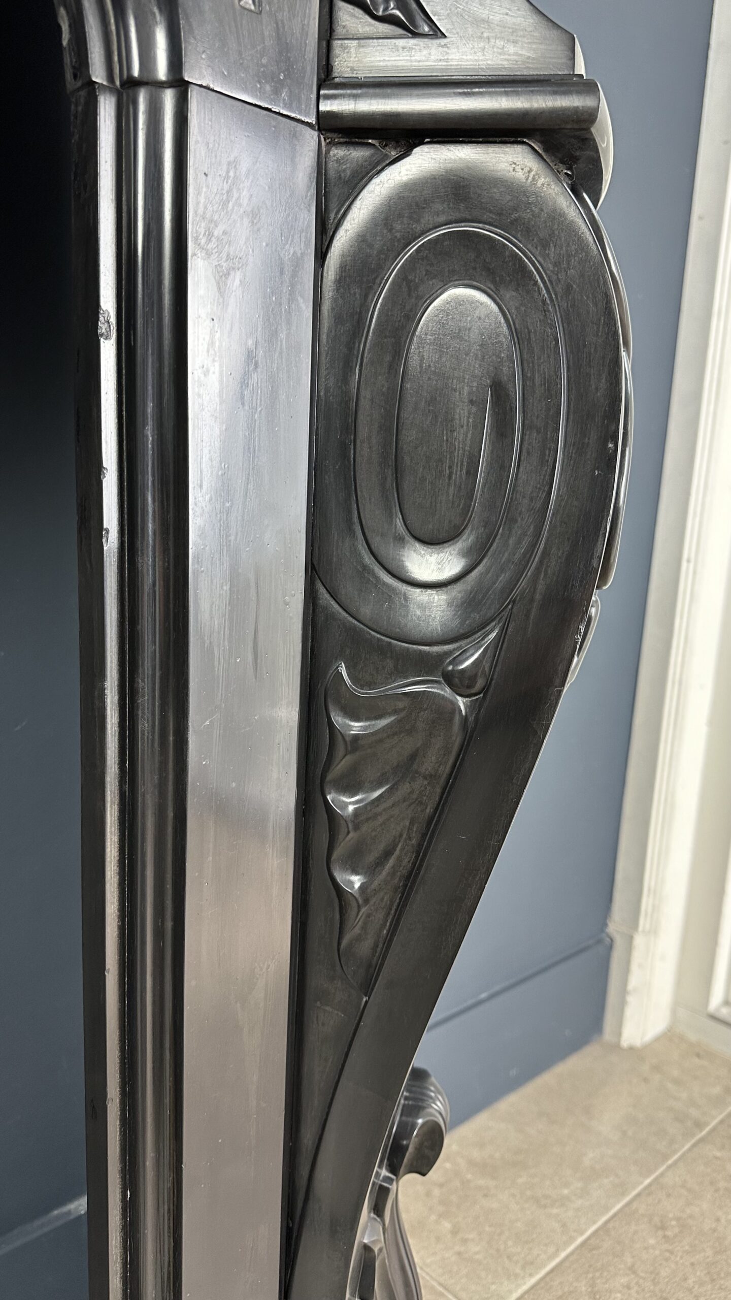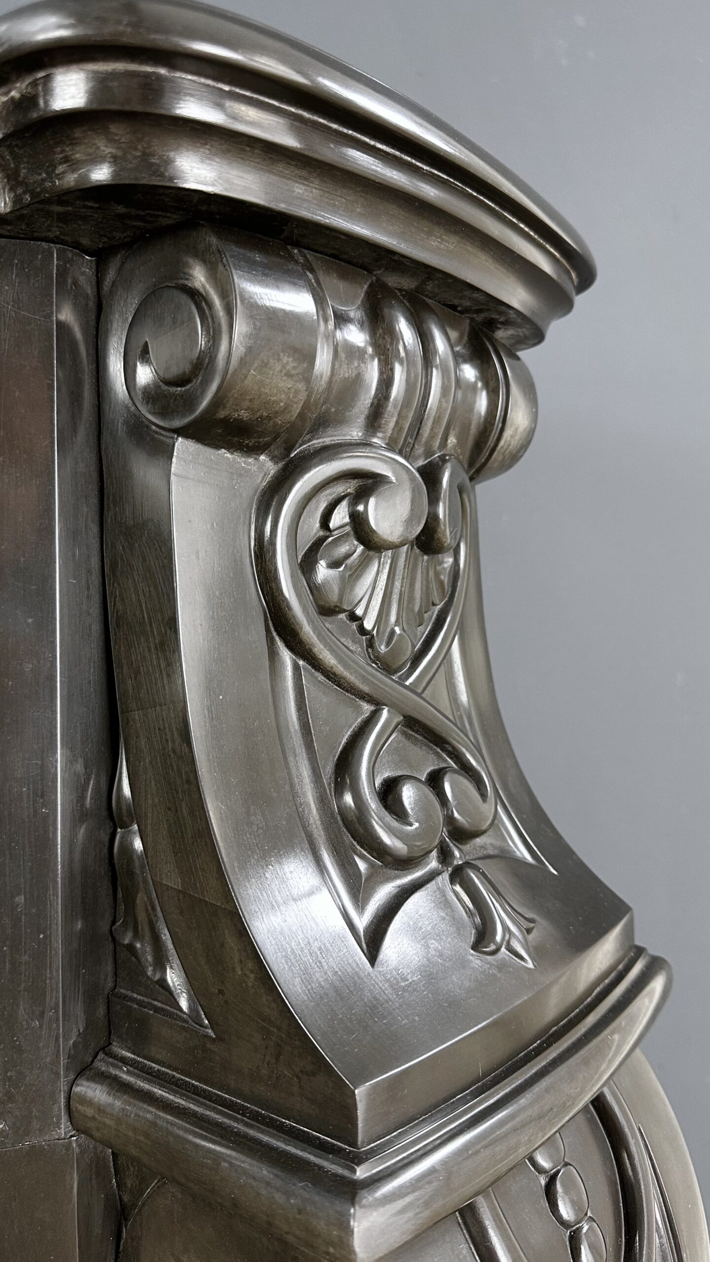 Gemaakt van het luxueuze Noir de Mazy marmer, getuigt dit meesterwerk van uitmuntend vakmanschap. De schouw is rijkelijk versierd met prachtige ornamenten en cannelures die de elegante benen sieren. Het dubbel geprofileerde bovenblad vormt de kroon op het werk, waardoor het geheel een onmiskenbaar karakter krijgt.