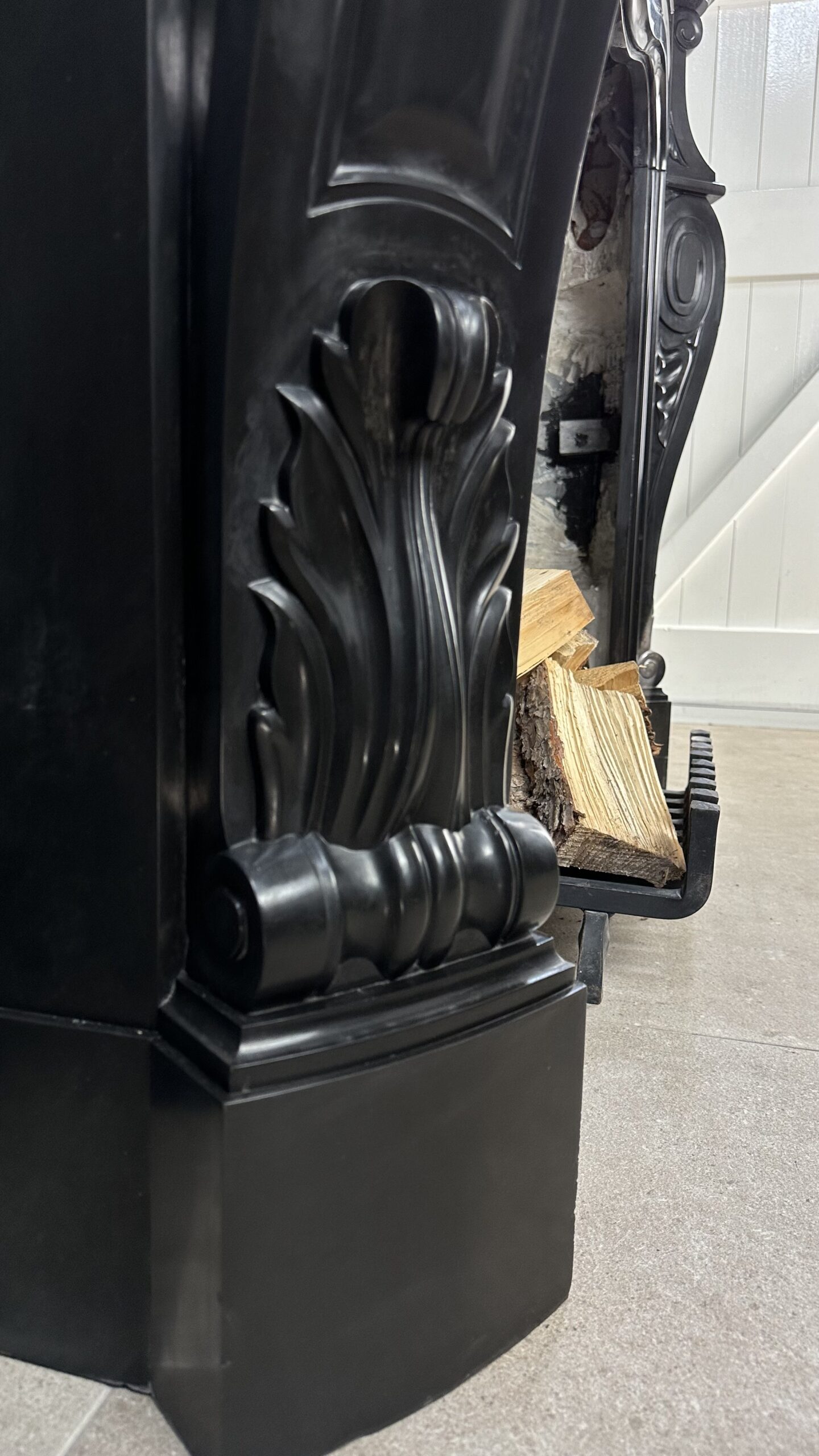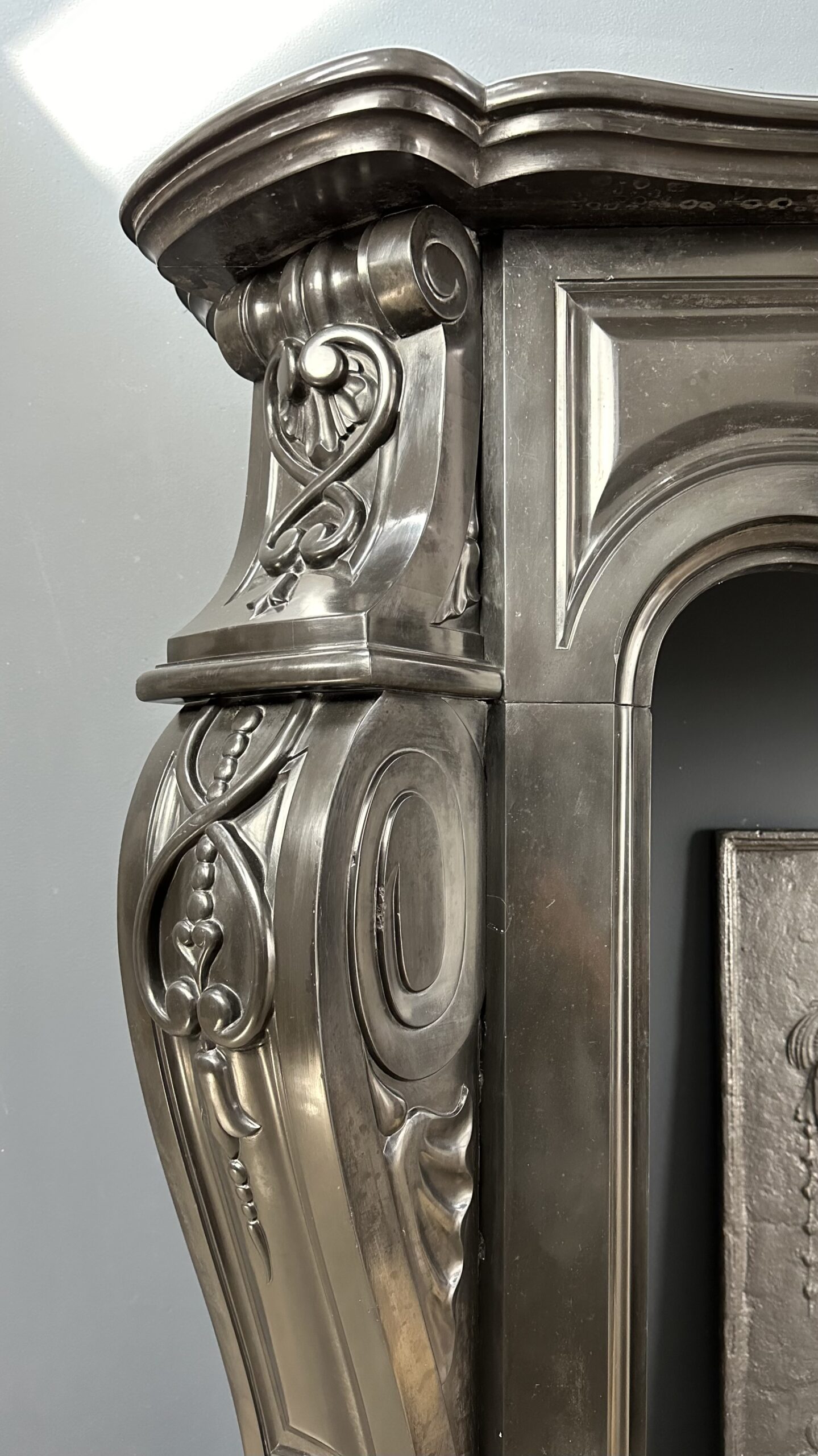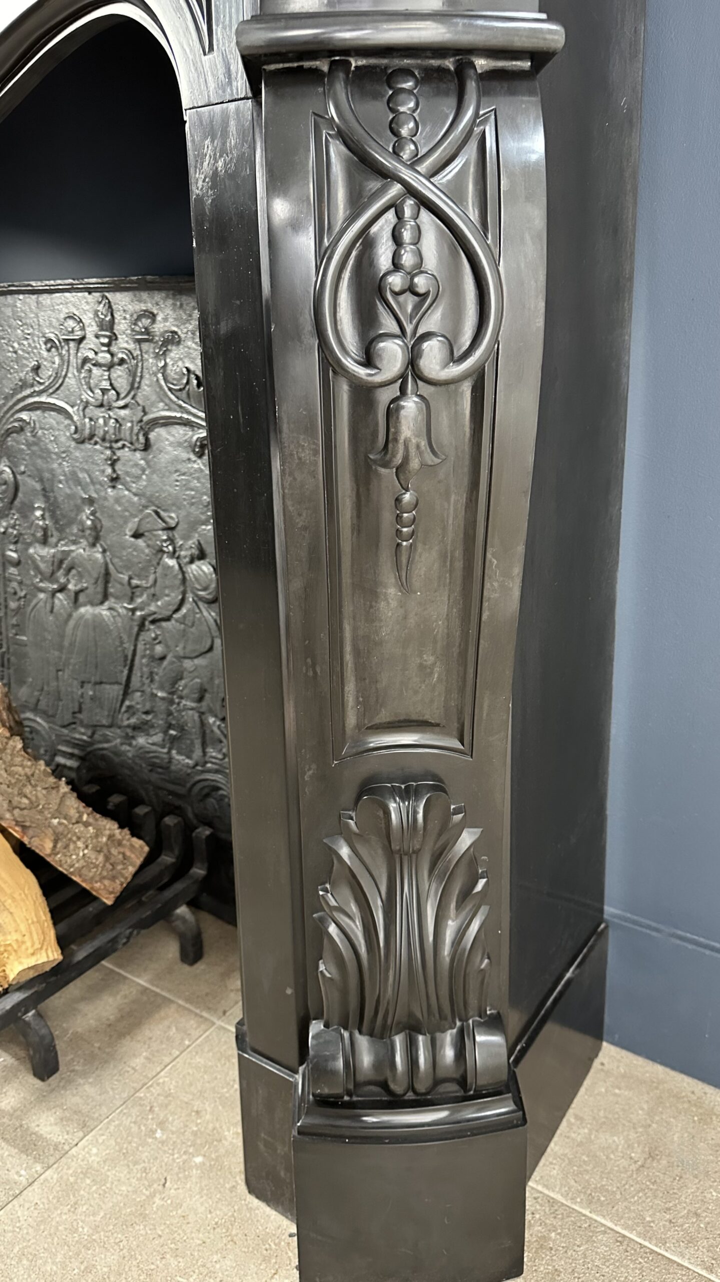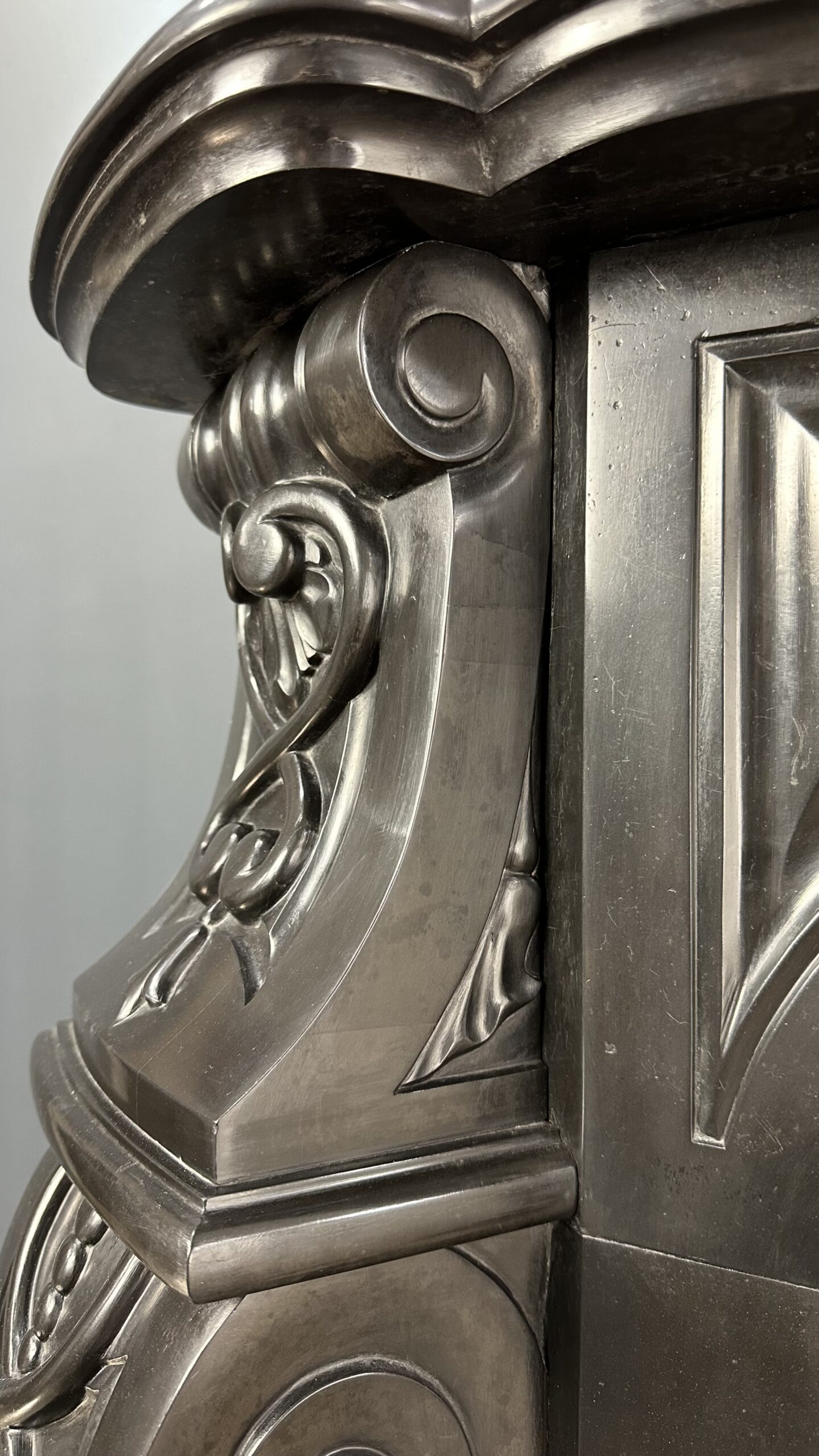 Gemaakt van het luxueuze Noir de Mazy marmer, getuigt dit meesterwerk van uitmuntend vakmanschap. De schouw is rijkelijk versierd met prachtige ornamenten en cannelures die de elegante benen sieren. Het dubbel geprofileerde bovenblad vormt de kroon op het werk, waardoor het geheel een onmiskenbaar karakter krijgt.